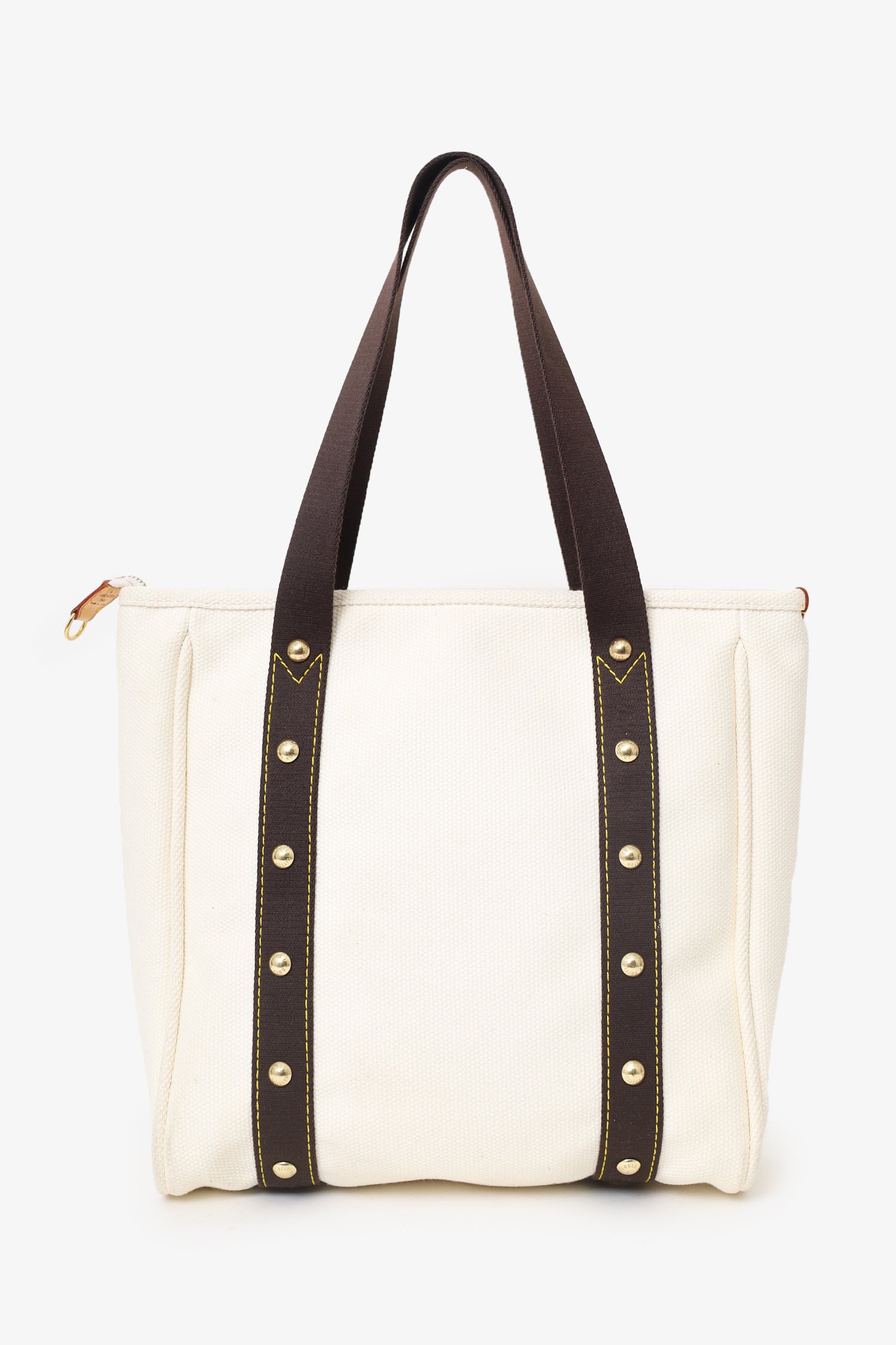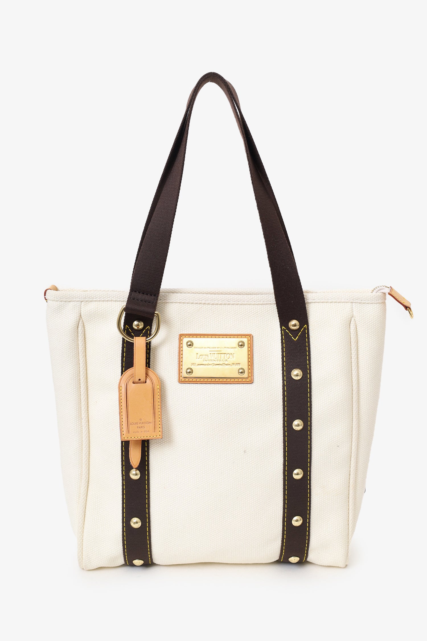 Refresh availabilityLouis Vuitton Beige/Brown Canvas Antigua Cabas PM Vintage Tote. Top zip closure. Twin top handles. Protective base studs. Fabric lined interior. Single rear interior slip pocket. Removable bag tag with buckle closure. Gold-tone hardware. Contrast and tonal stitching.