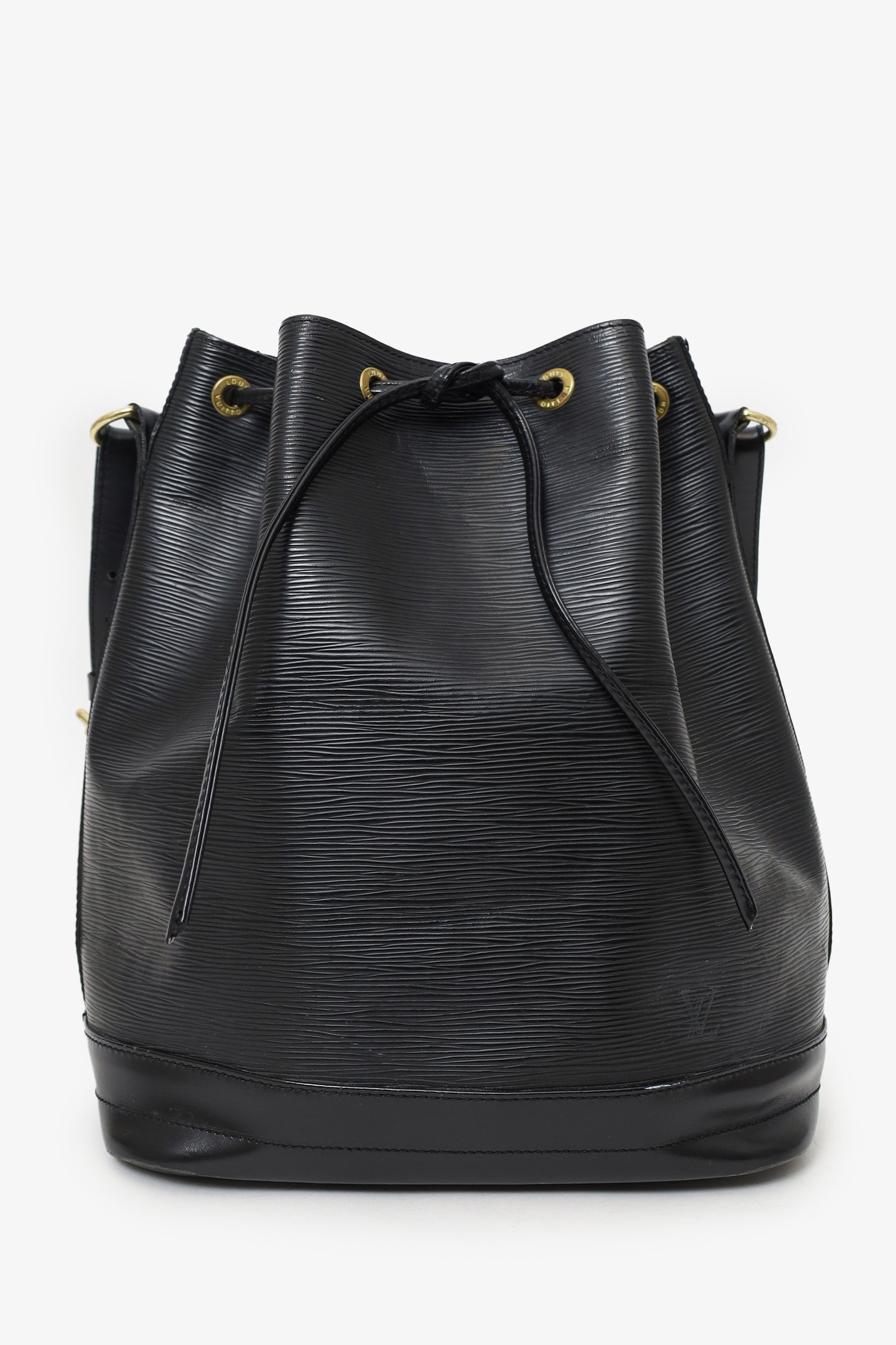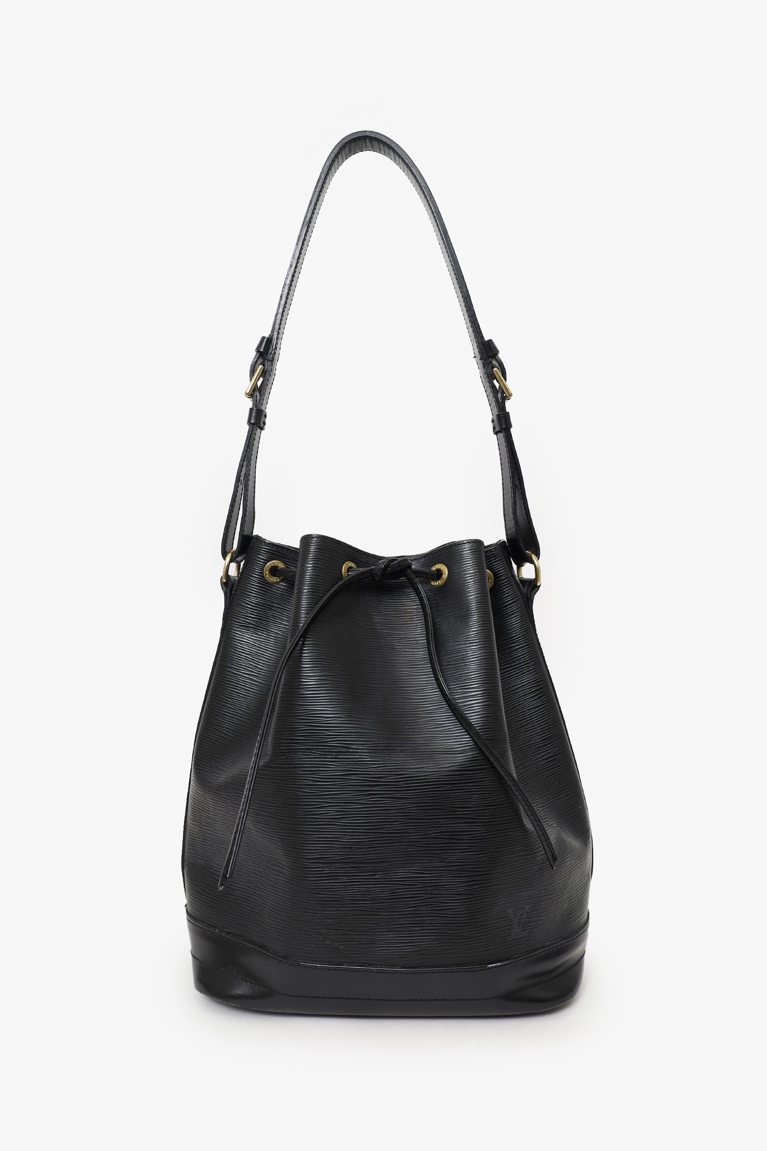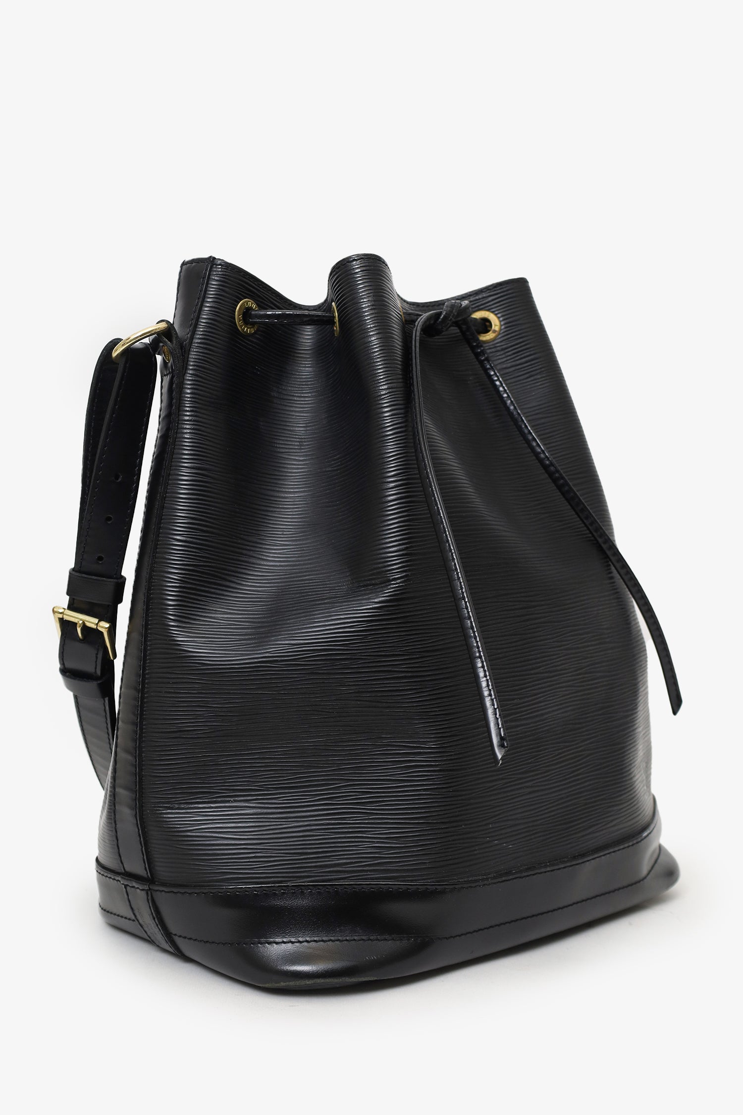 Refresh availabilityLouis Vuitton Black Black Epi Leather Petit Noe GM Bucket Bag. Top drawstring closure. Adjustable leather strap with buckle closure. Suede-lined open interior. Gold-tone hardware. Tonal stitching.