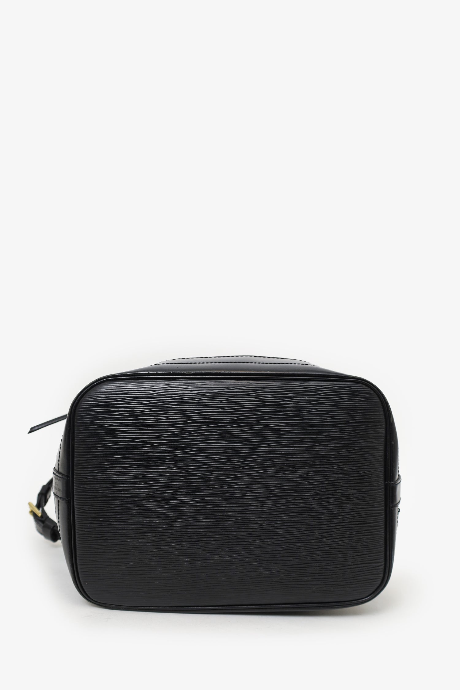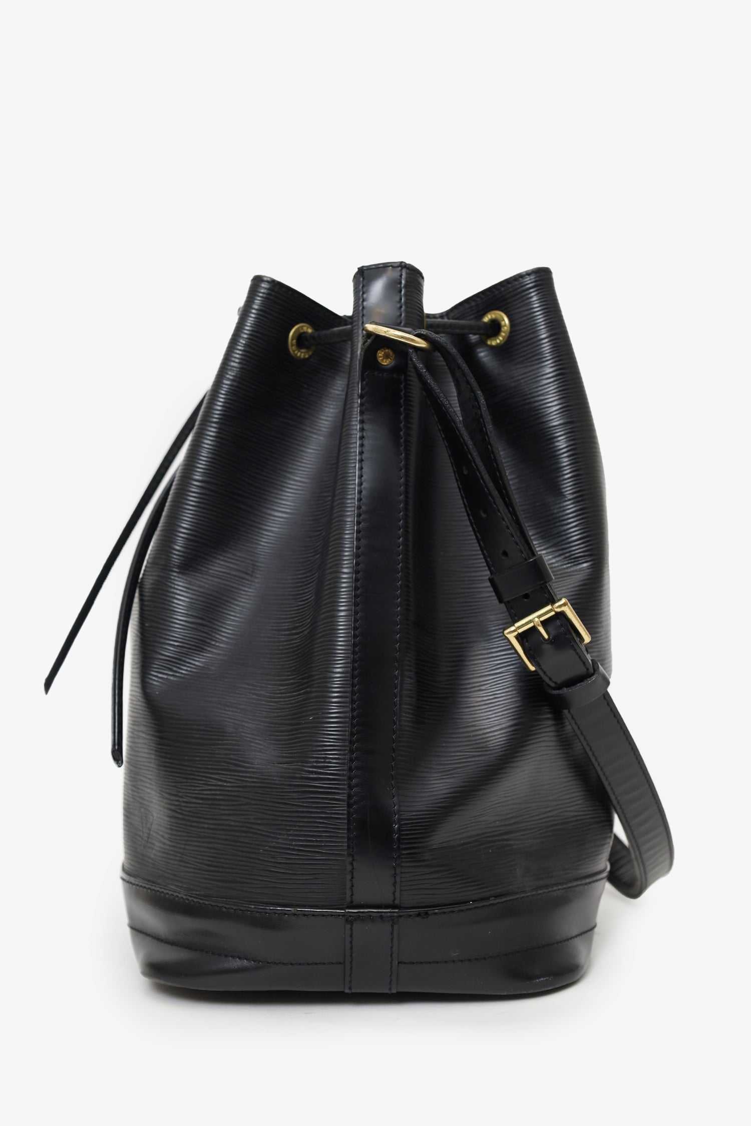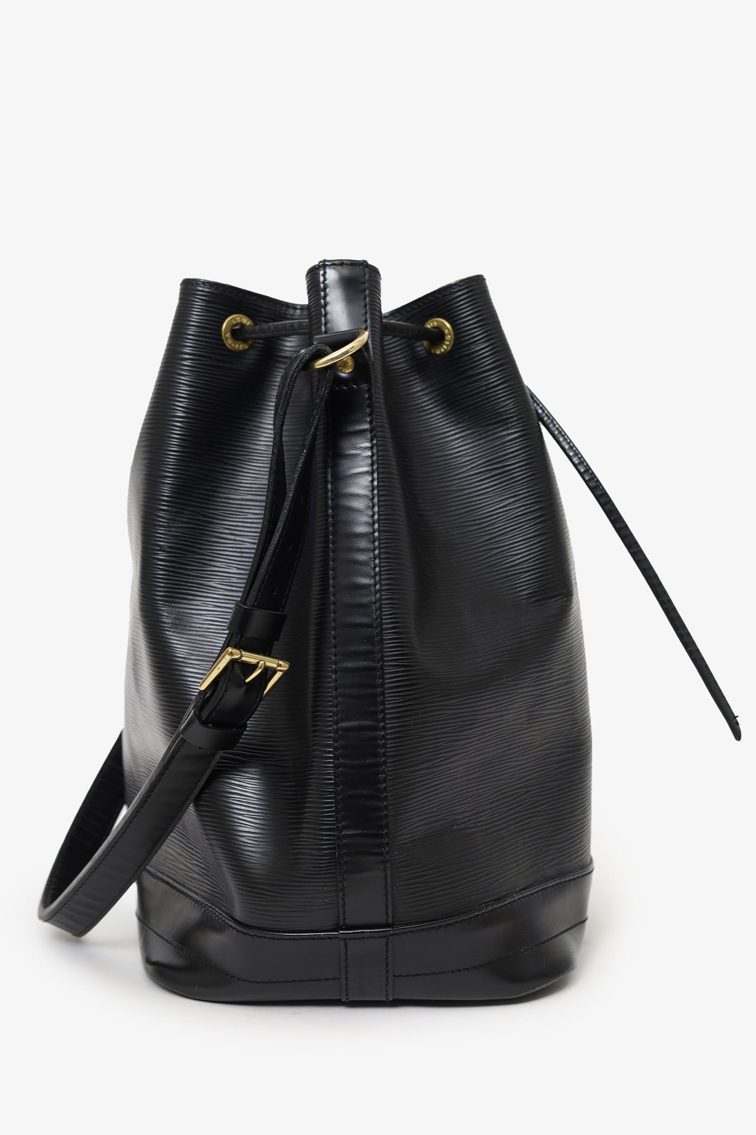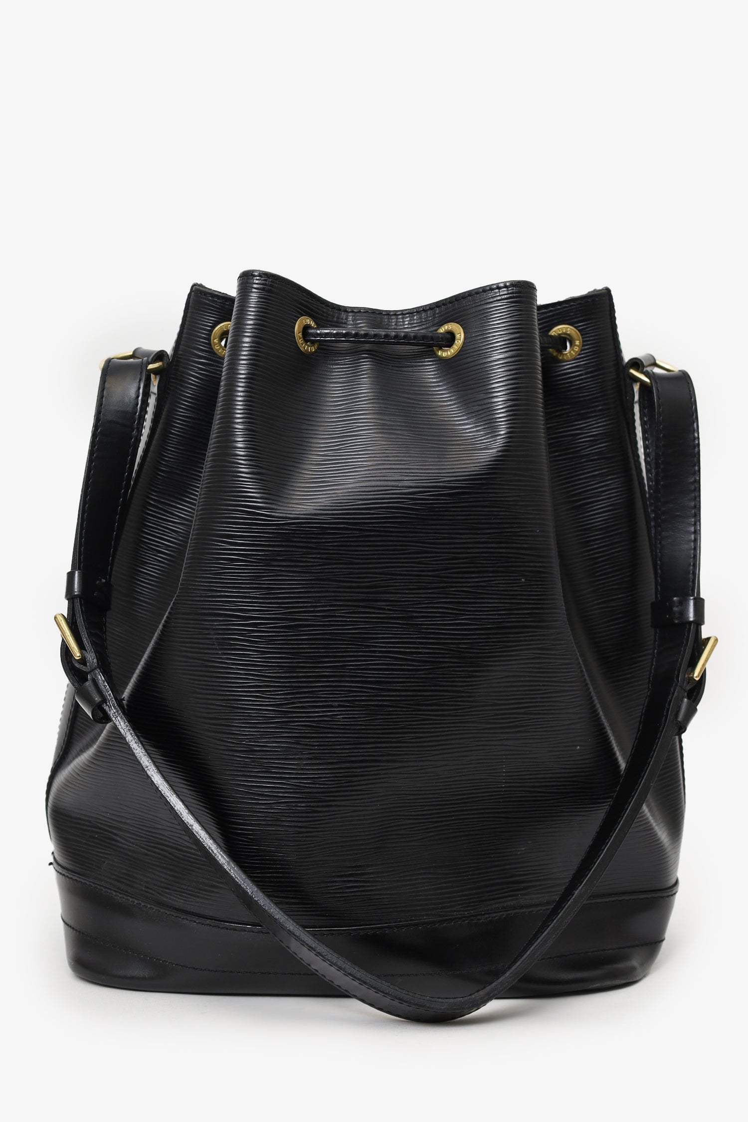 Refresh availabilityLouis Vuitton Black Black Epi Leather Petit Noe GM Bucket Bag. Top drawstring closure. Adjustable leather strap with buckle closure. Suede-lined open interior. Gold-tone hardware. Tonal stitching.