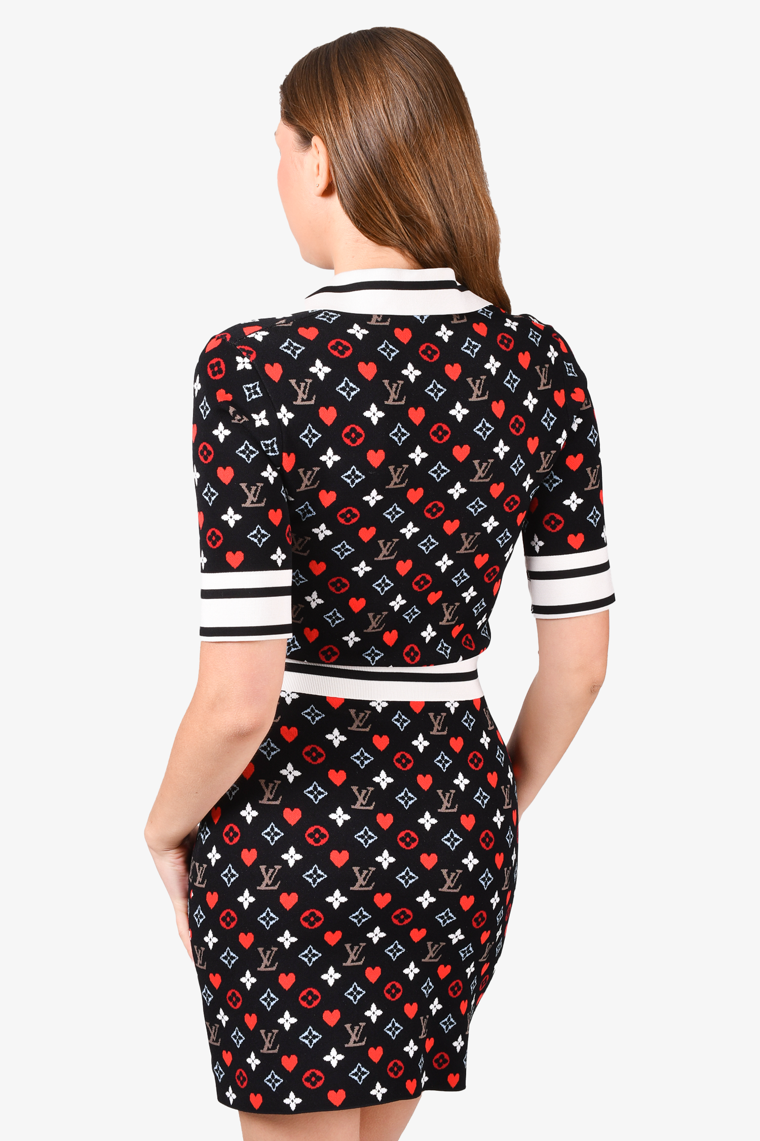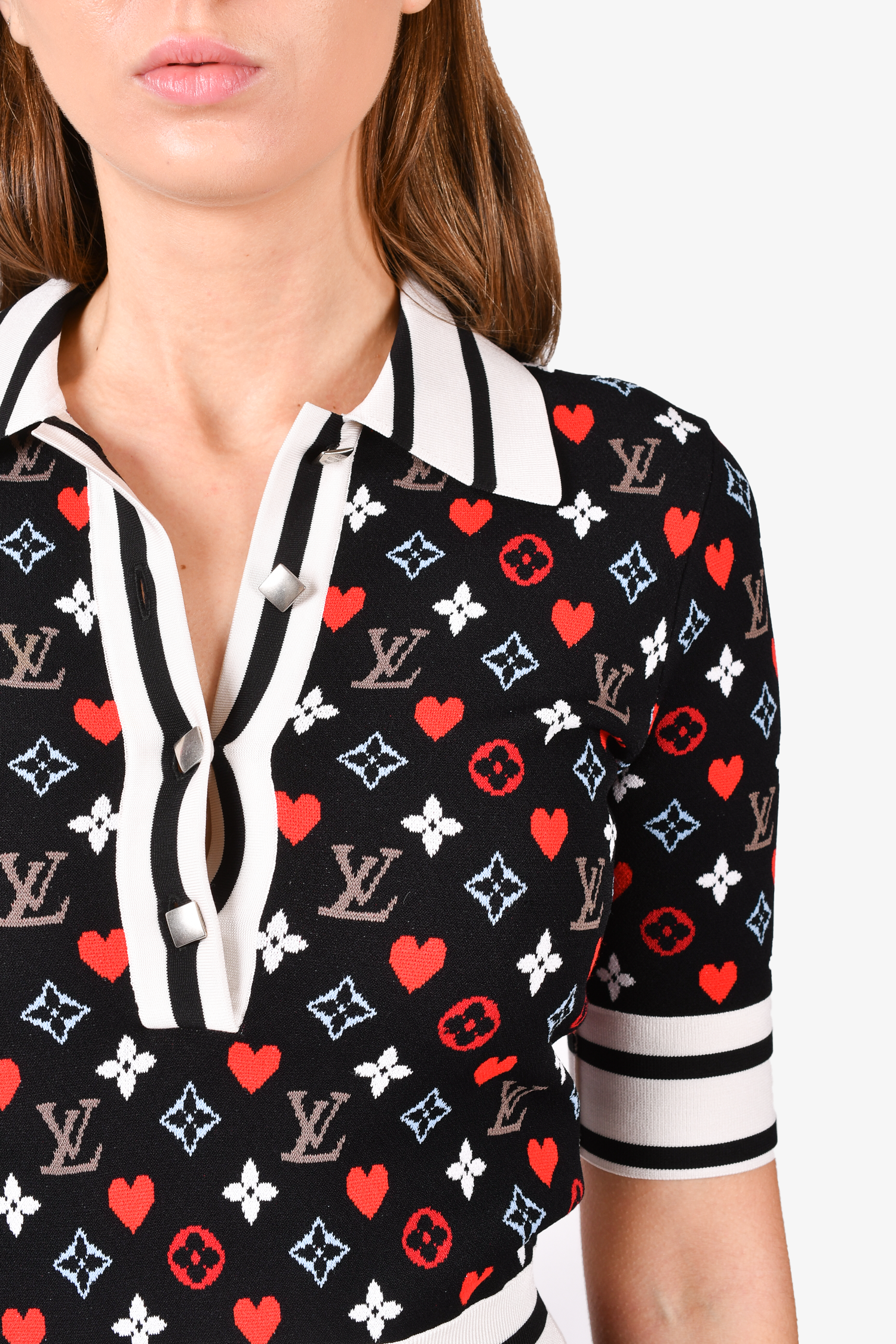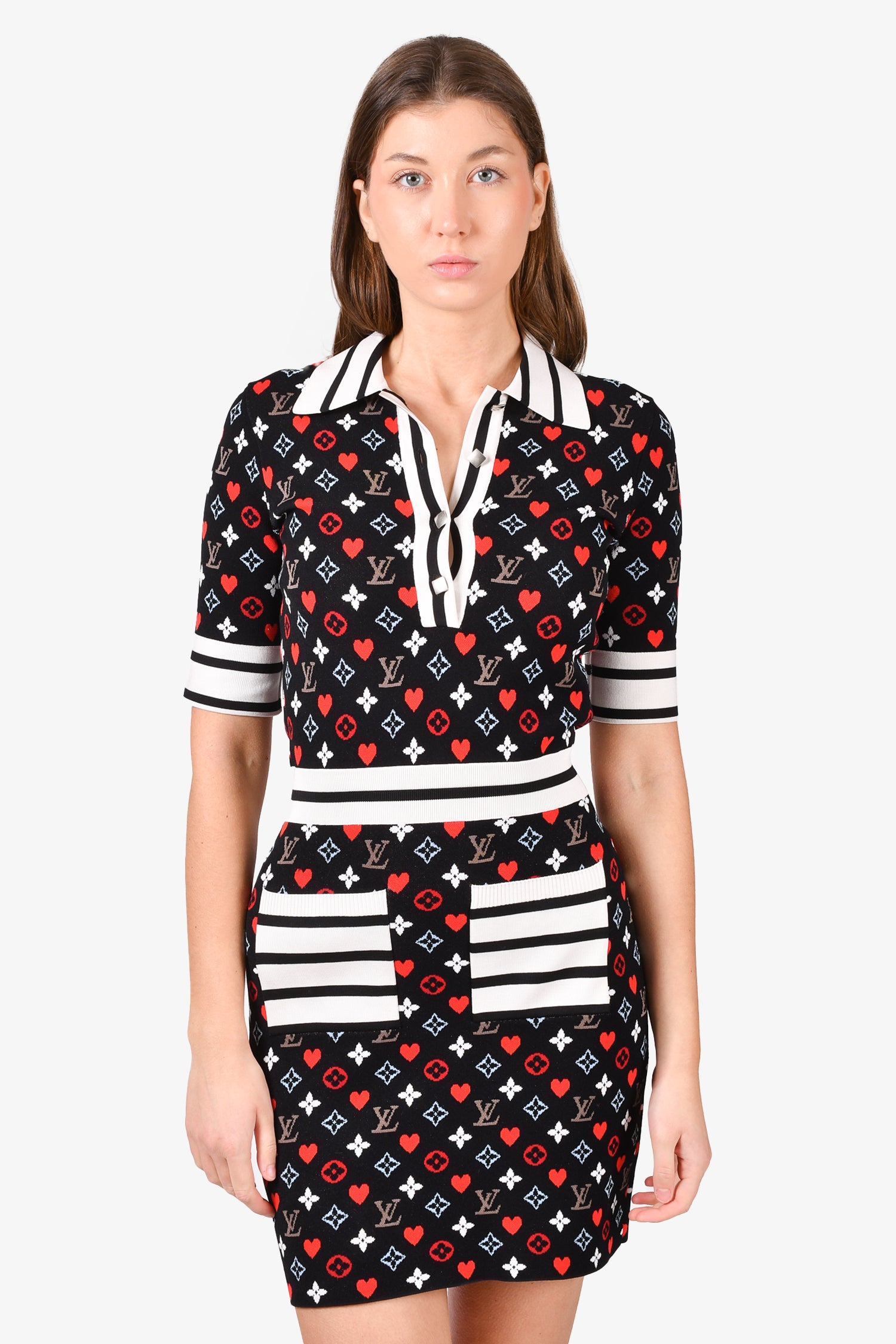 Refresh availabilityLouis Vuitton Black/Cream Multicoloured Monogram Knit Collared Dress. Pull-on. Front button-up closure. Front pockets. Unlined. Tonal stitching.