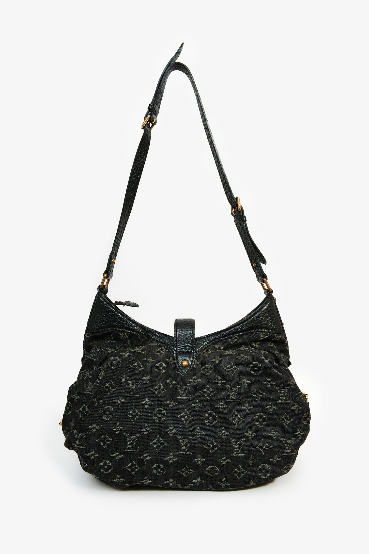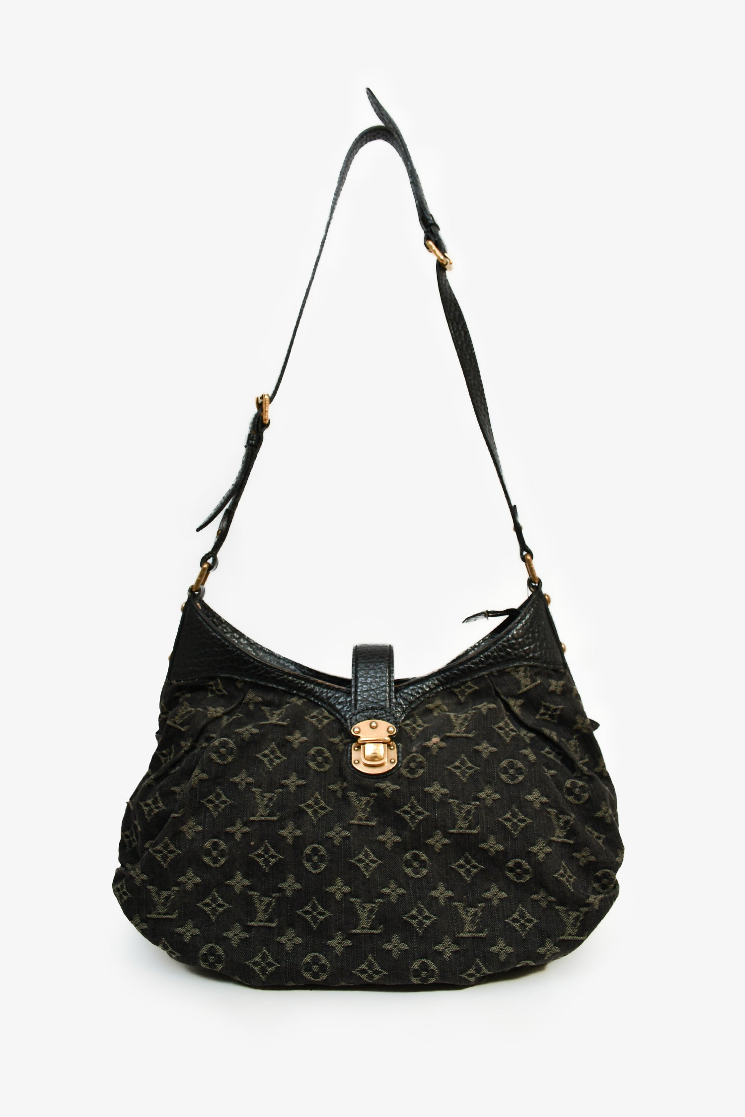Refresh availabilityLouis Vuitton Black Denim Light Wash Monogram Hobo Bag. Gold-tone hardware. Pull-through closure. Leather trim and shoulder strap. Monogramed denim. Lined suede interior with 2 pockets. Tonal stitching.