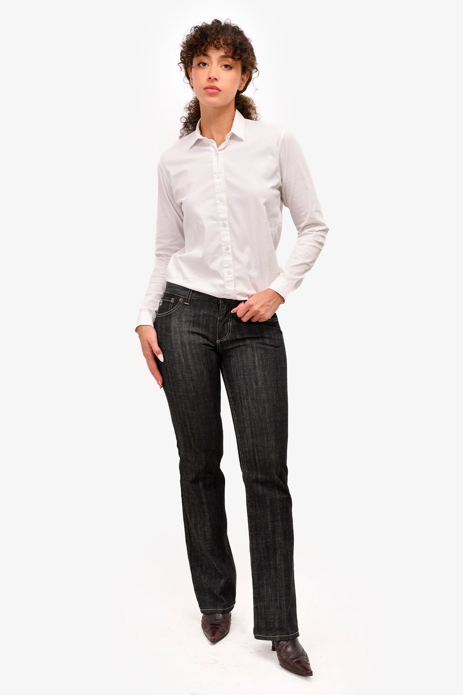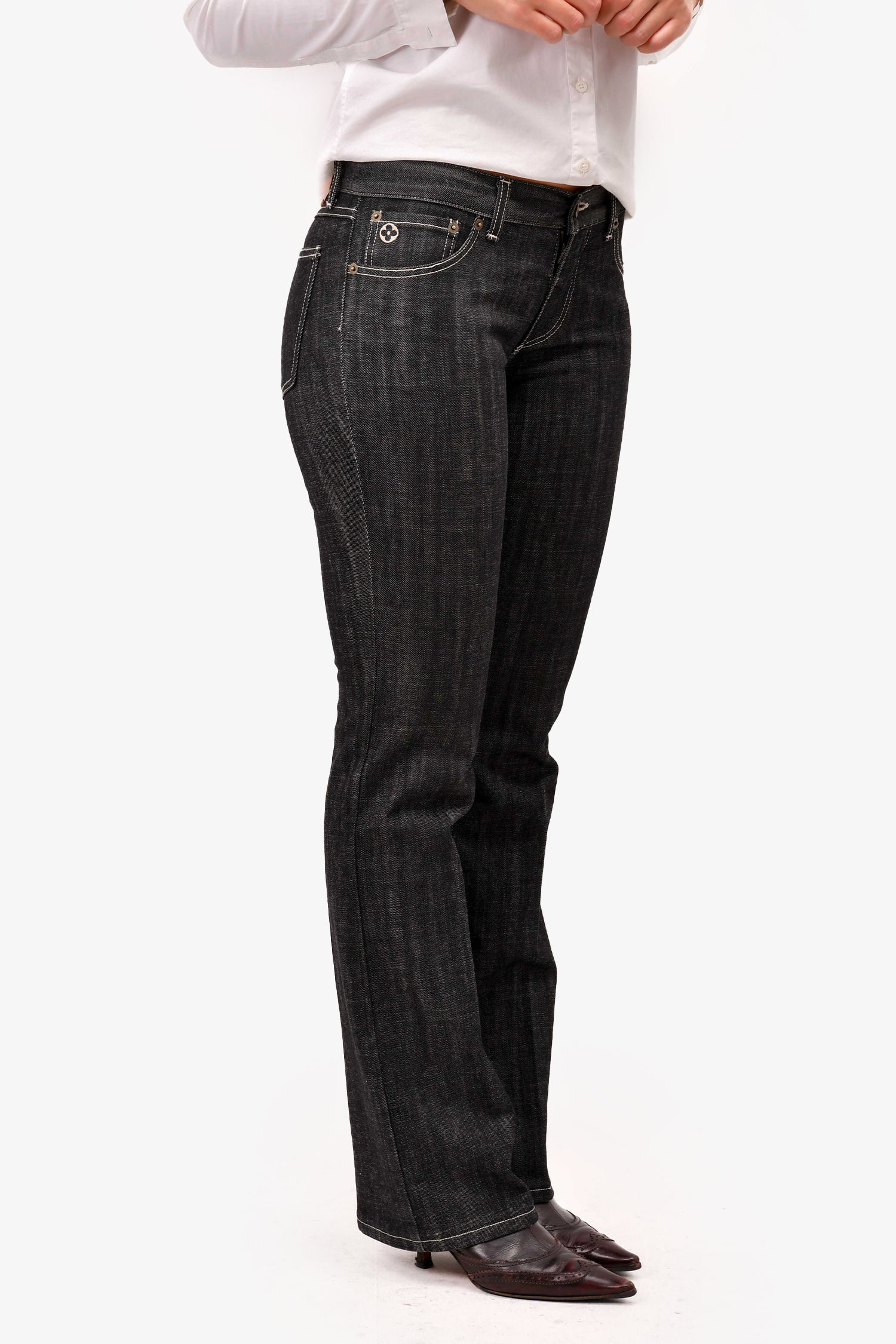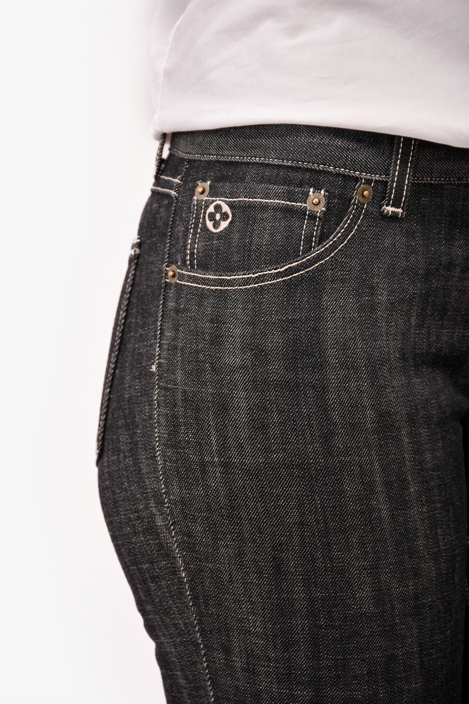 Refresh availabilityLouis Vuitton Black Denim Medium Wash Straight Leg Jeans. Contrast stitching. Zip-up with button closure. Brass-tone hardware.