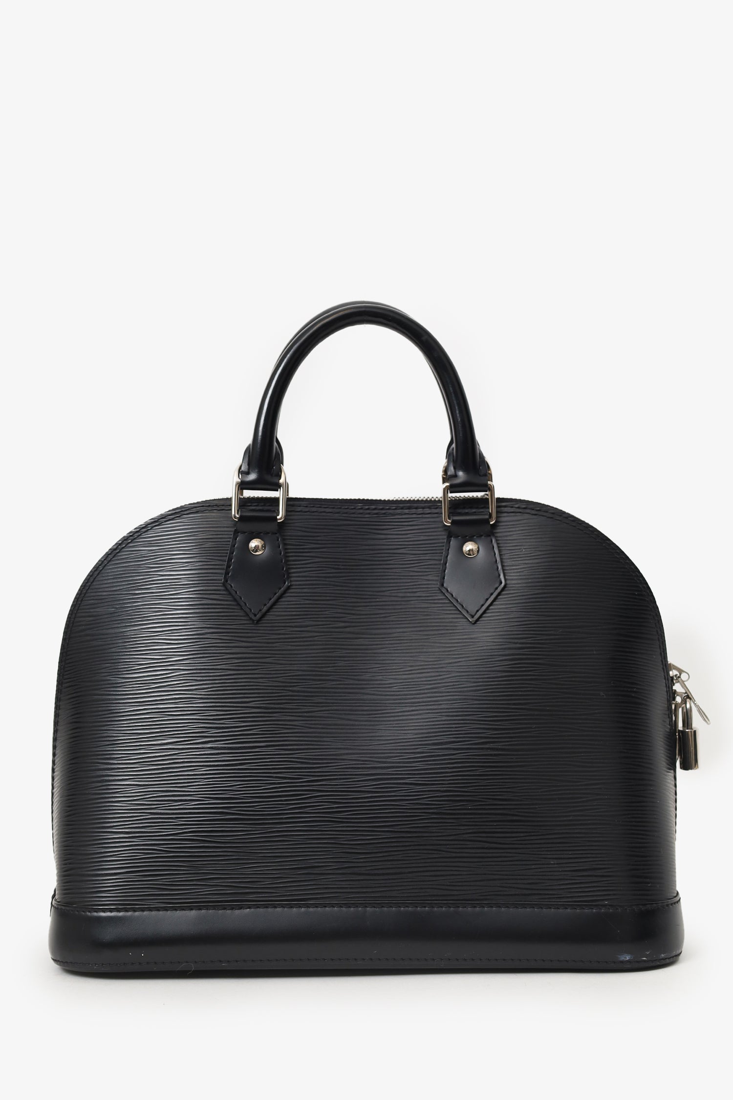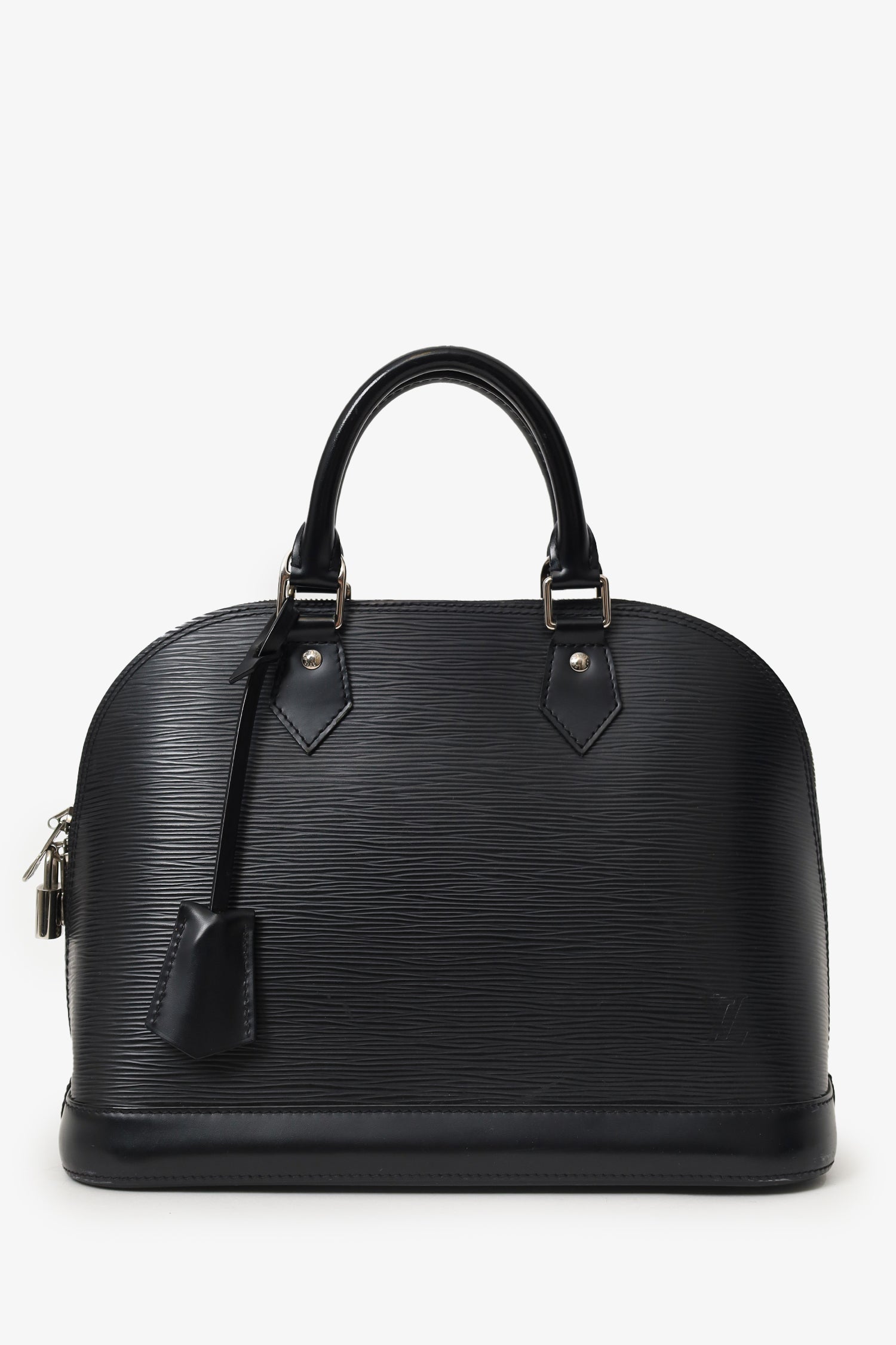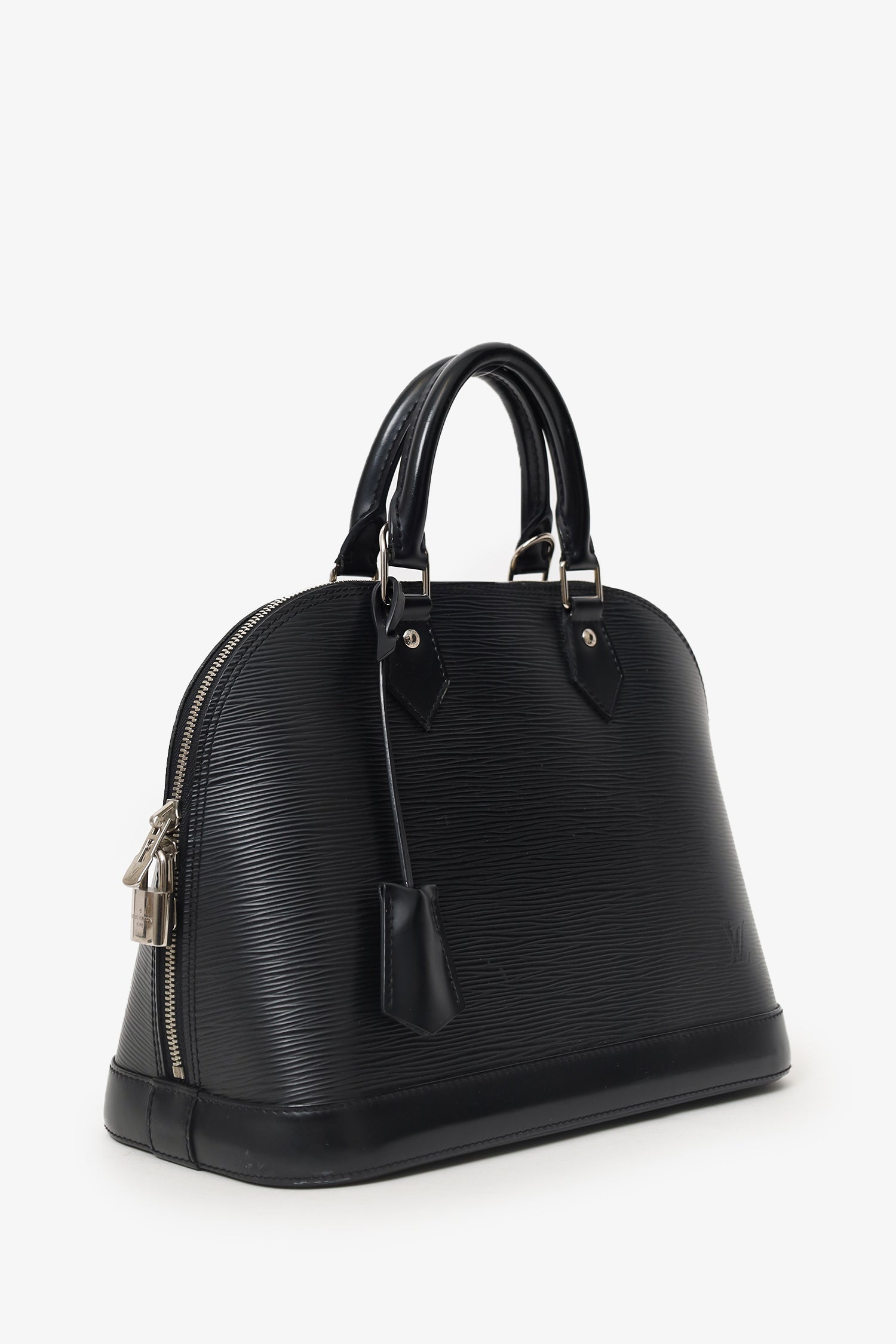 Refresh availabilityLouis Vuitton Black Epi Leather Alma PM Top Handle. Top zip closure. Top twin handles. Protective base studs. Suede-lined interior. 2 interior slip pockets. Silver-tone hardware. Tonal stitching. Inclusions: Clochette with lock and key.