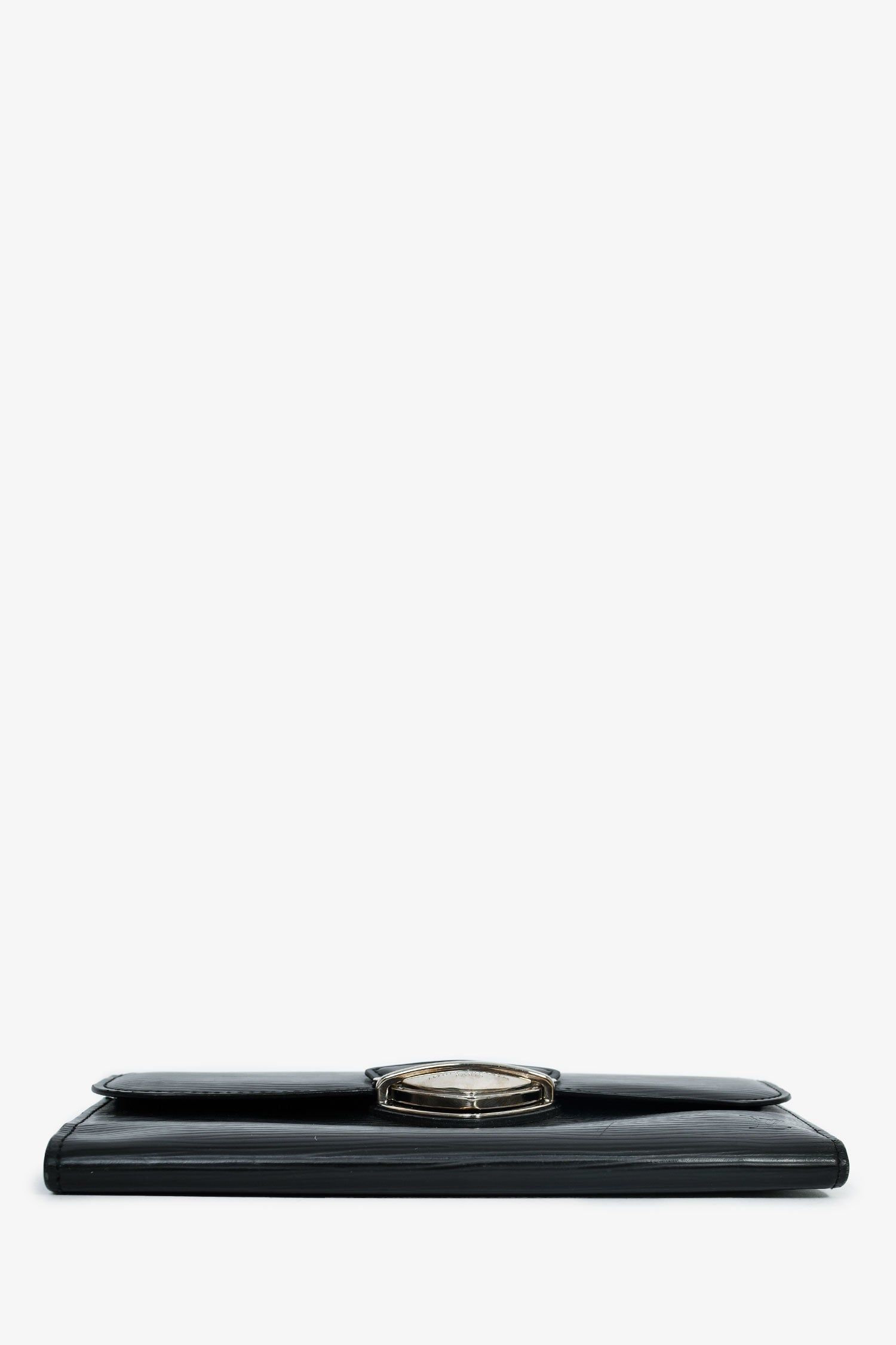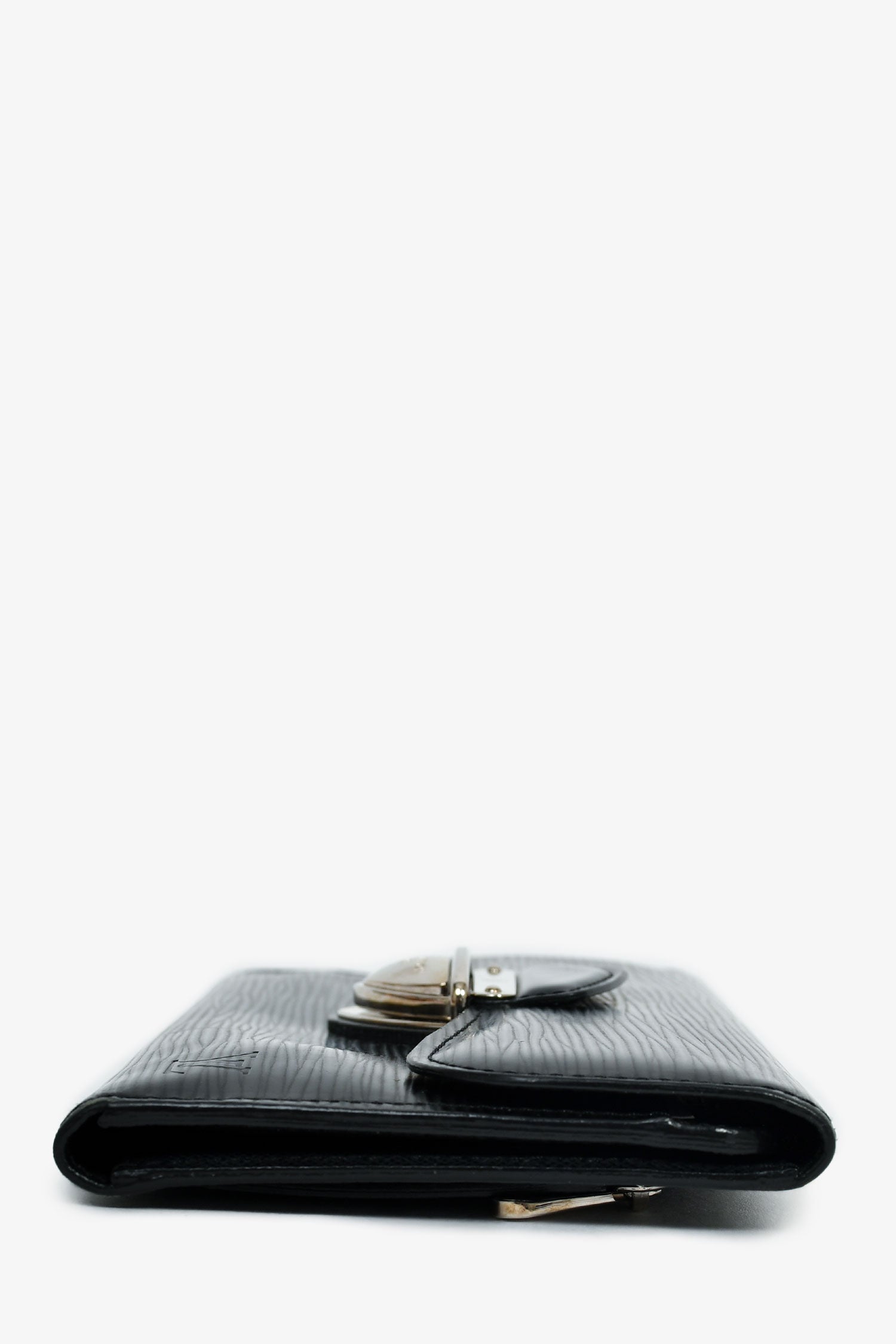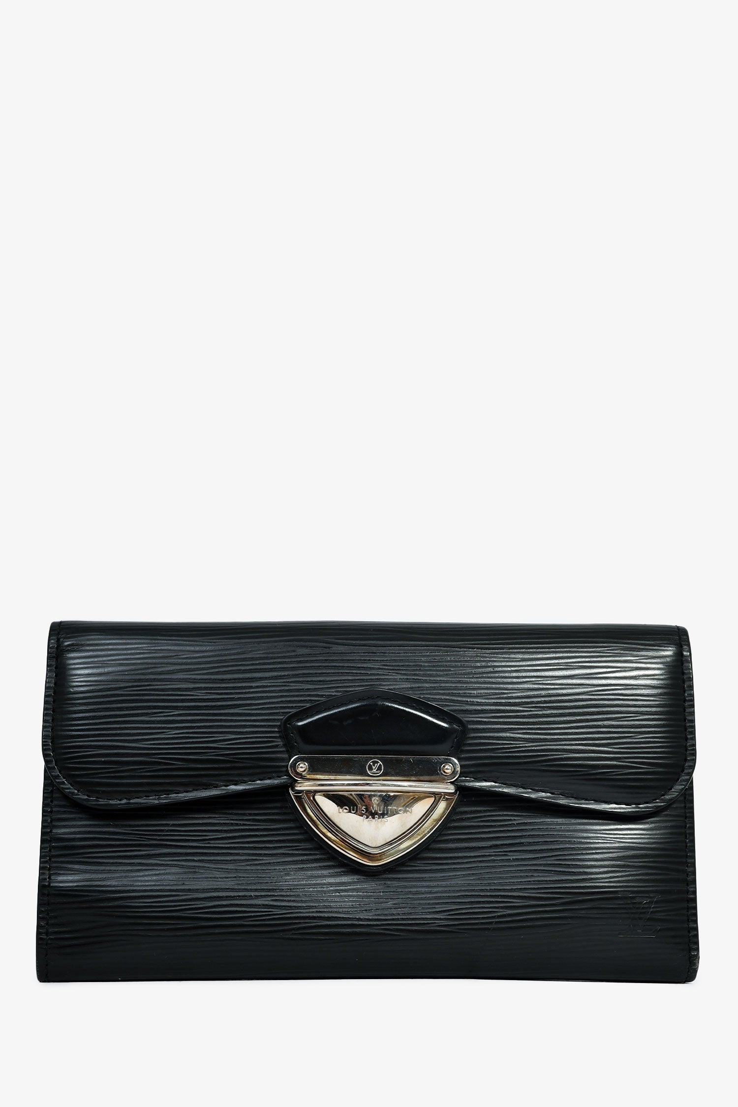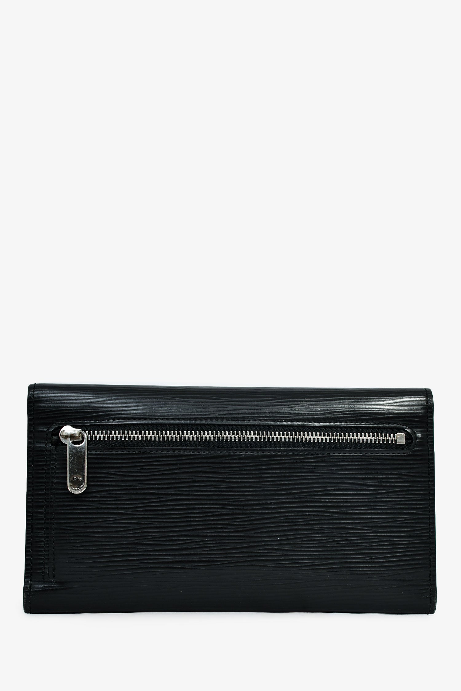 Refresh availabilityLouis Vuitton Black Epi Leather Long Wallet. Fold-over flap with a push-lock closure. Epi leather. Silver-tone hardware. 15 card slots. 2 bill compartments. Tonal stitching.