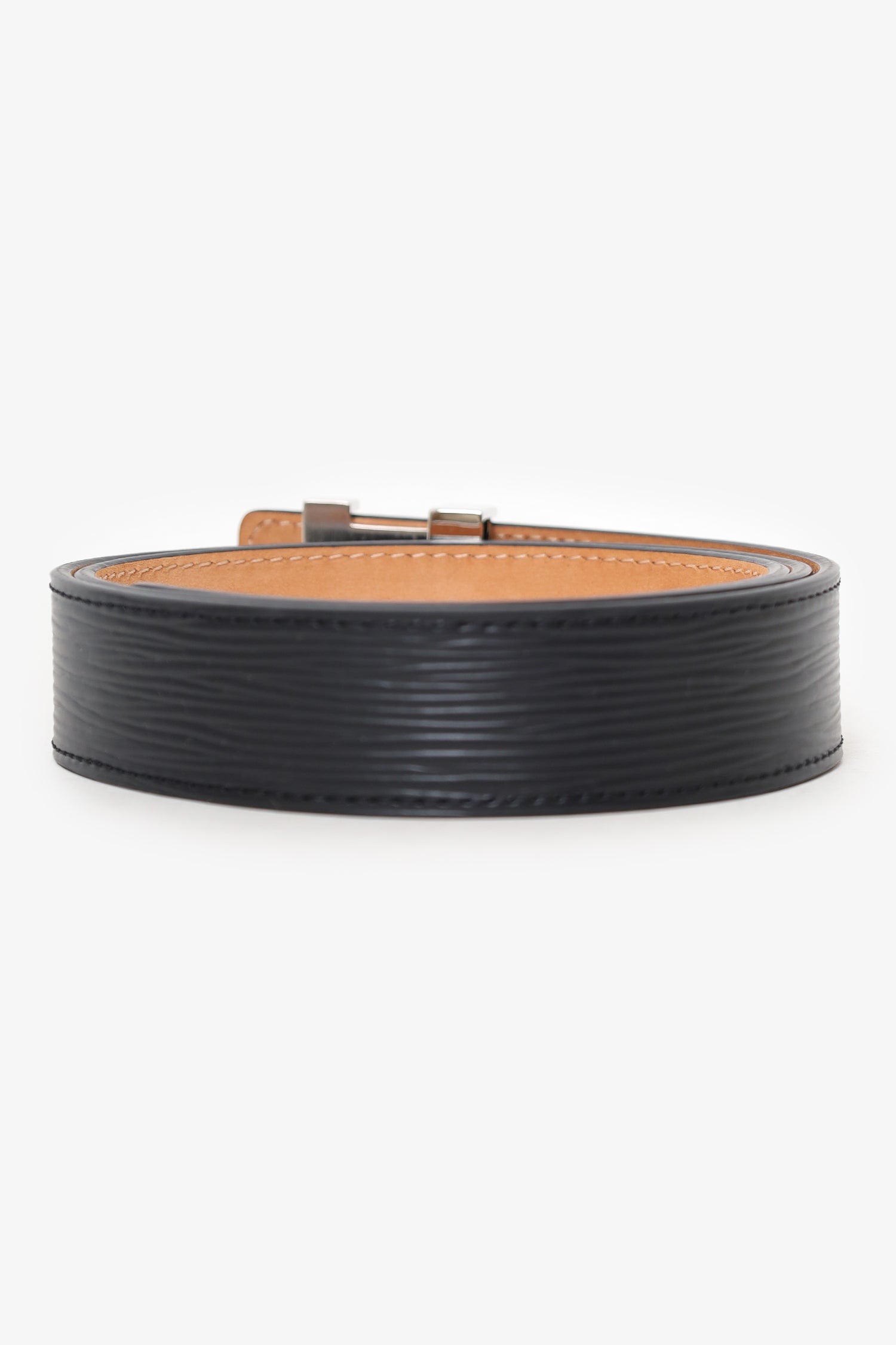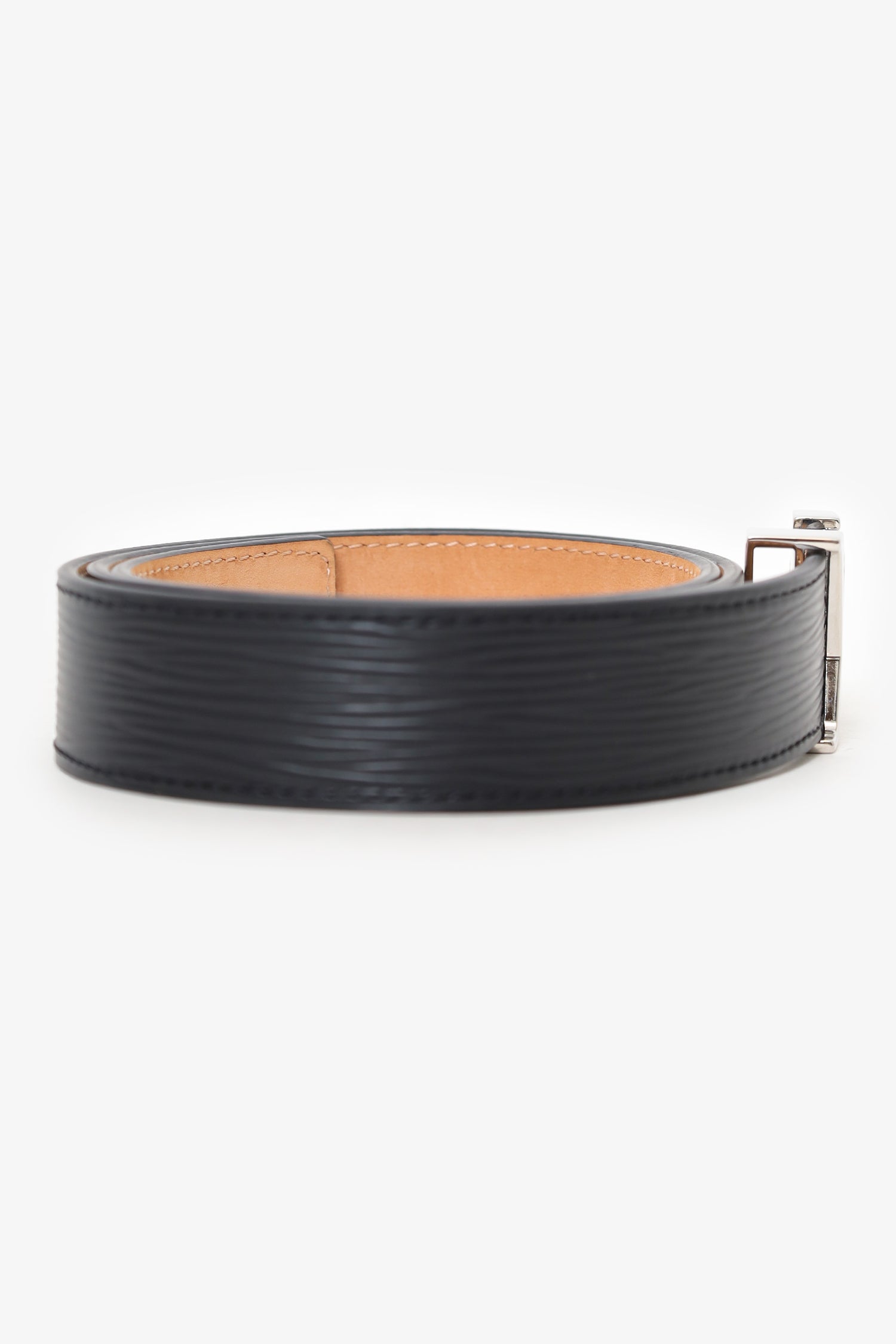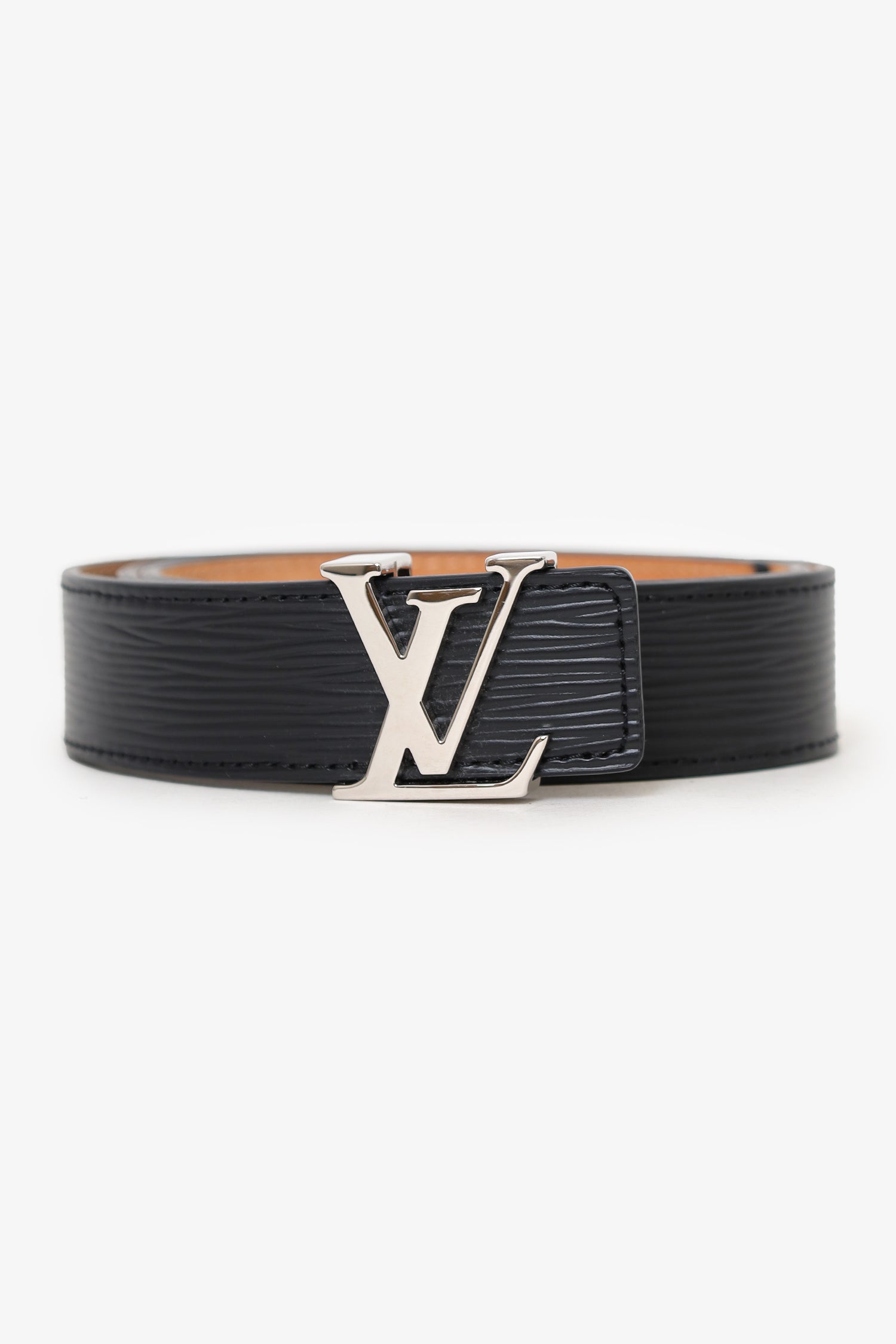 Refresh availabilityLouis Vuitton Black Epi Leather LV Initiales Belt Size 32/80. Adjustable push-pin buckle closure. Tonal stitching. Silver-tone hardware.