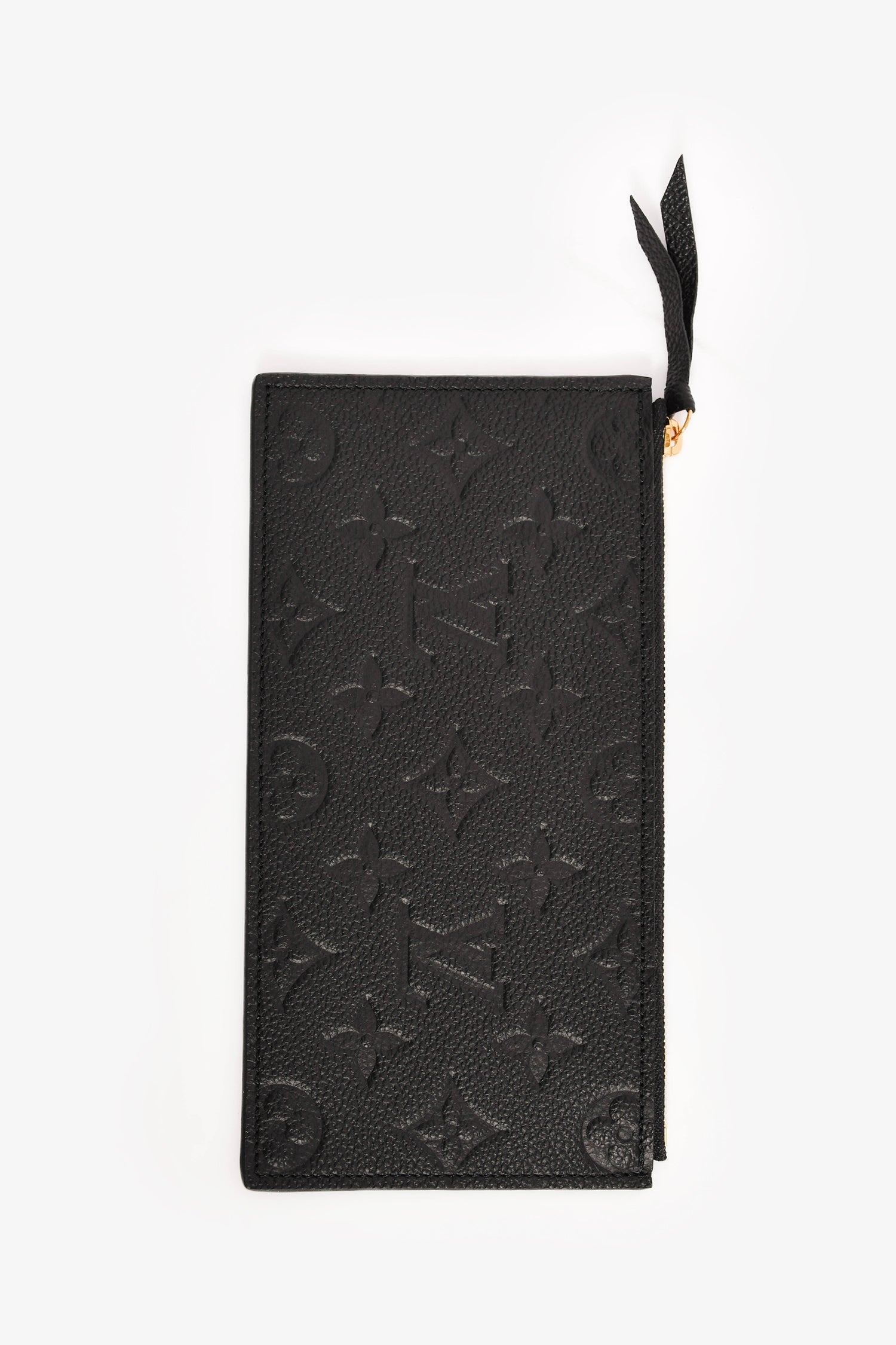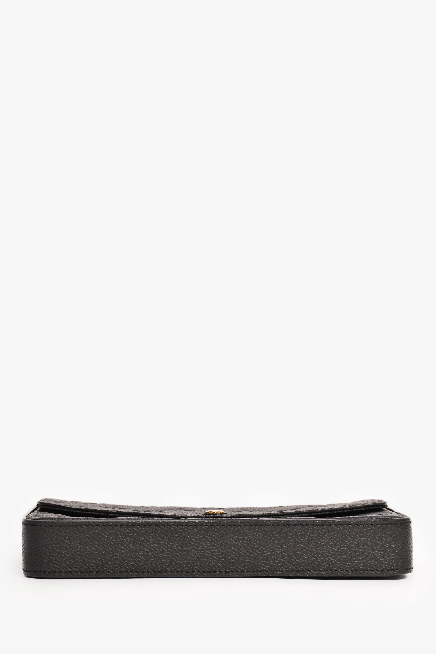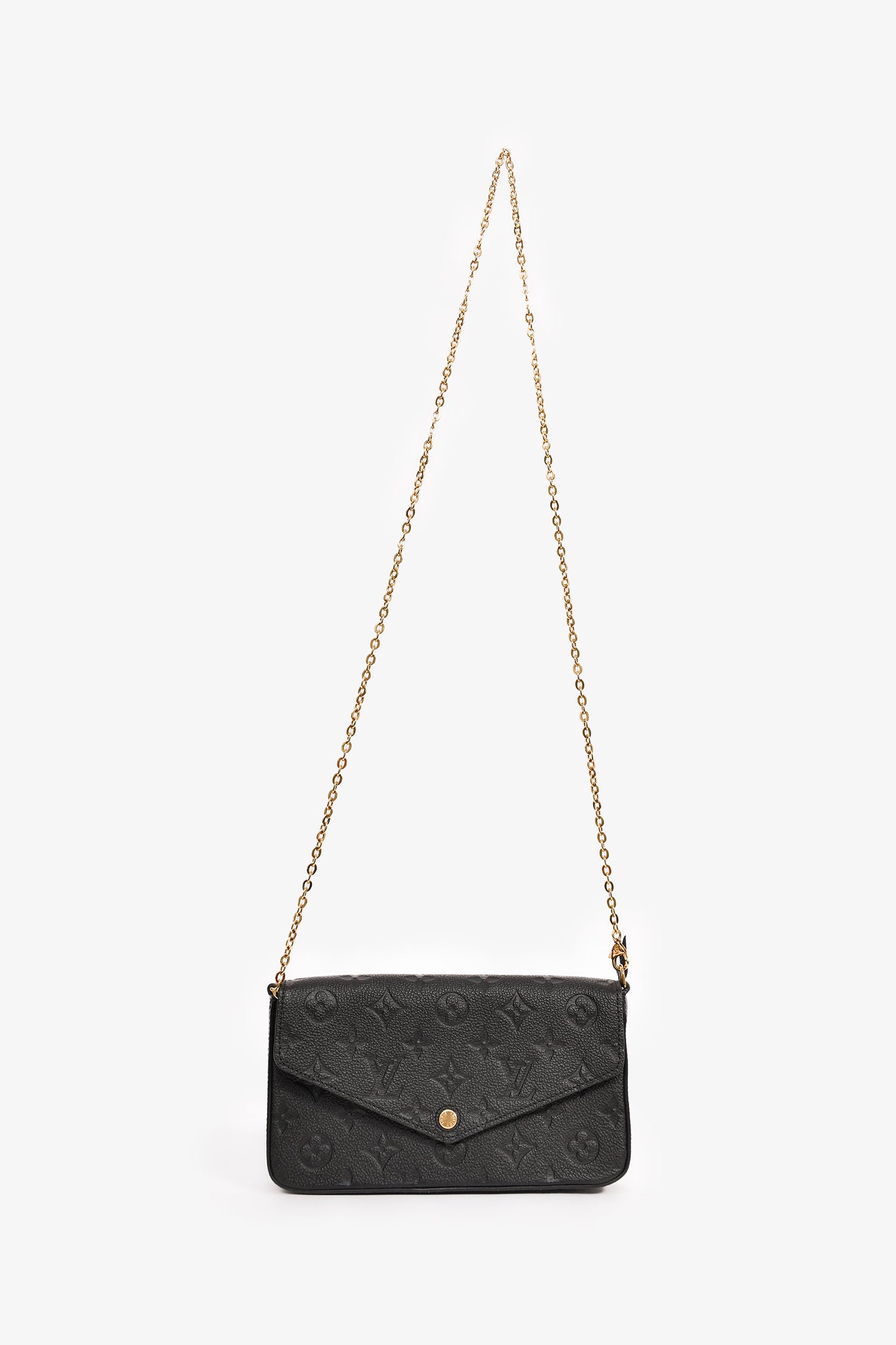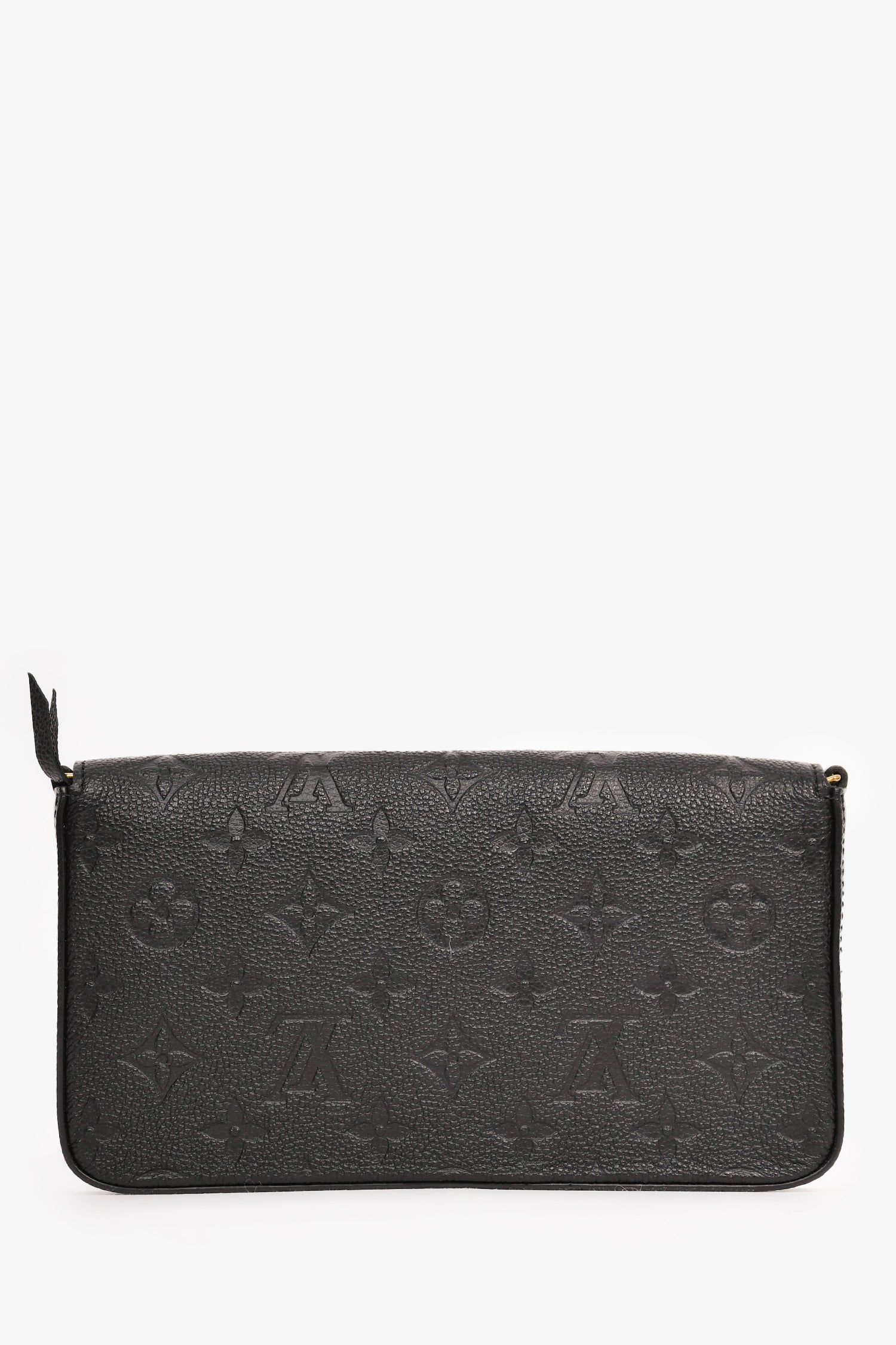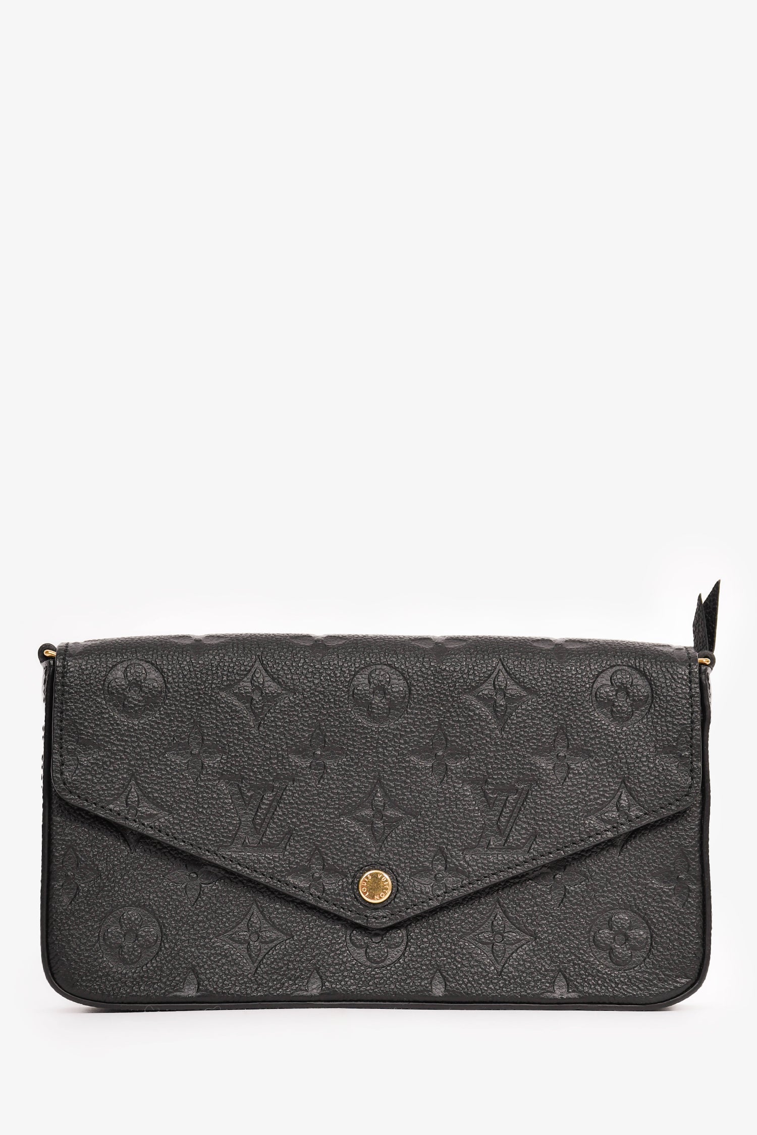Refresh availabilityLouis Vuitton Black Leather Empreinte 'Felicie' Pochette with Insert. Front fold-over flap with snap-button closure. Tonal textile interior lining. Single interior wall slip pocket. Two removable inserts; one with top zip closure and one with eight card slots and one main compartment. Detachable chain strap. Gold-tone hardware.
