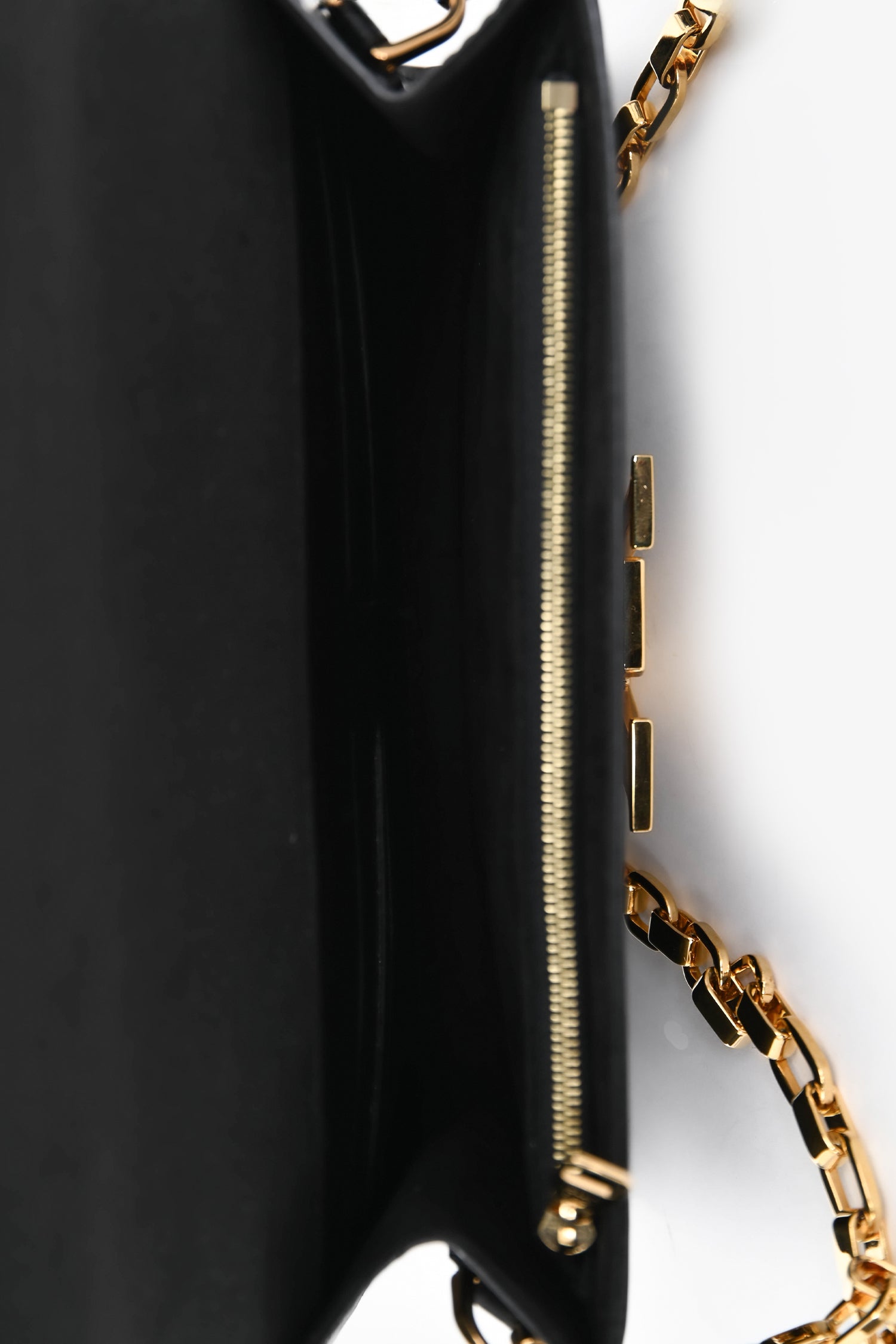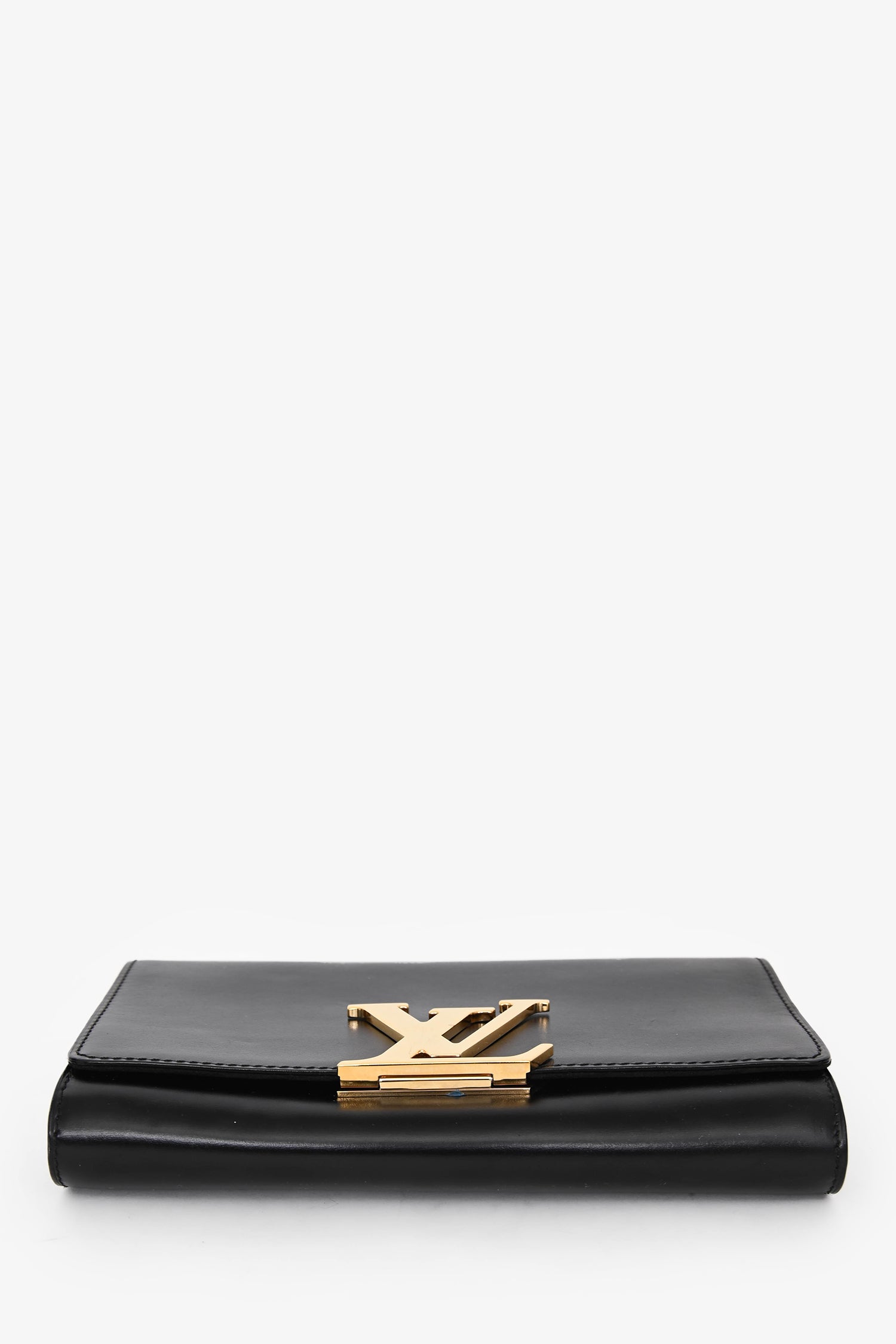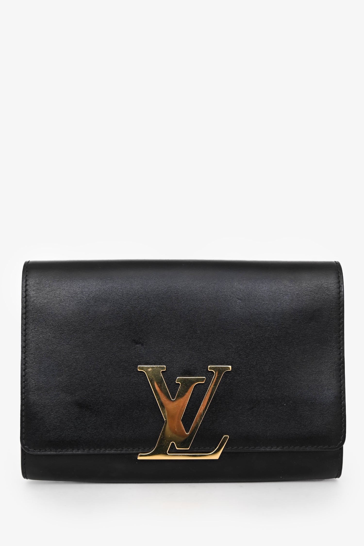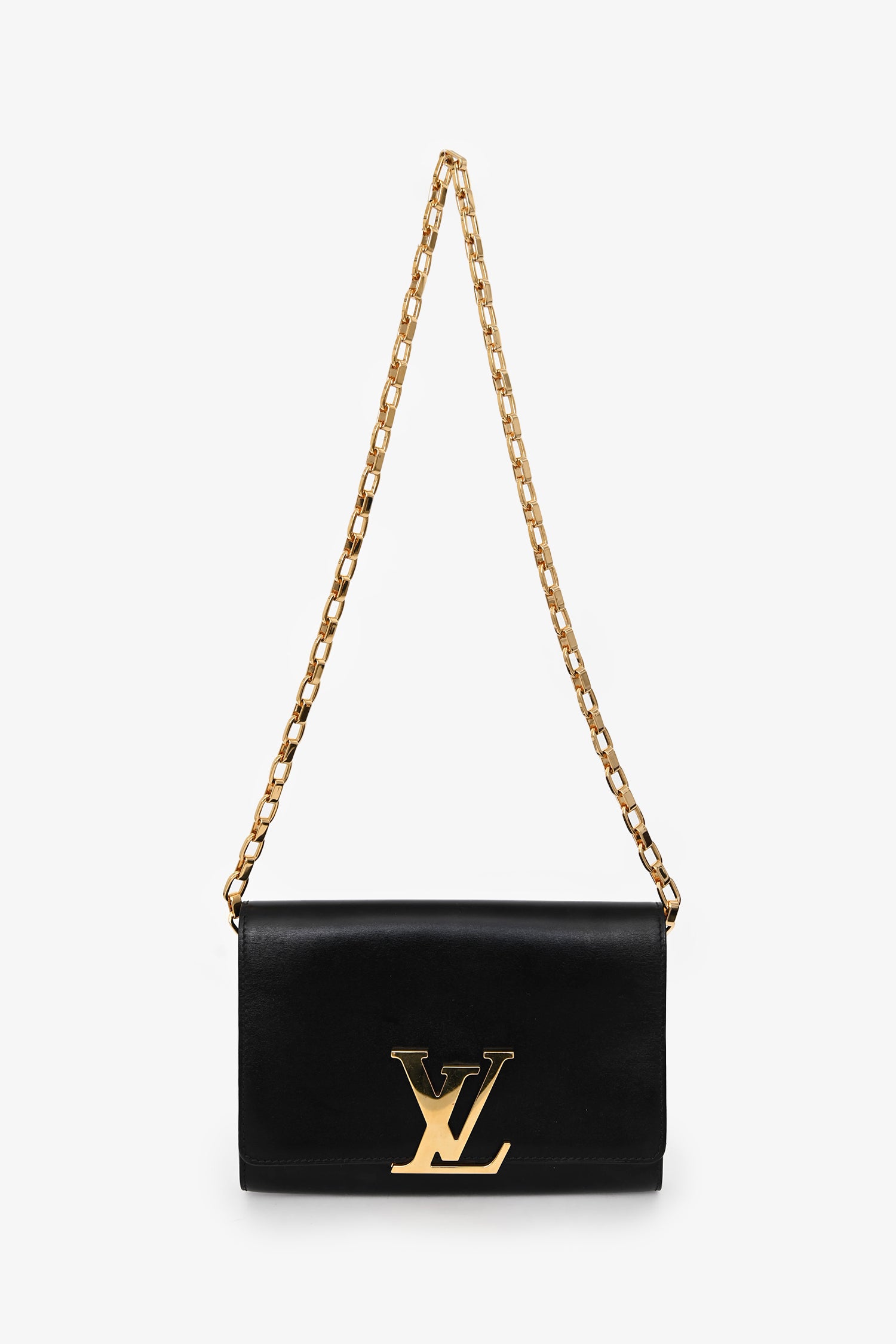 Refresh availabilityLouis Vuitton Black Leather Louise Wallet On Chain. Fold-over flap with a logo closure. Chain-link strap. 2 interior compartments, 1 zip, 6 card slots. Gold-tone hardware. Tonal stitching.