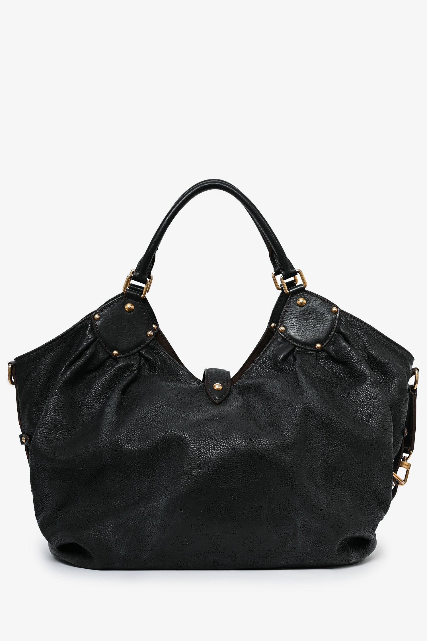 Refresh availabilityLouis Vuitton Black Leather 'Mahina' Hobo Bag. Rolled top handles. Front fold-over strap with push-clasp closure. Lined interior. Single zip pocket. Tonal stitching. Gold-tone hardware.
