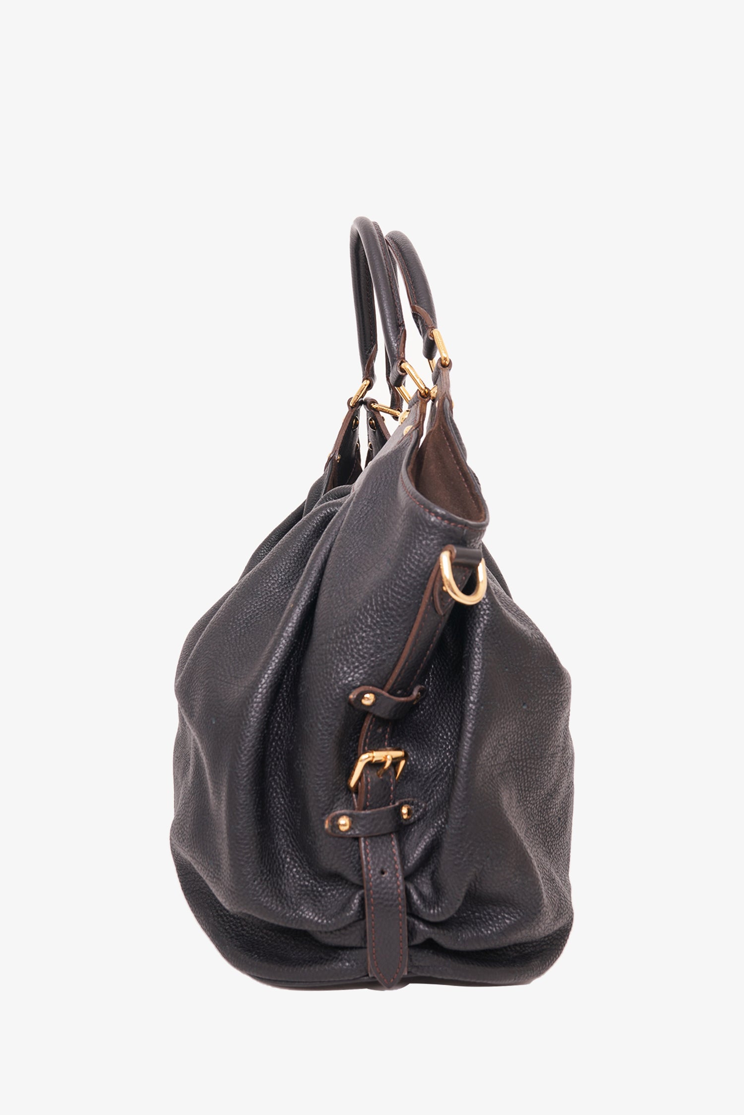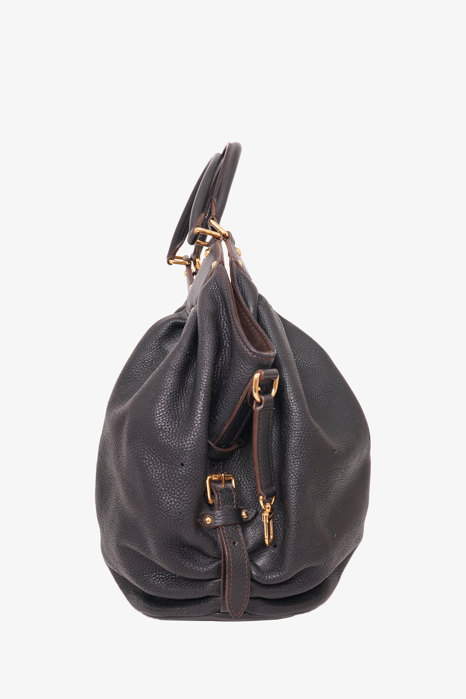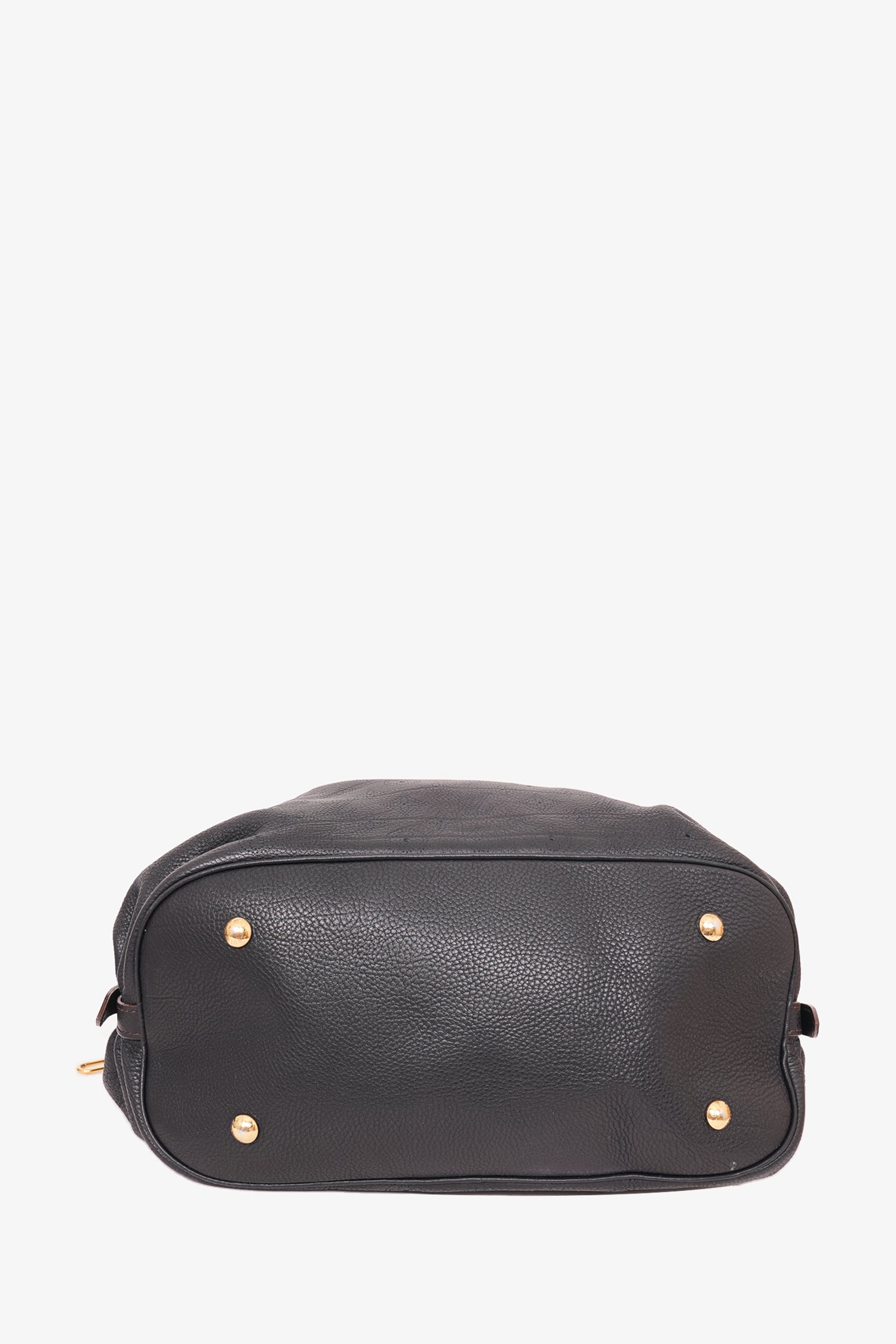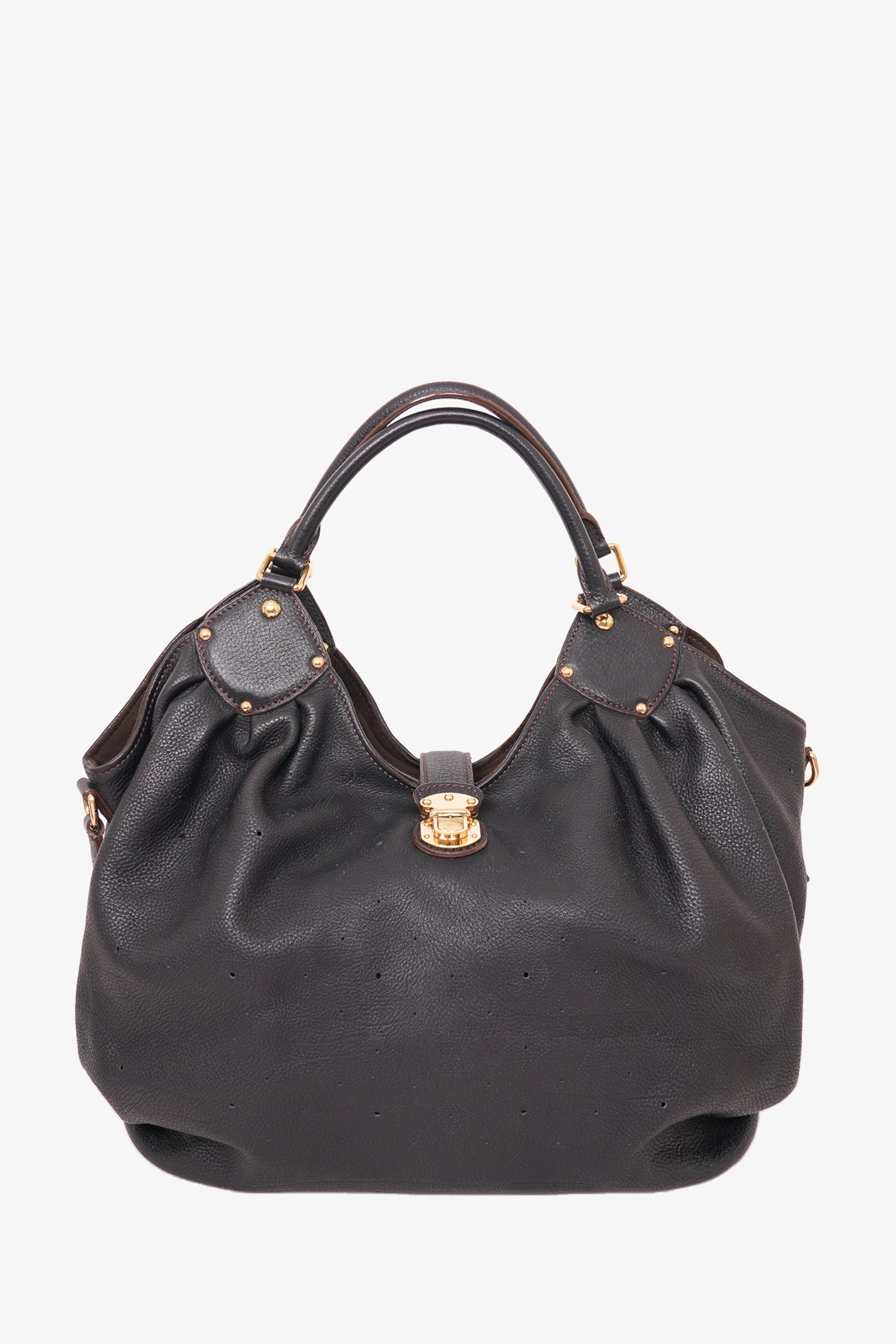 Refresh availabilityLouis Vuitton Black Leather Monogram Mahina Shoulder Bag. Dual rolled handles. Front foldover flap with push-lock closure. Brown textile interior lining. 1 interior pocket with zip closure. Gold-tone hardware. Protective metal bottom. Tonal stitching.