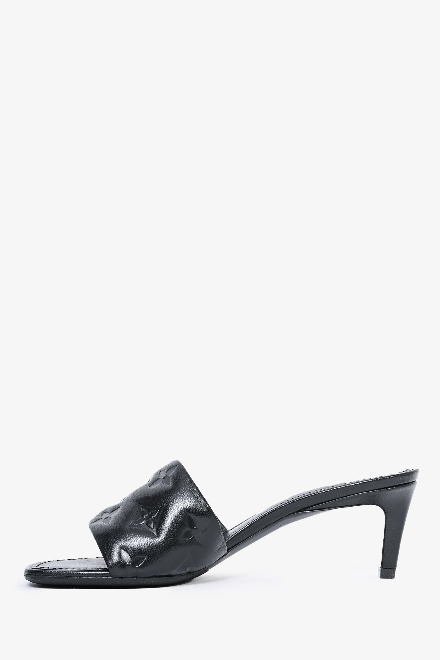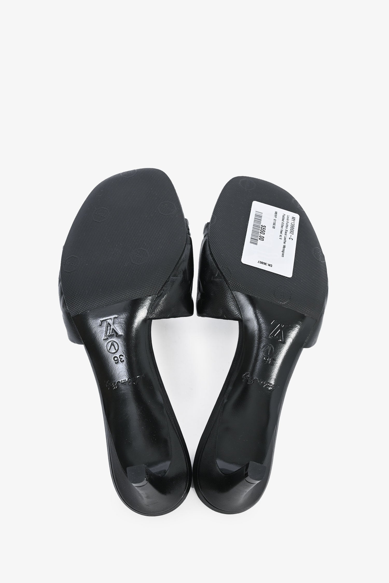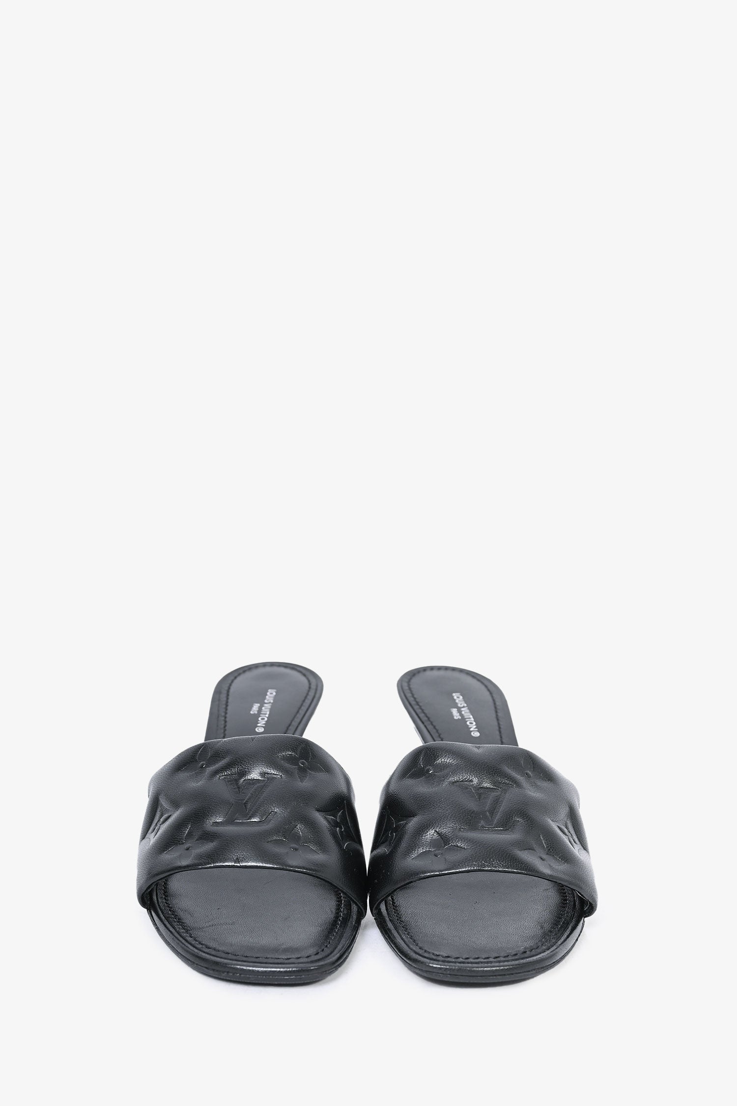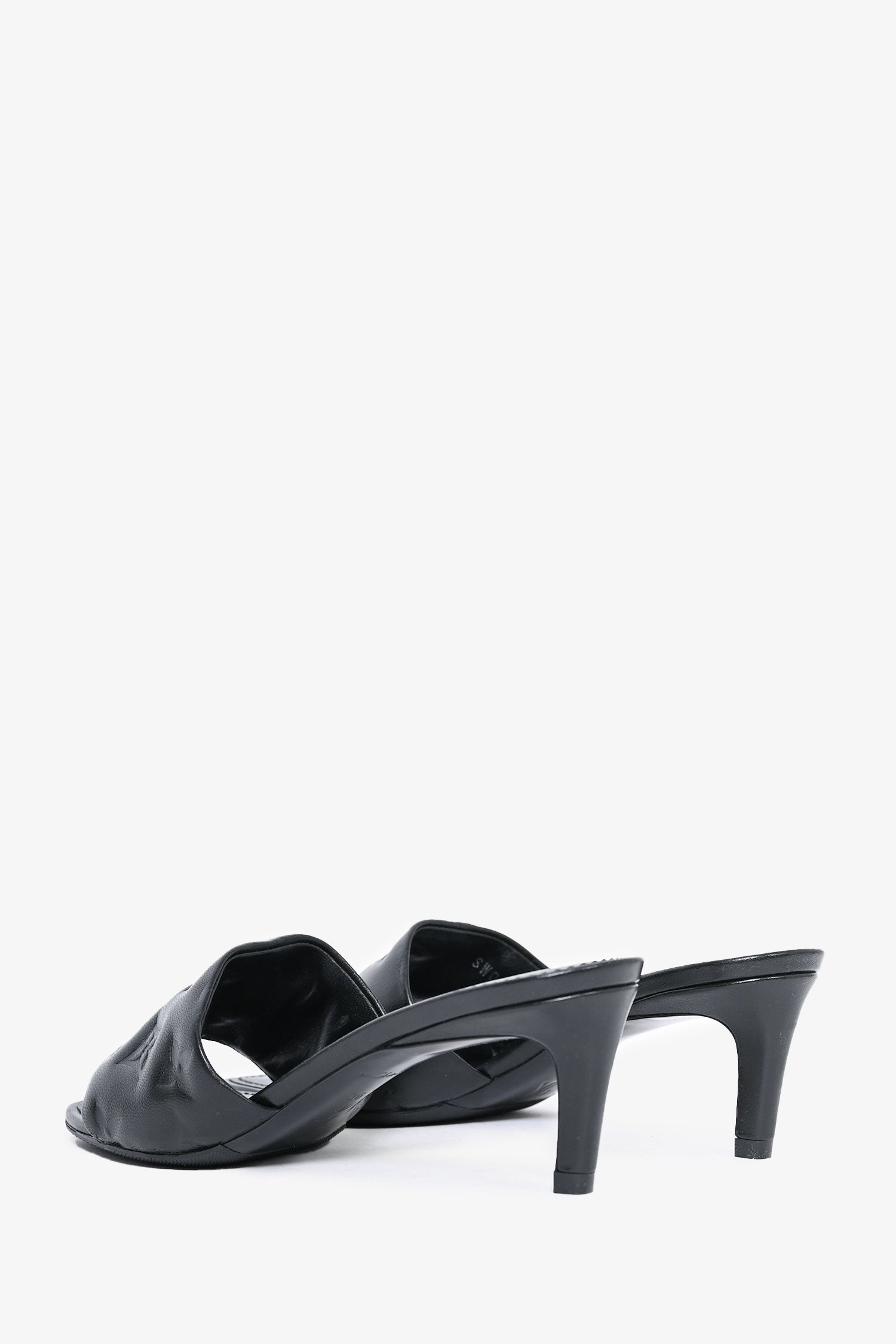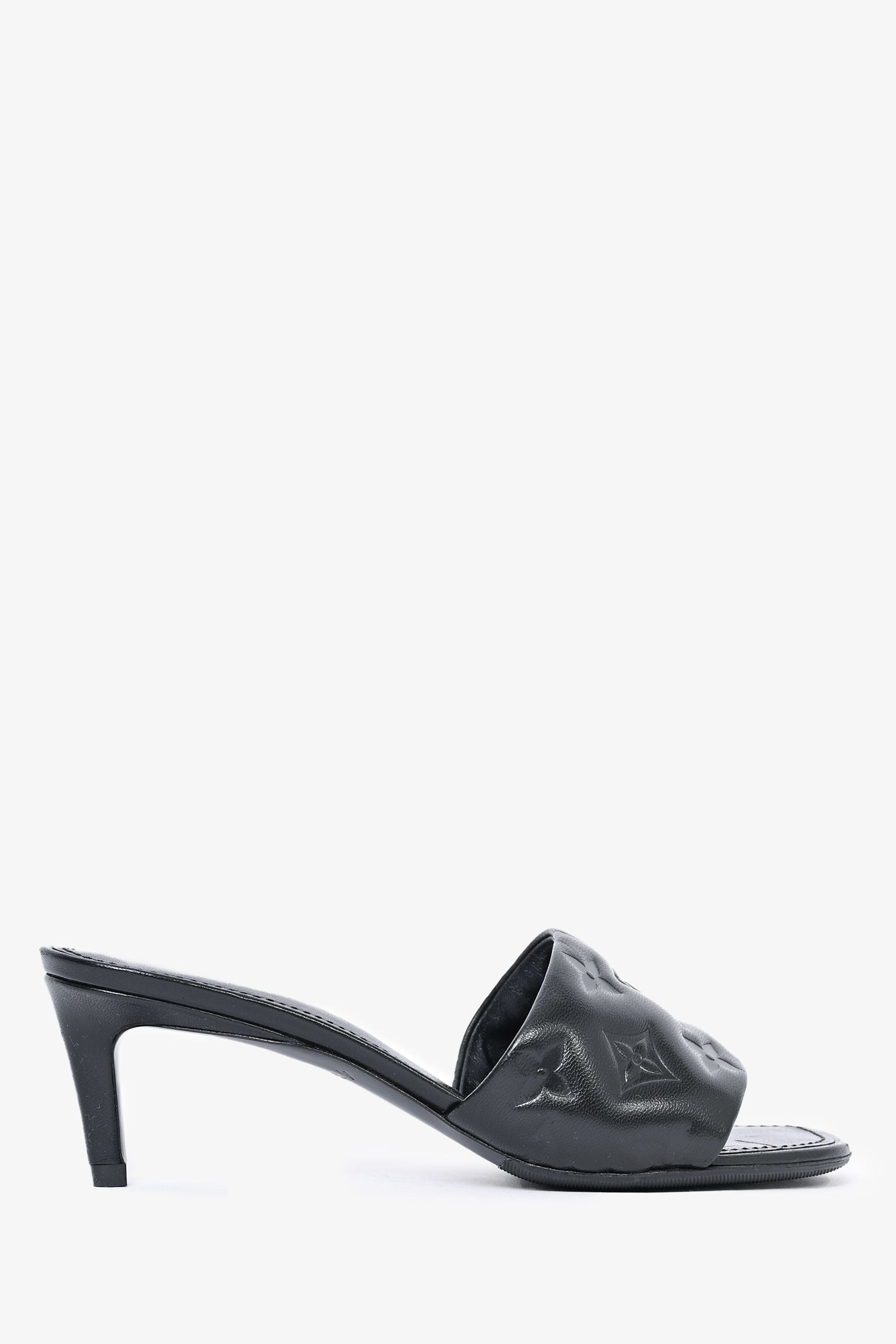 Refresh availabilityLouis Vuitton Black Leather Monogram Padded Kitten Heel. Slip-on. Topy soles. Square toe.