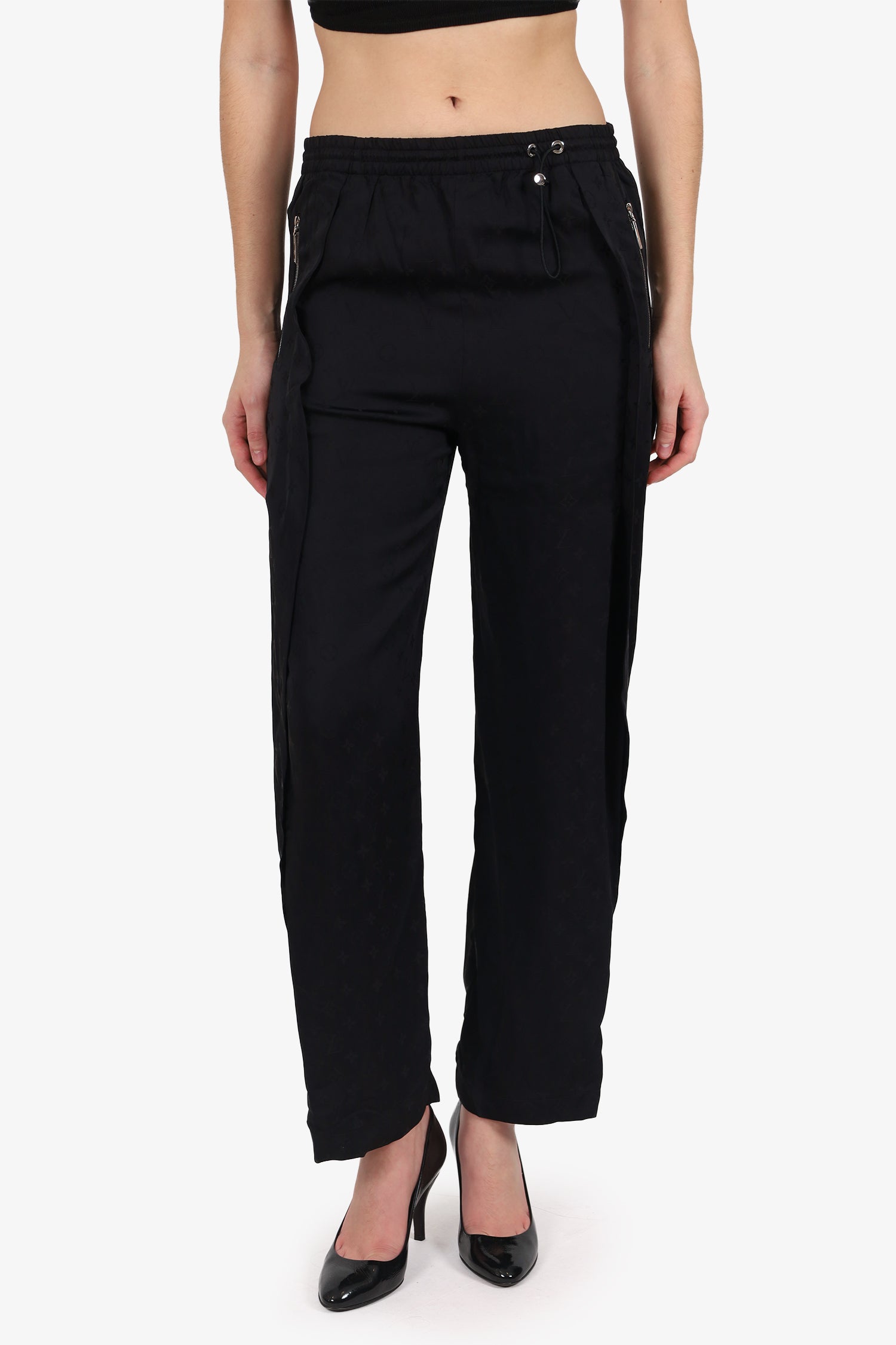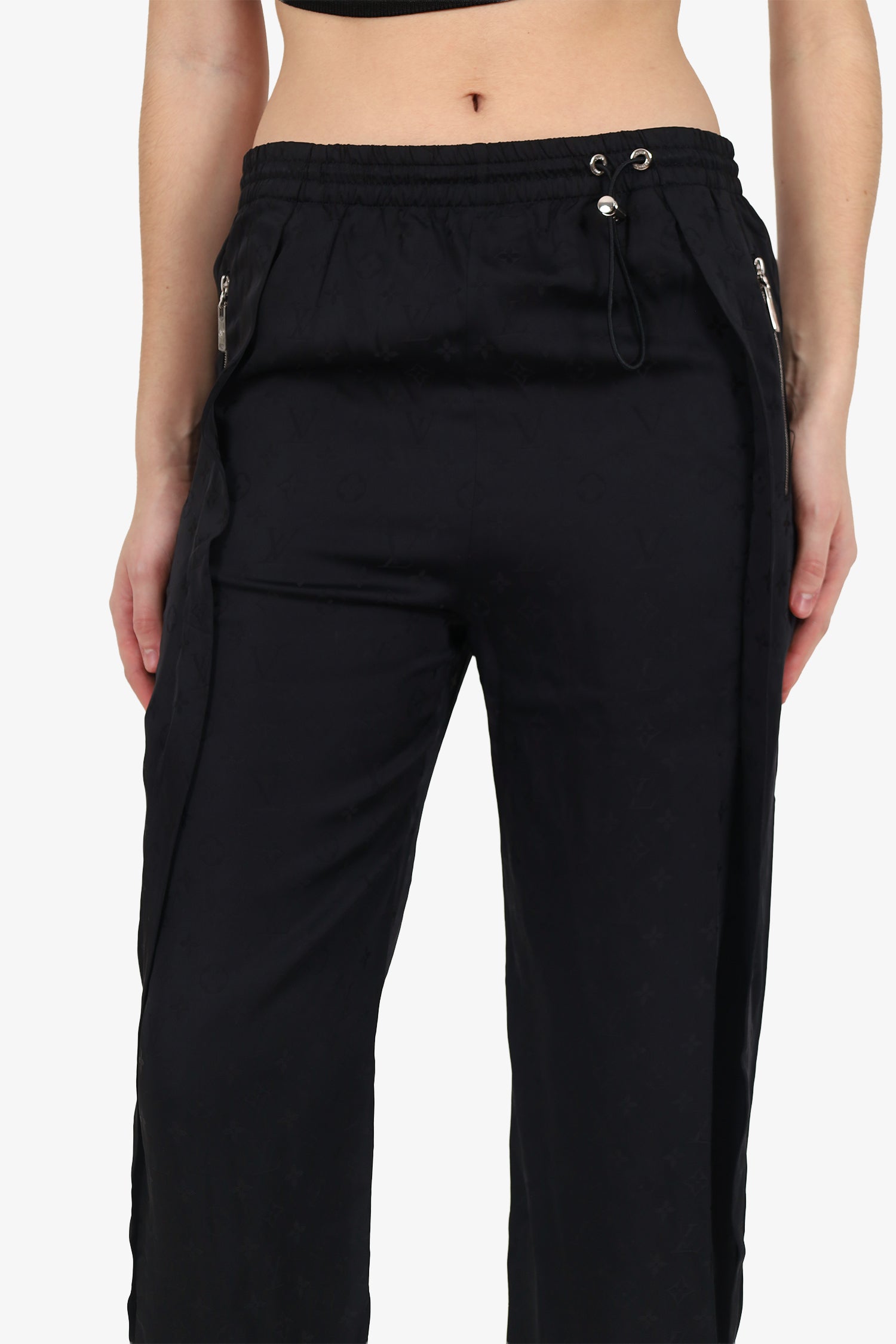 Refresh availabilityLouis Vuitton Black Monogram Front Slit Pants. Slip-on. Elasticized waistband with adjustable drawcord. 3 exterior pockets; 2 side zip and 1 rear slip. Slit at ankle cuffs. Palladium-tone hardware. Tonal stitching.