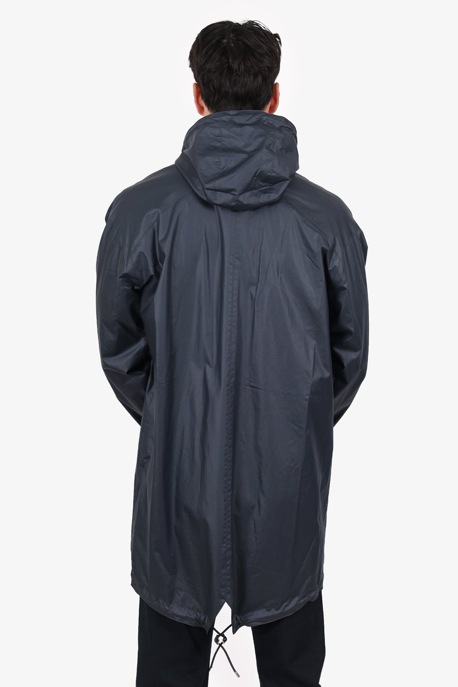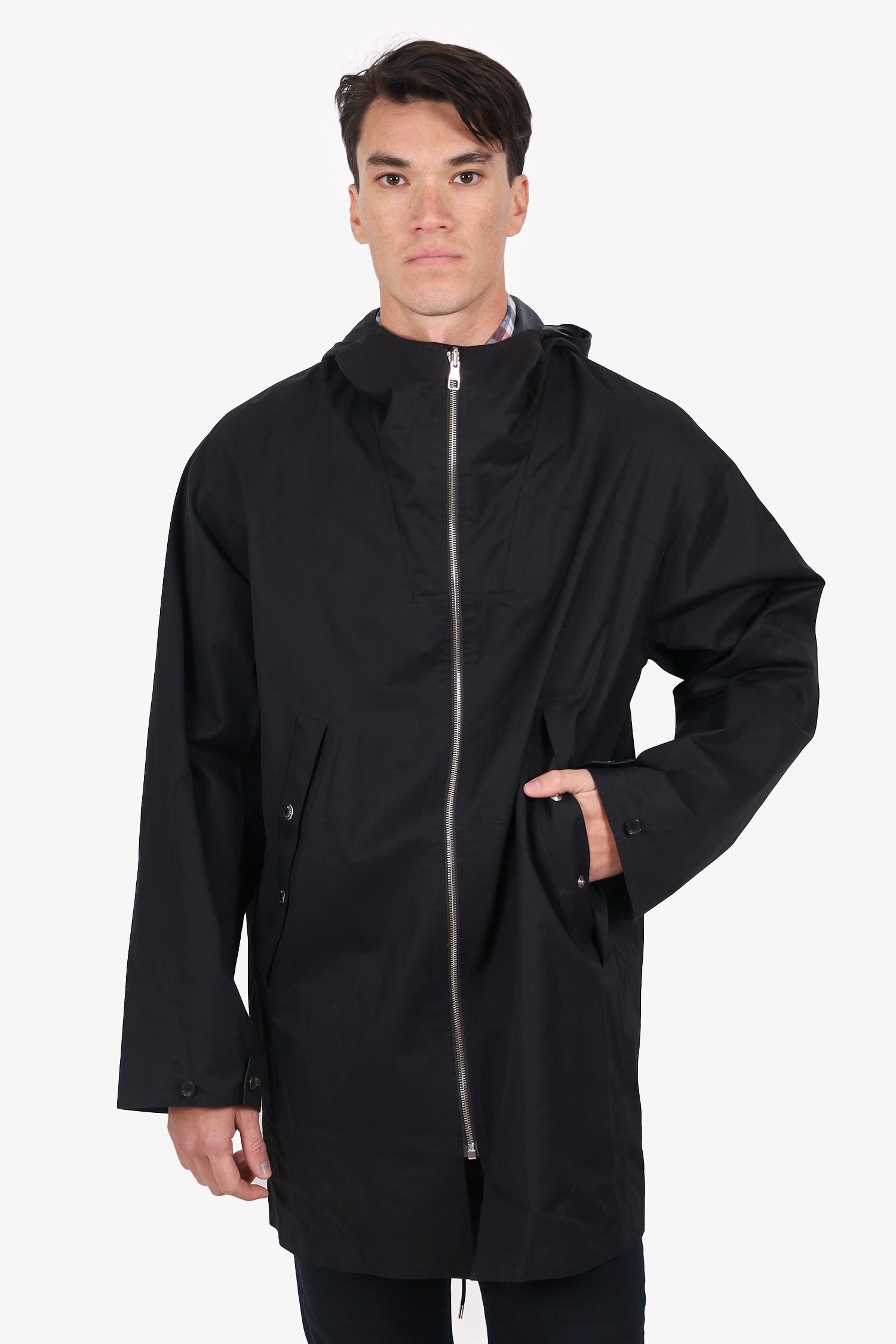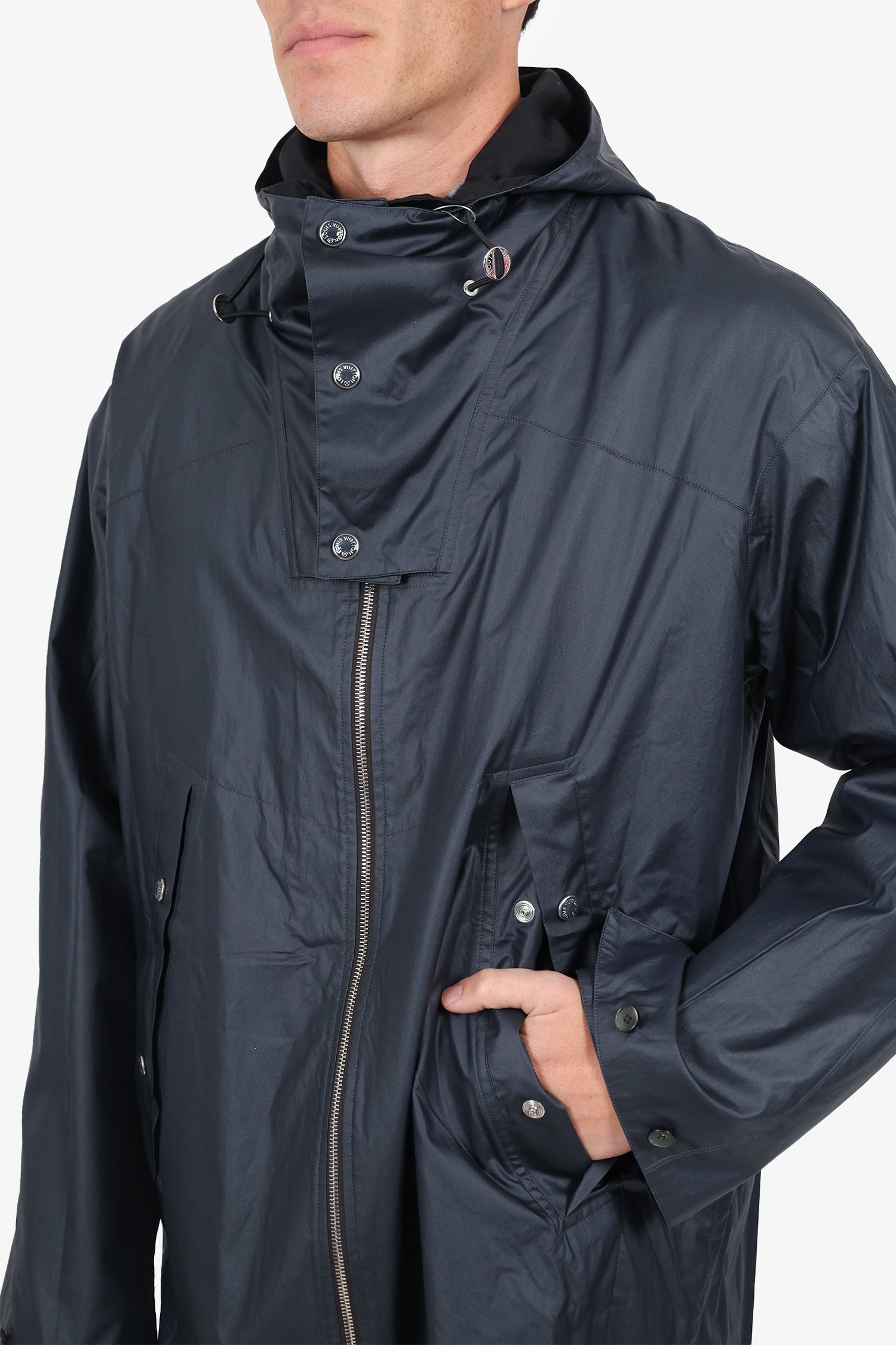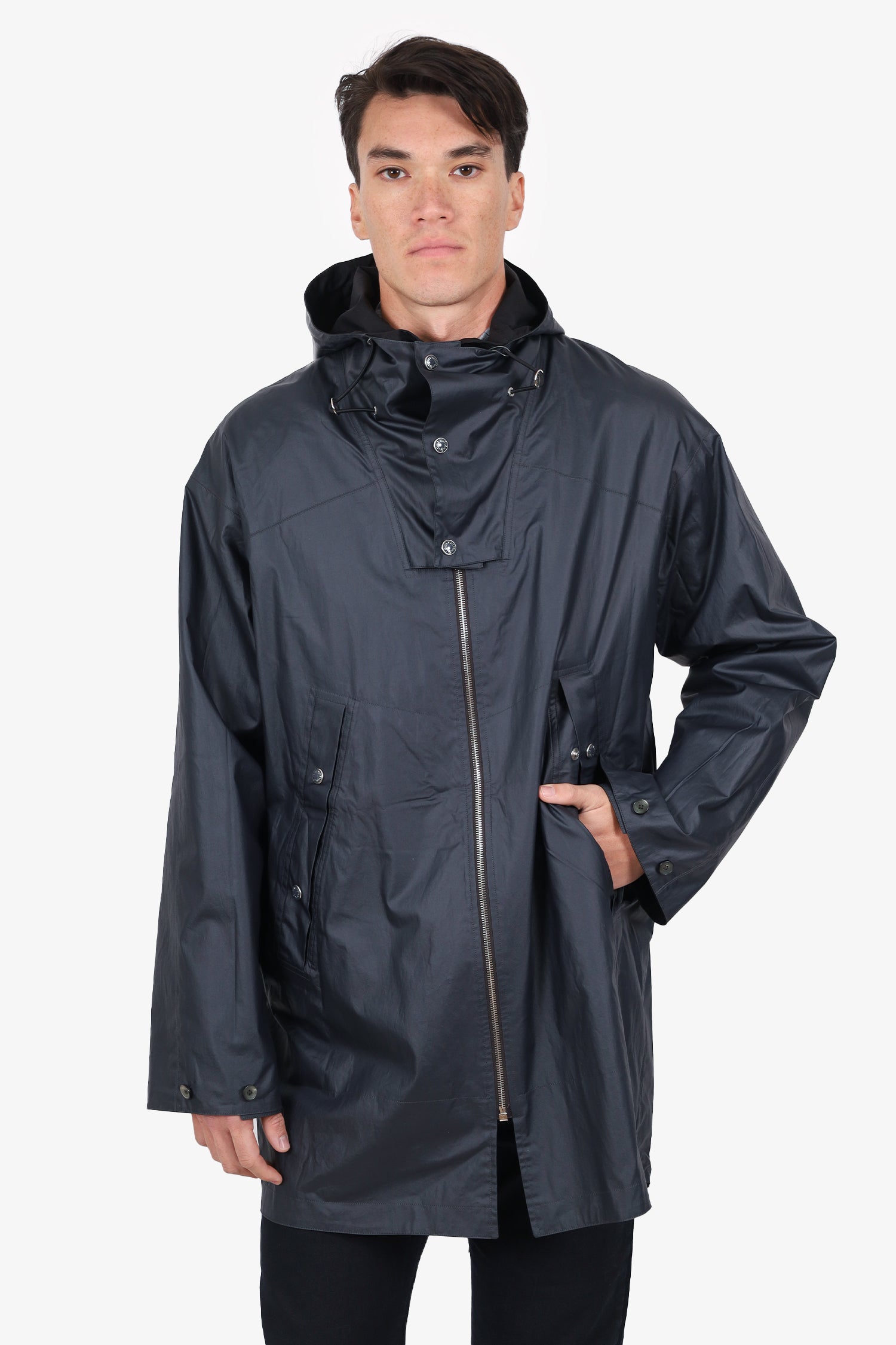 Refresh availabilityLouis Vuitton Black/Navy Reversible Asymmetrical Zipper Long Windbreaker. Pull-on. Front zip and button-up closure. Hooded with adjustable cinching closure. 2 front exterior slip pockets with snap-button closure. Cinching closure at bottom hem. Silver-tone hardware. Tonal stitching.