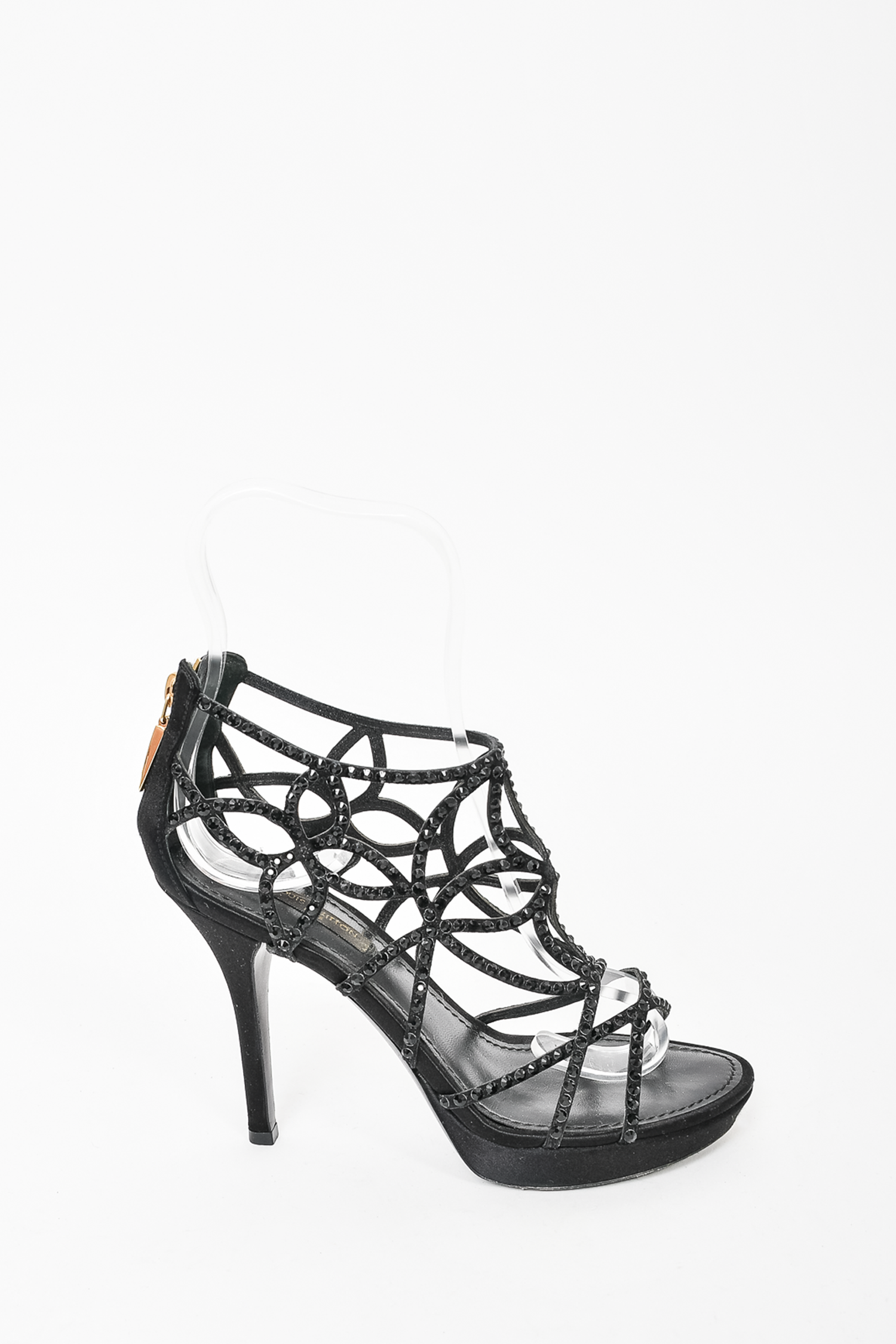 Refresh availabilityLouis Vuitton Black Satin Crystal Embellished Heels. Open toe. Back zipper closure. Skinny stiletto heel. Tonal stitching.