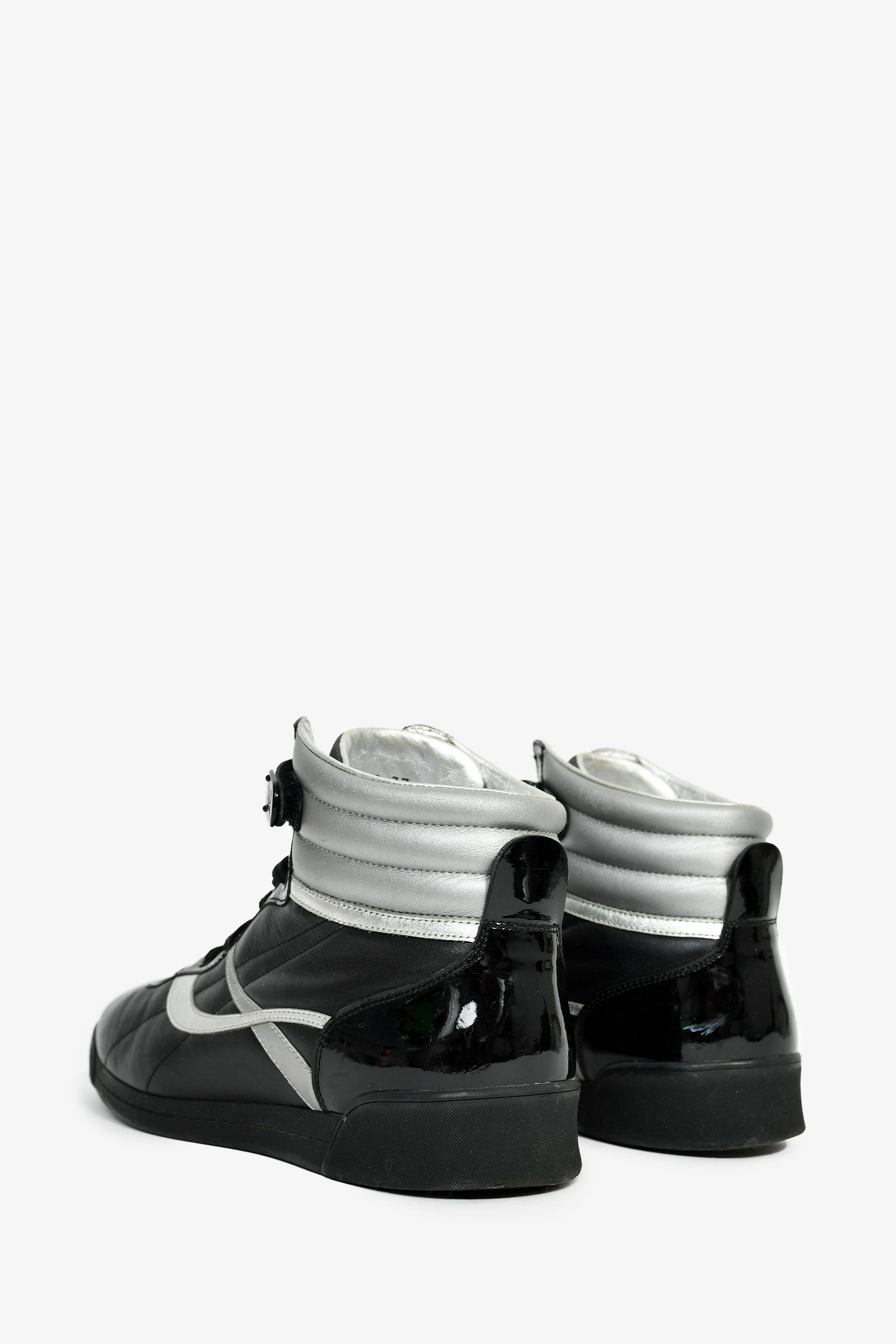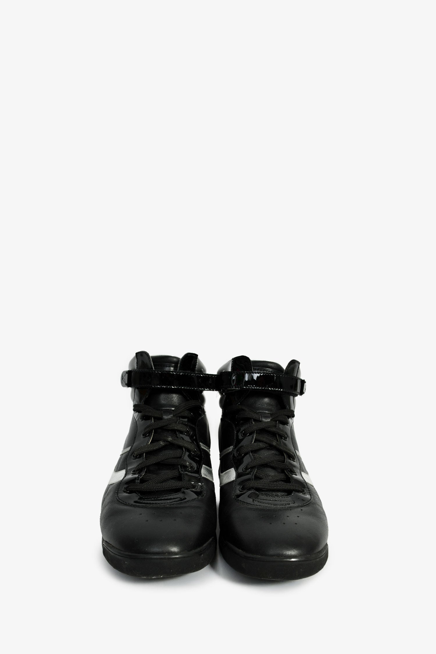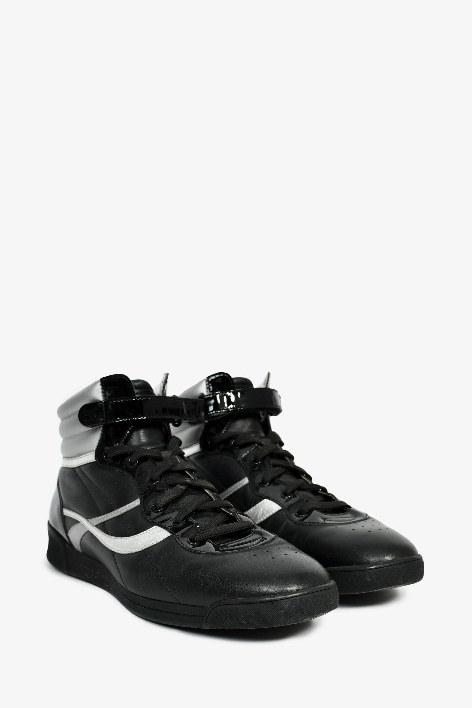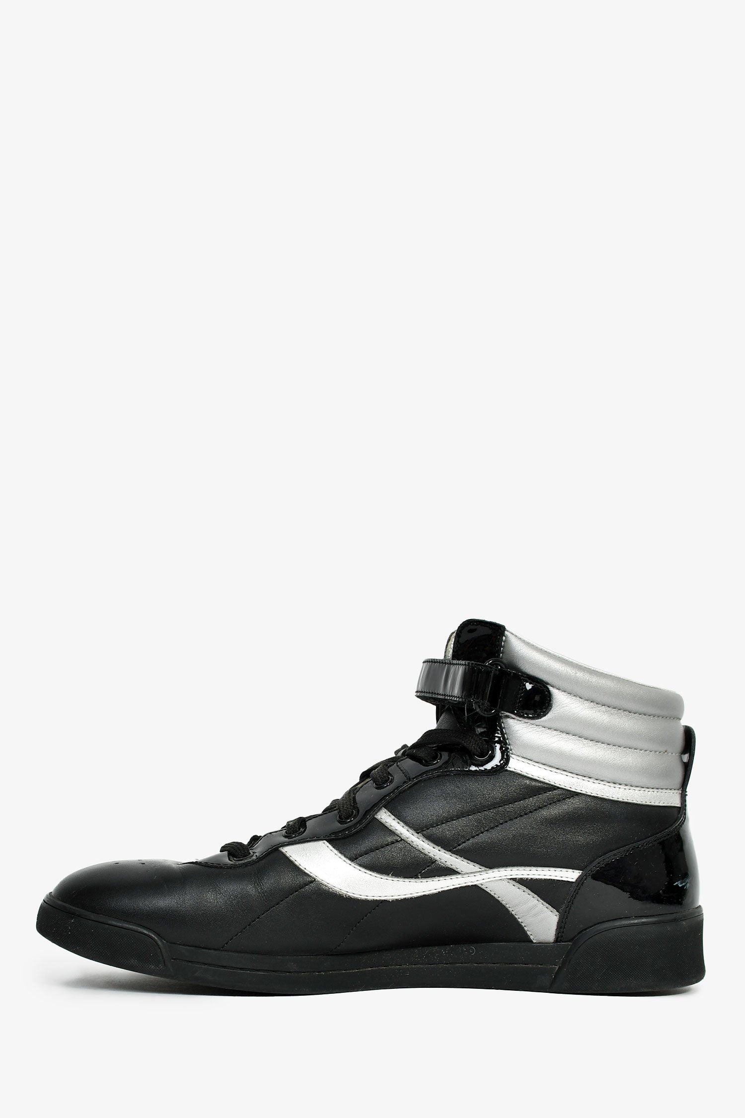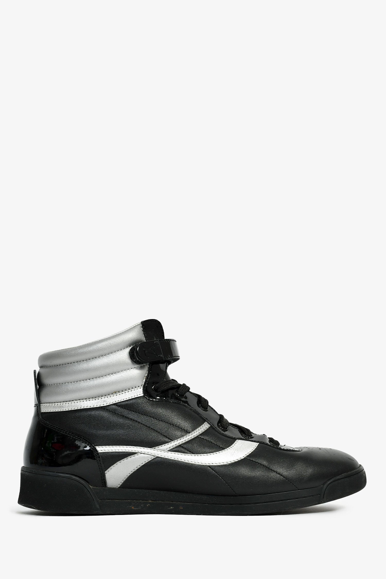 Refresh availabilityLouis Vuitton Black/Silver Leather High Top Sneakers. Almond toe. Front lace-up and velcro closure. Tonal stitching.