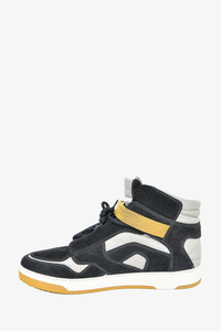 Louis Vuitton Black Tri-Colour Suede High Top Sneakers. Round toe. Silver hardware. Lace-up closure. Tonal stitching.