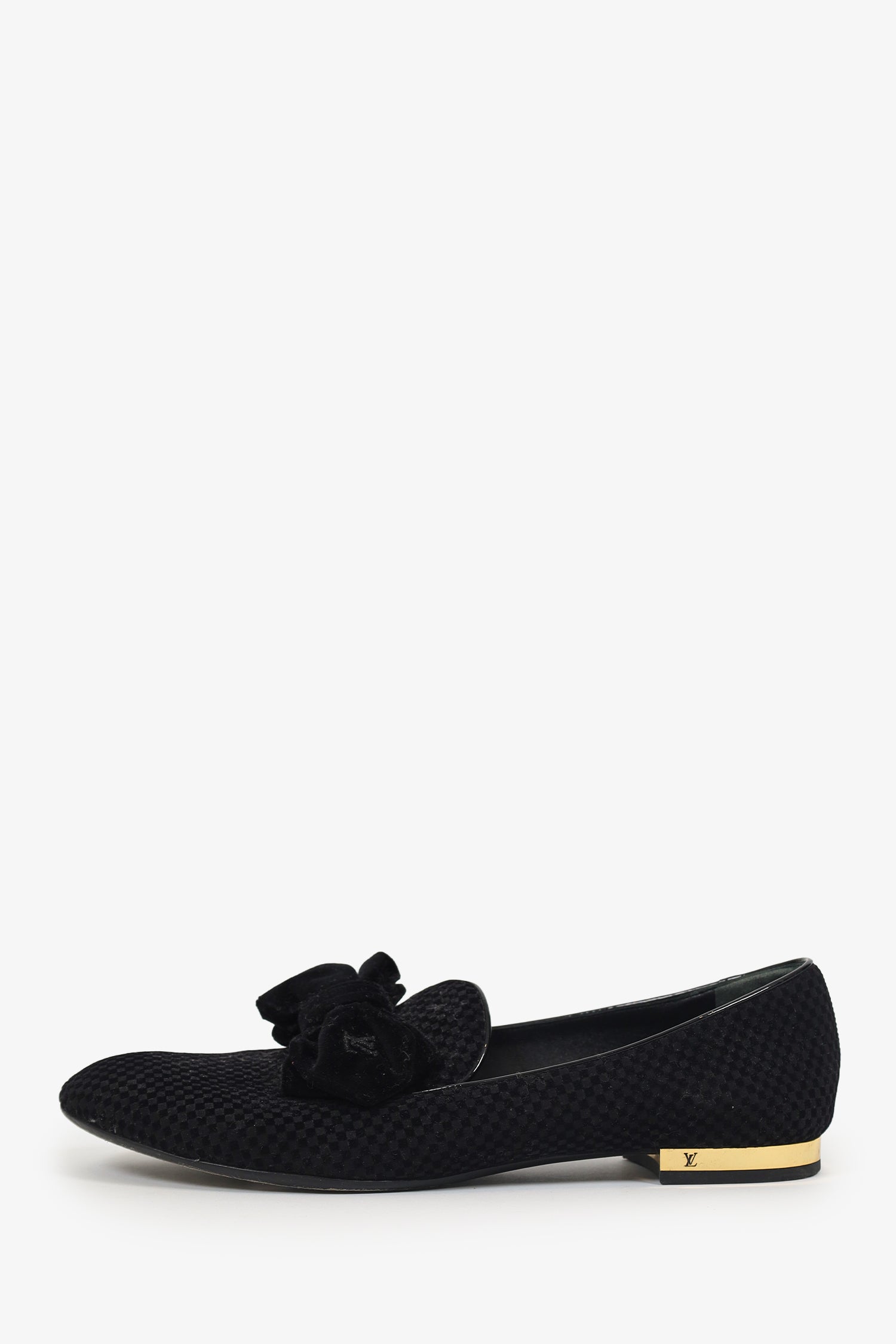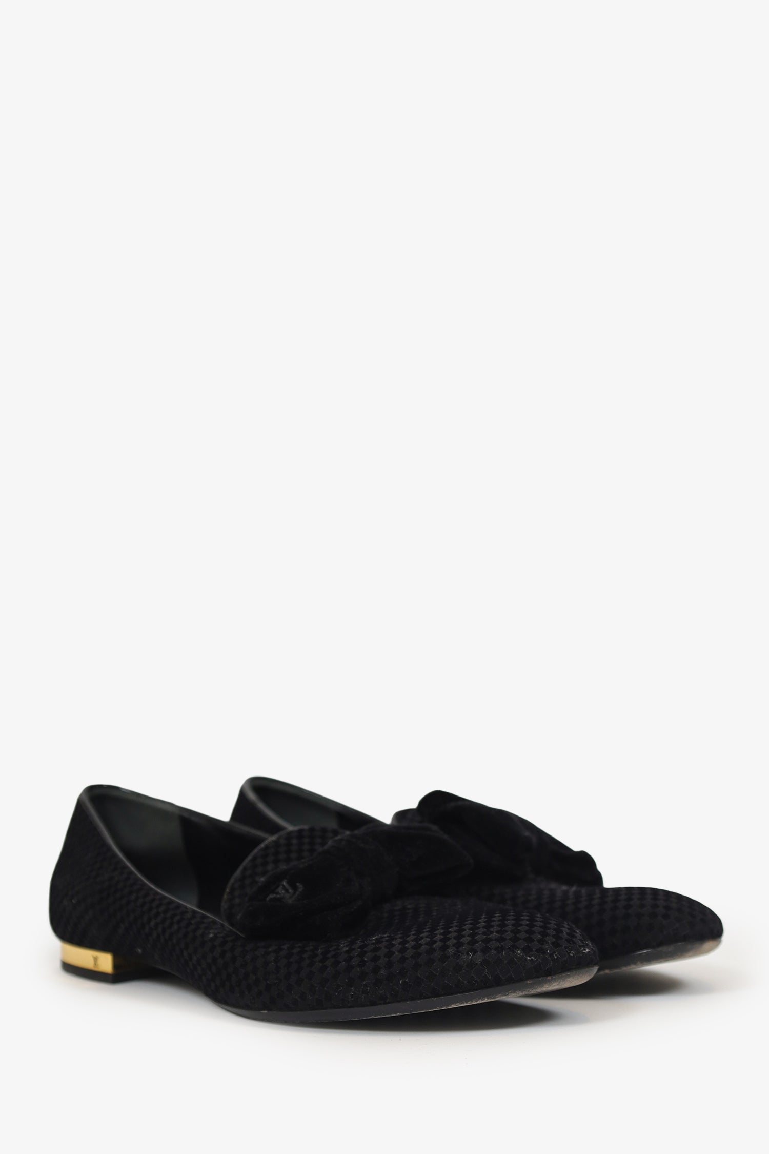Refresh availabilityLouis Vuitton Black Velvet Bow Loafer. Slip-on. Round toe. Block heel. Gold-tone hardware. Tonal stitching.