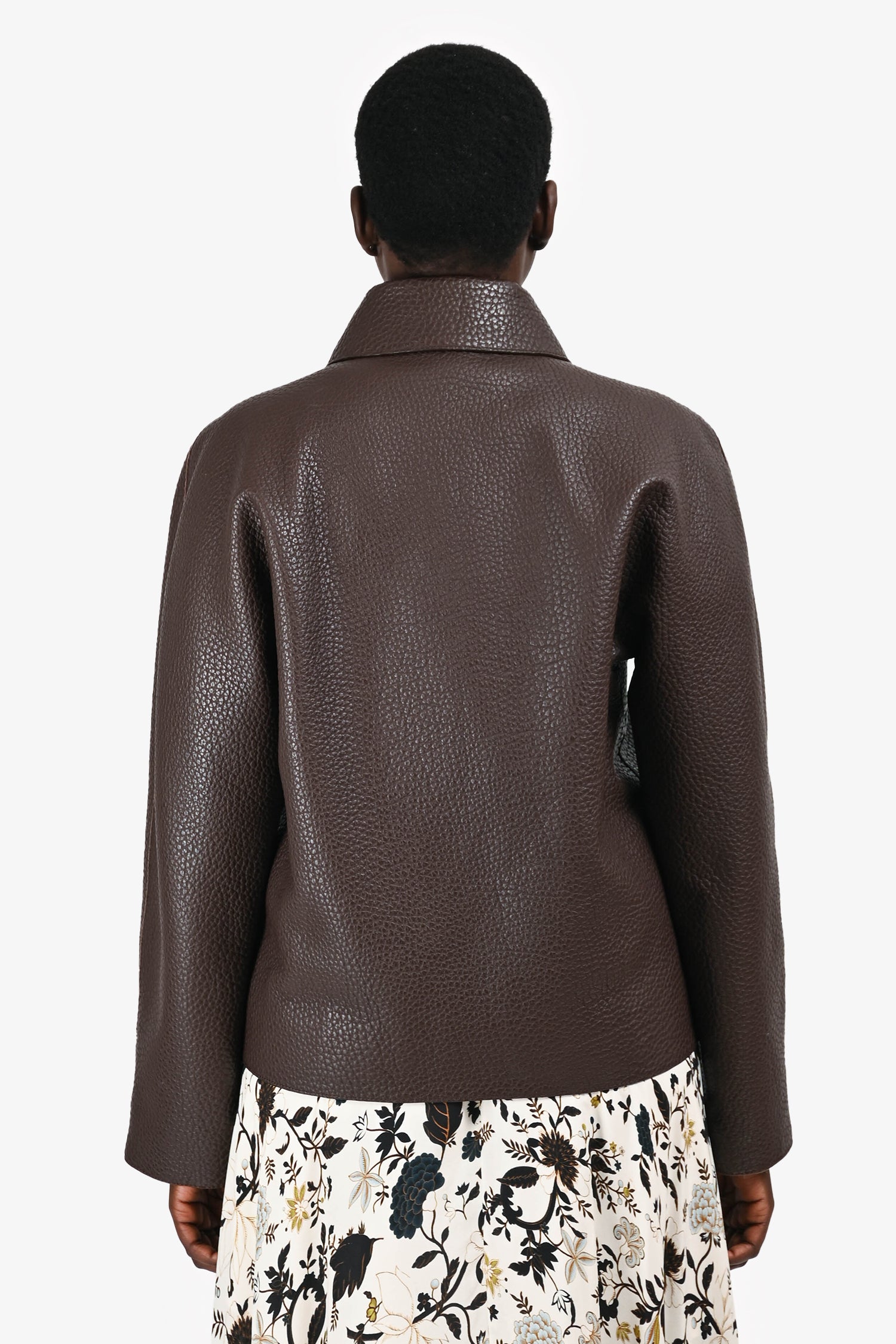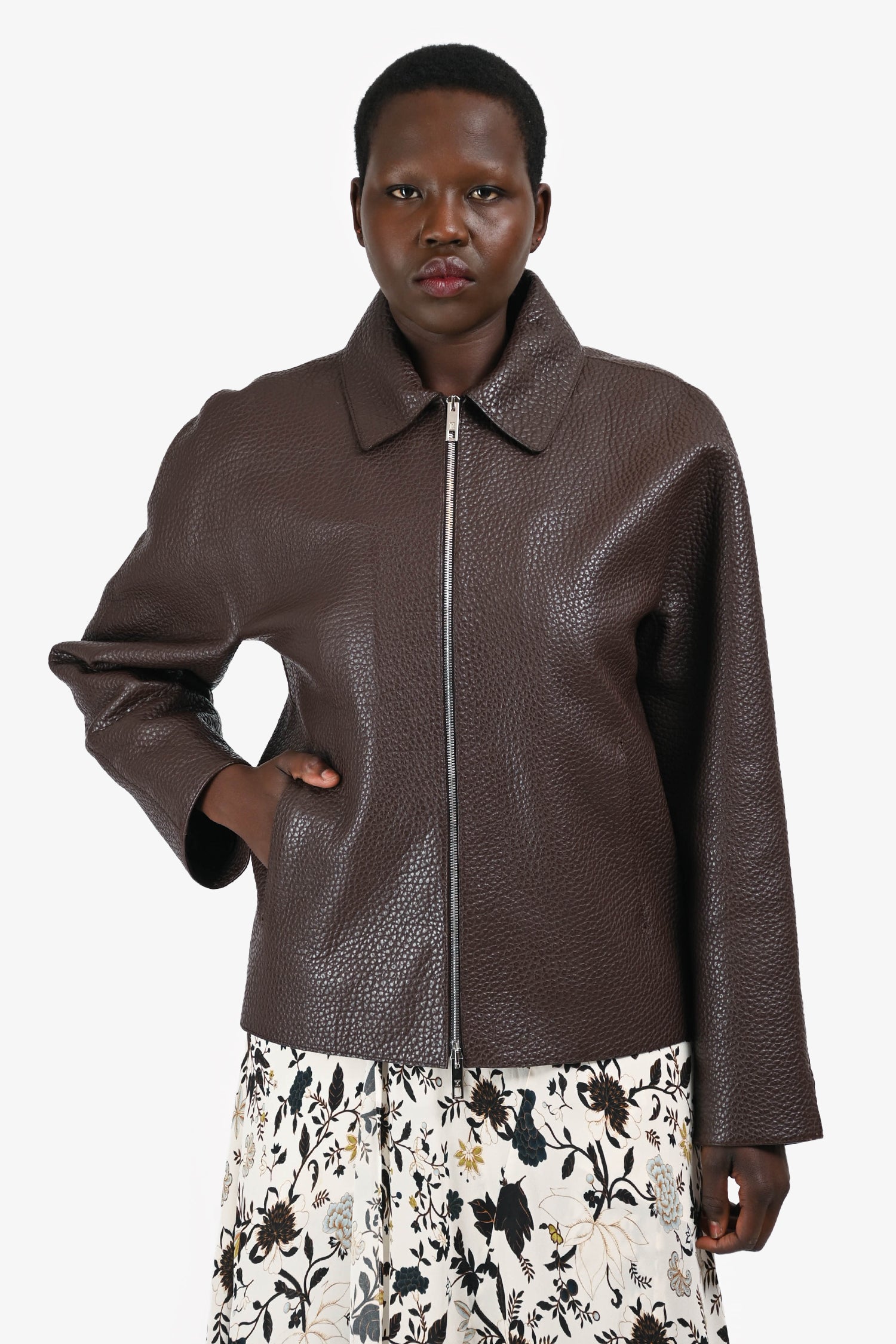 Refresh availabilityLouis Vuitton Brown Grained Bull Leather Zip Jacket. Classic collar neckline. Front zip closure. Side slip pockets. Two interior slip pockets. Fully lined interior. Tonal stitching.