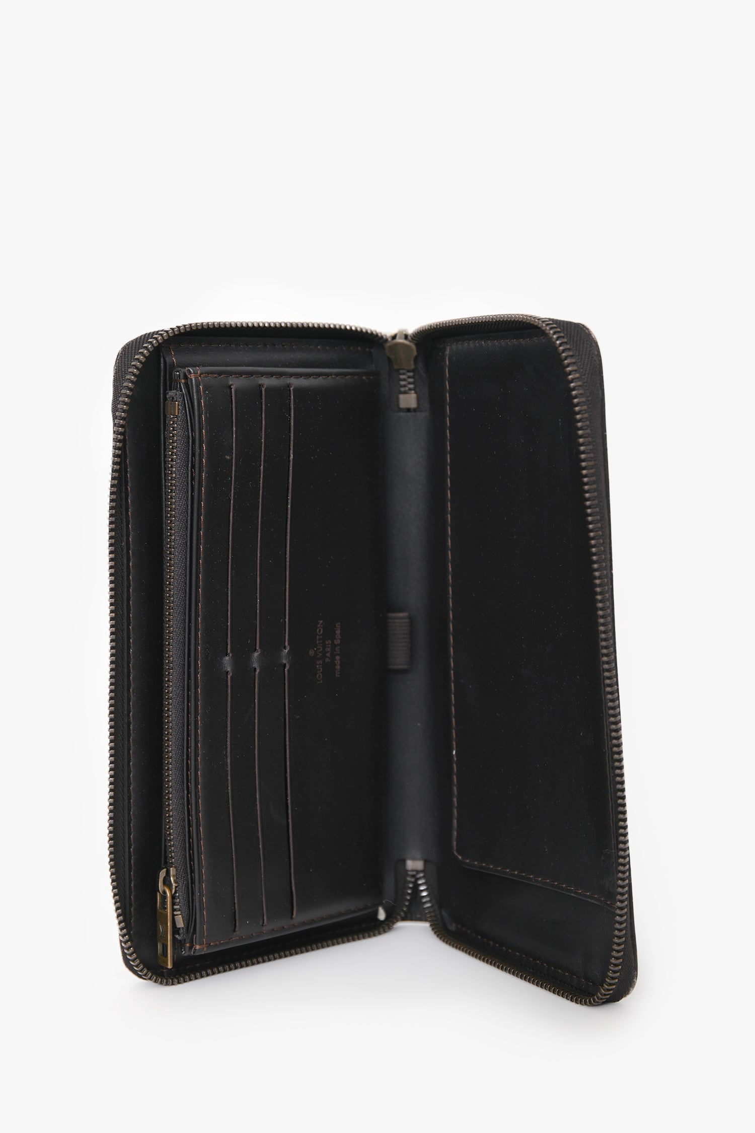 Refresh availabilityLouis Vuitton Brown Leather Travel Wallet. Zip-around closure. Accordion-style interior with 2 bill compartments, 12 card slots, 1 slip pocket, and 1 zip coin pocket. Leather-lined interior. Gold-tone hardware. Contrast stitching.