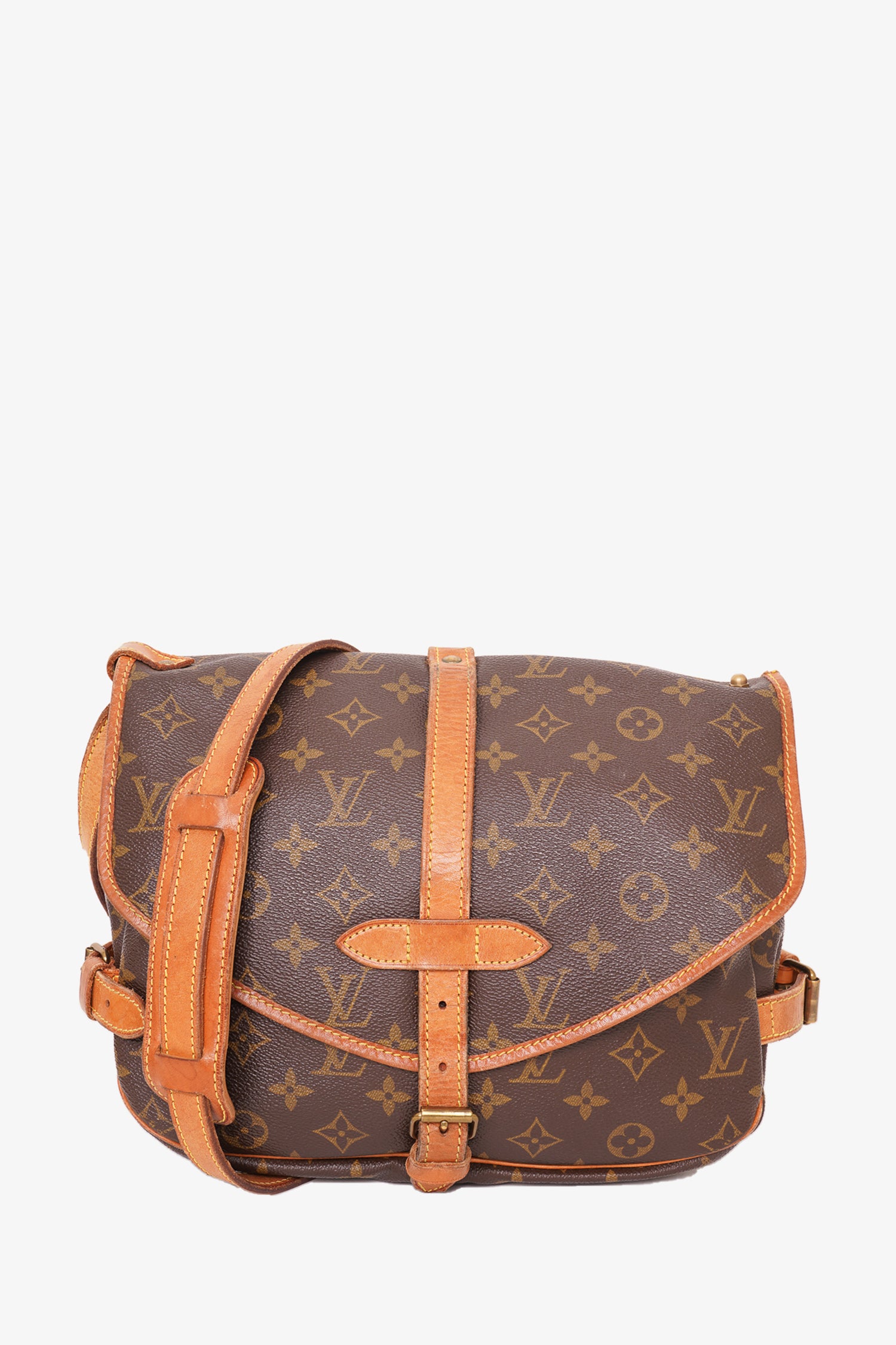 Refresh availabilityLouis Vuitton Brown Monogram Saumur 30 Messenger Bag. Front and back fold-over flap with buckle closure. Side buckle detail. interior slip pocket. Adjustable strap. Gold-toned hardware. Yellow contrast stitching.