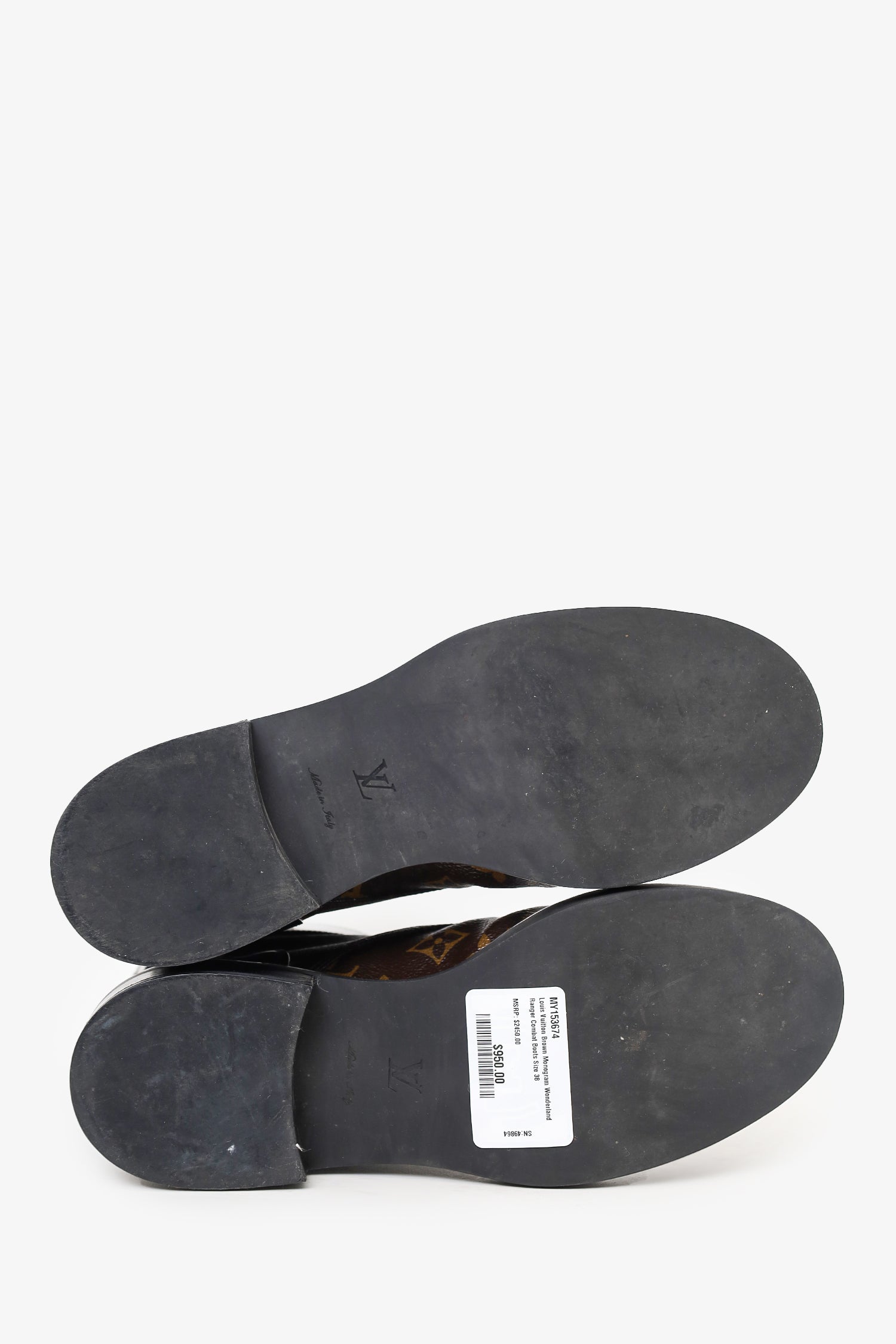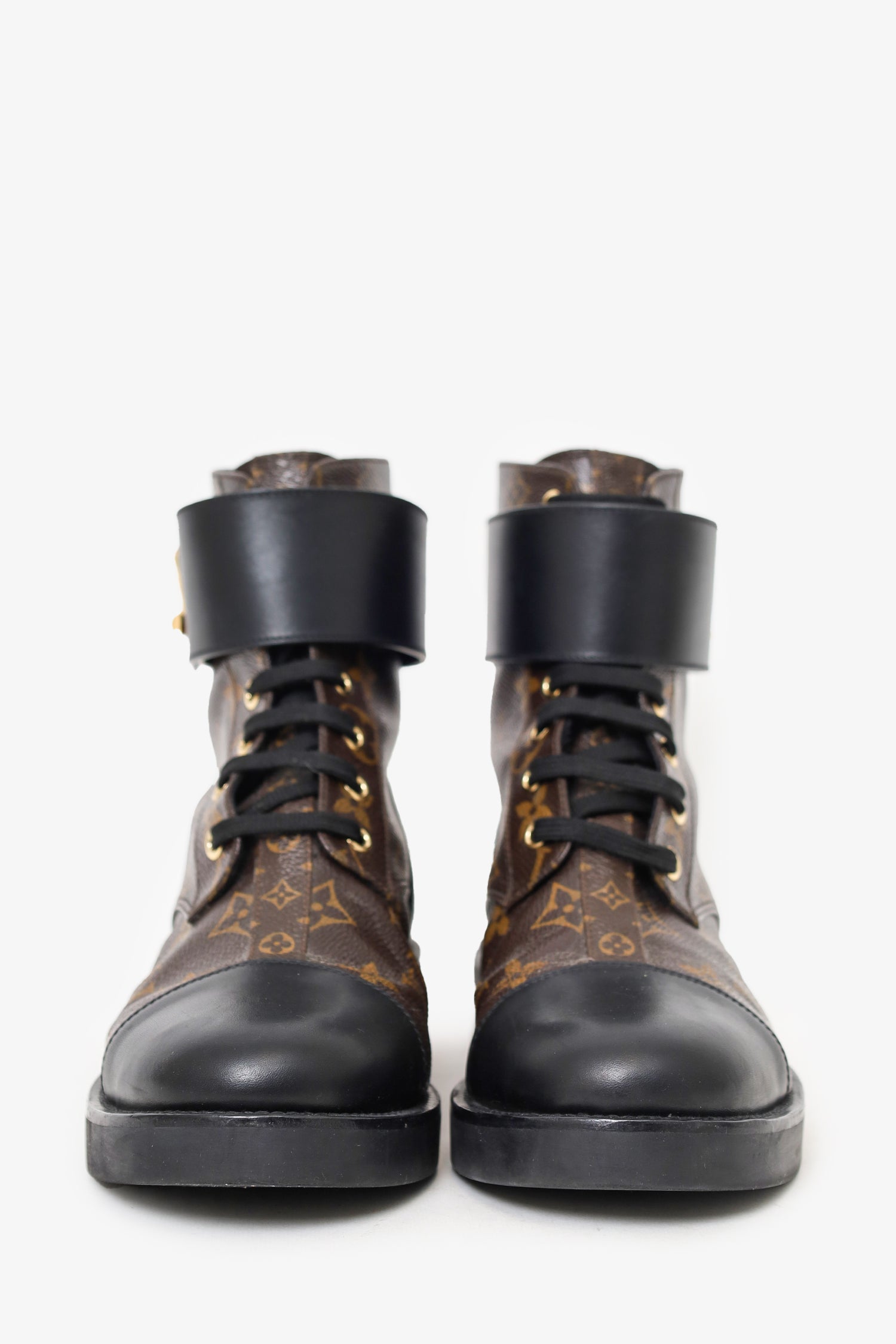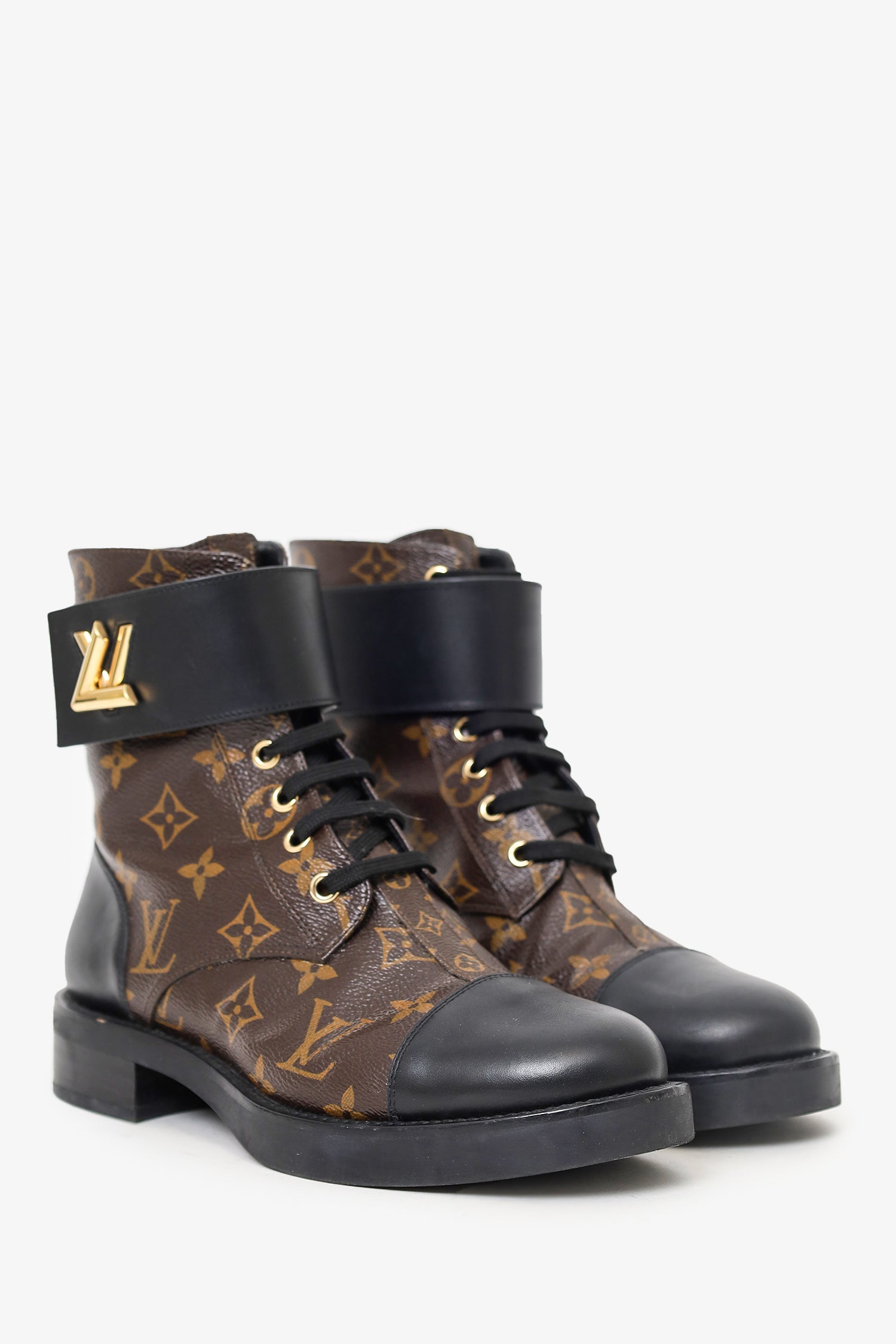 Refresh availabilityLouis Vuitton Brown Monogram Wonderland Ranger Combat Boots. Pull-on. Round toe. Front lace-up closure. Ankle strap with logo turn-lock closure. Tonal stitching. Gold-tone hardware.
