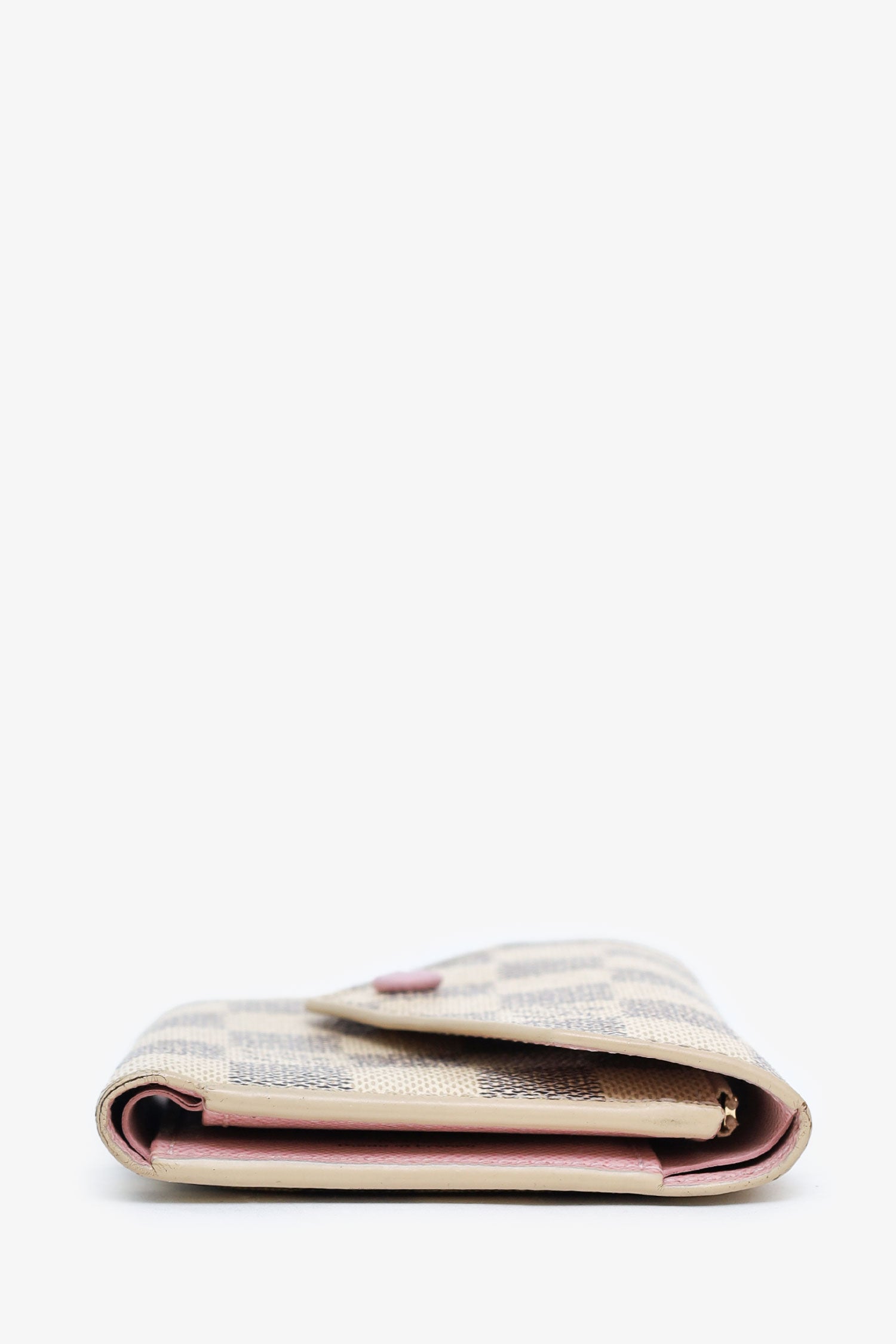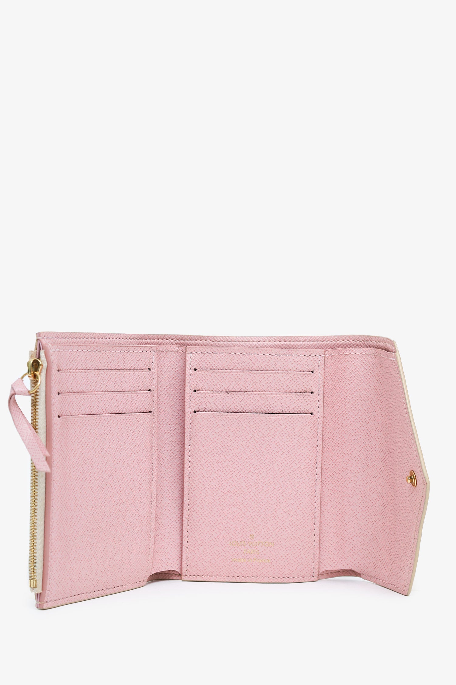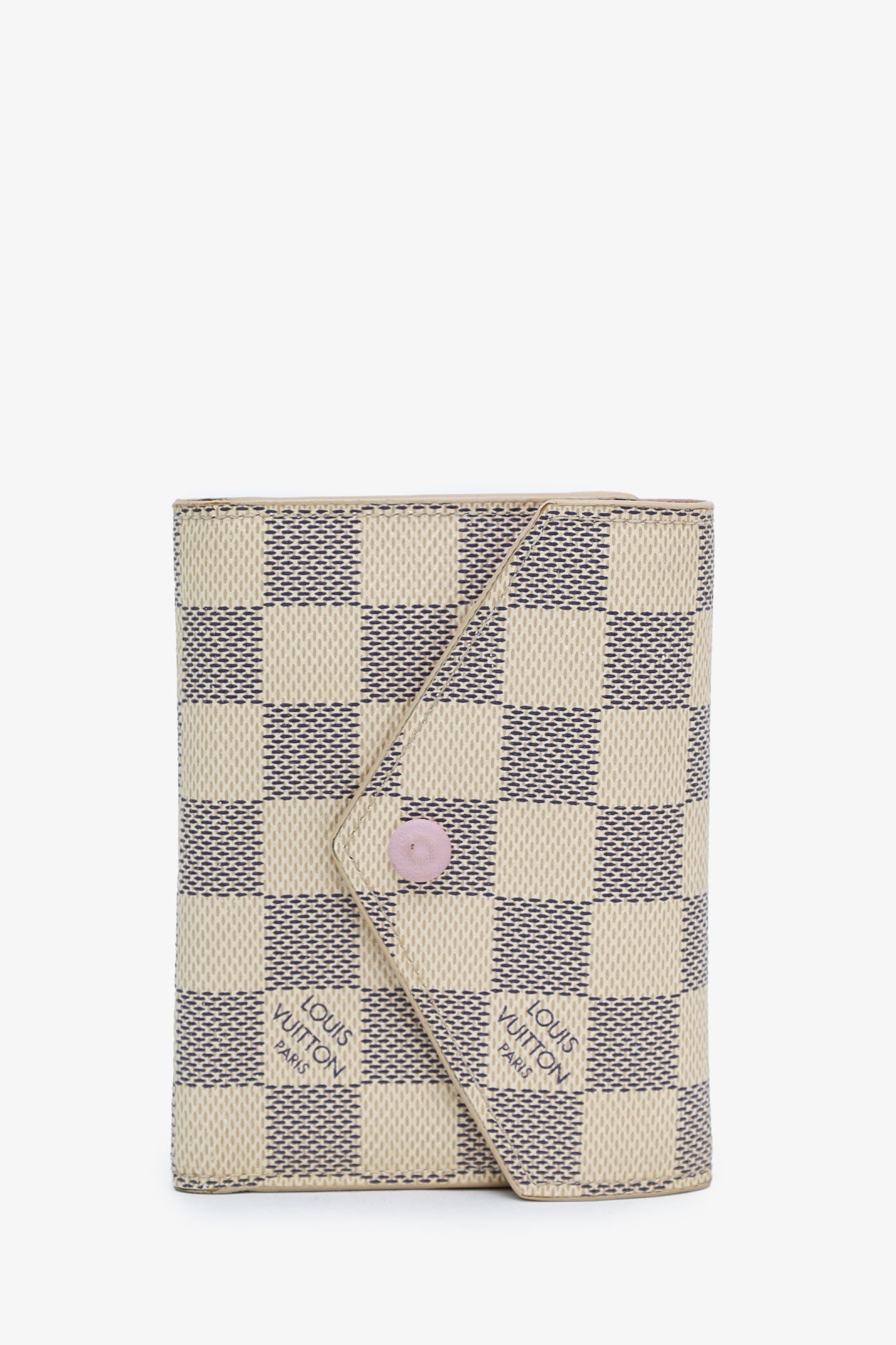 Refresh availabilityLouis Vuitton Damier Azur Victorine Wallet. Front fold-over flap with snap-button closure. Lined interior with 10 pockets; 6 card slots, 2 slip, 1 bill, and 1 zip. Gold-tone hardware. Tonal stitching.