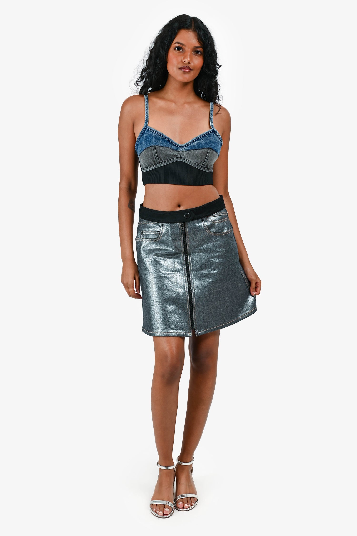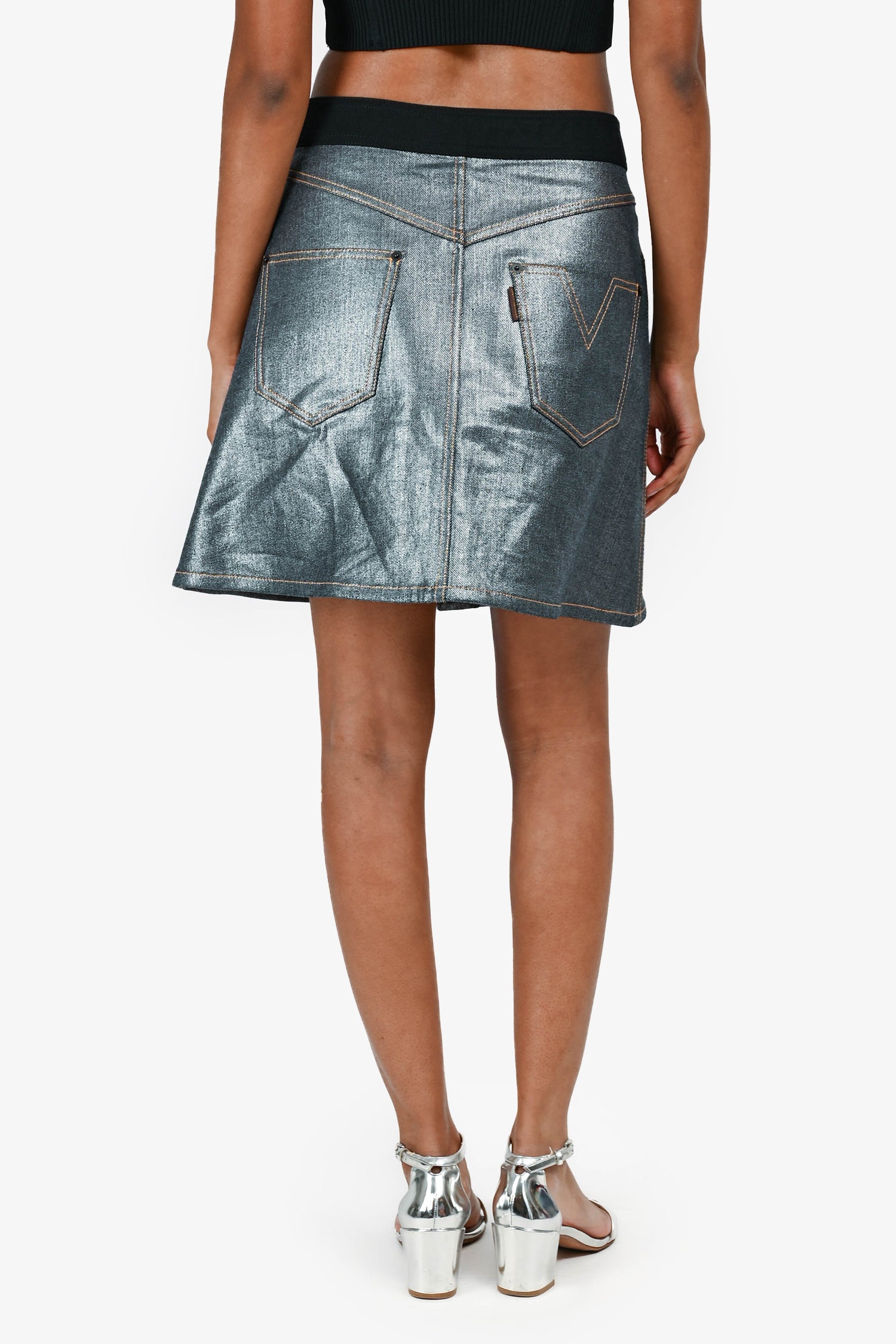 Refresh availabilityLouis Vuitton Denim/Fabric Metallic Mini Skirt. Front Zip and button closure. 5 exterior pockets. Contrast stitching.