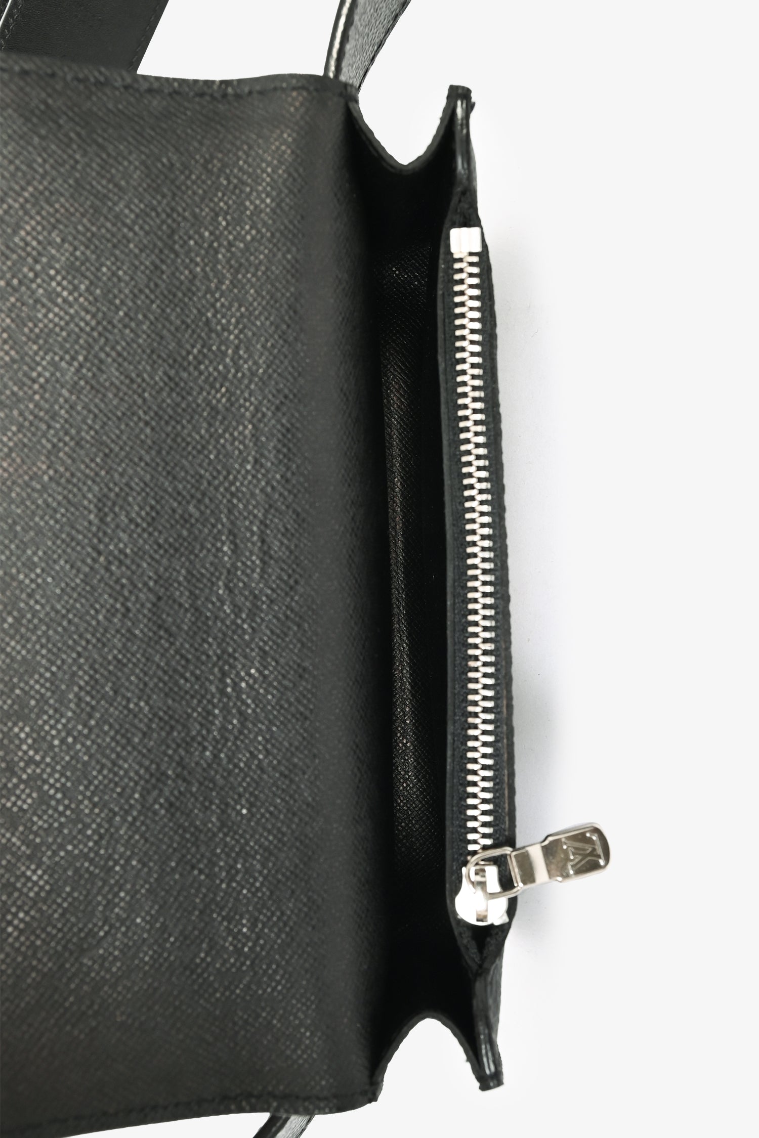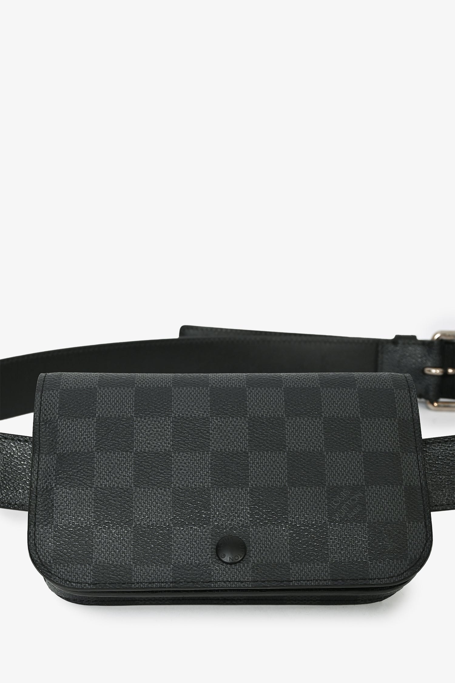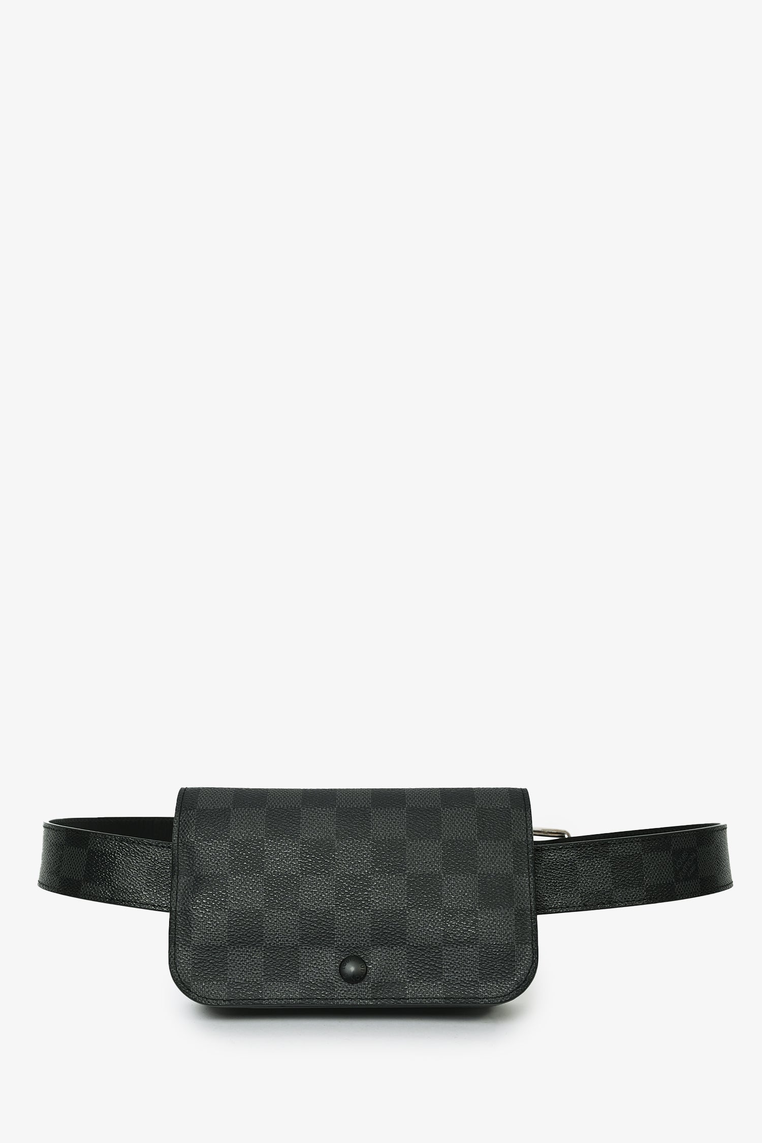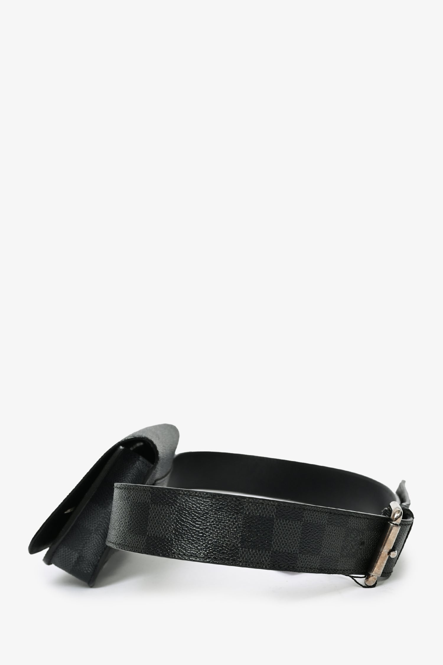 Louis Vuitton Graphite Damier Belt Bag. Front fold-over flap with snap closure. 2 compartments; 1 open and 1 zippered. Zippered pocket on the interior of the front flap. Adjustable belt. Silver-tone hardware. Tonal stitching.