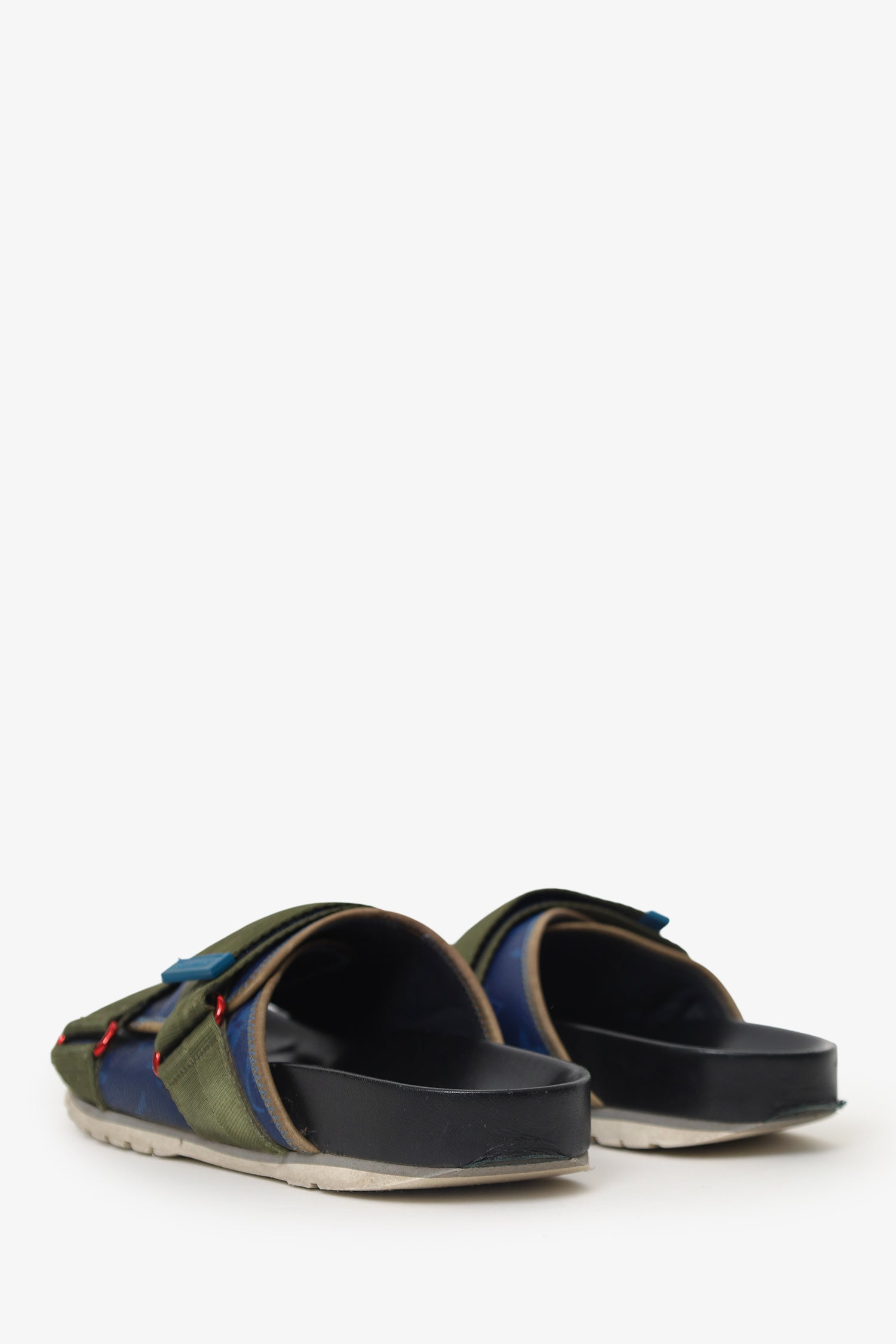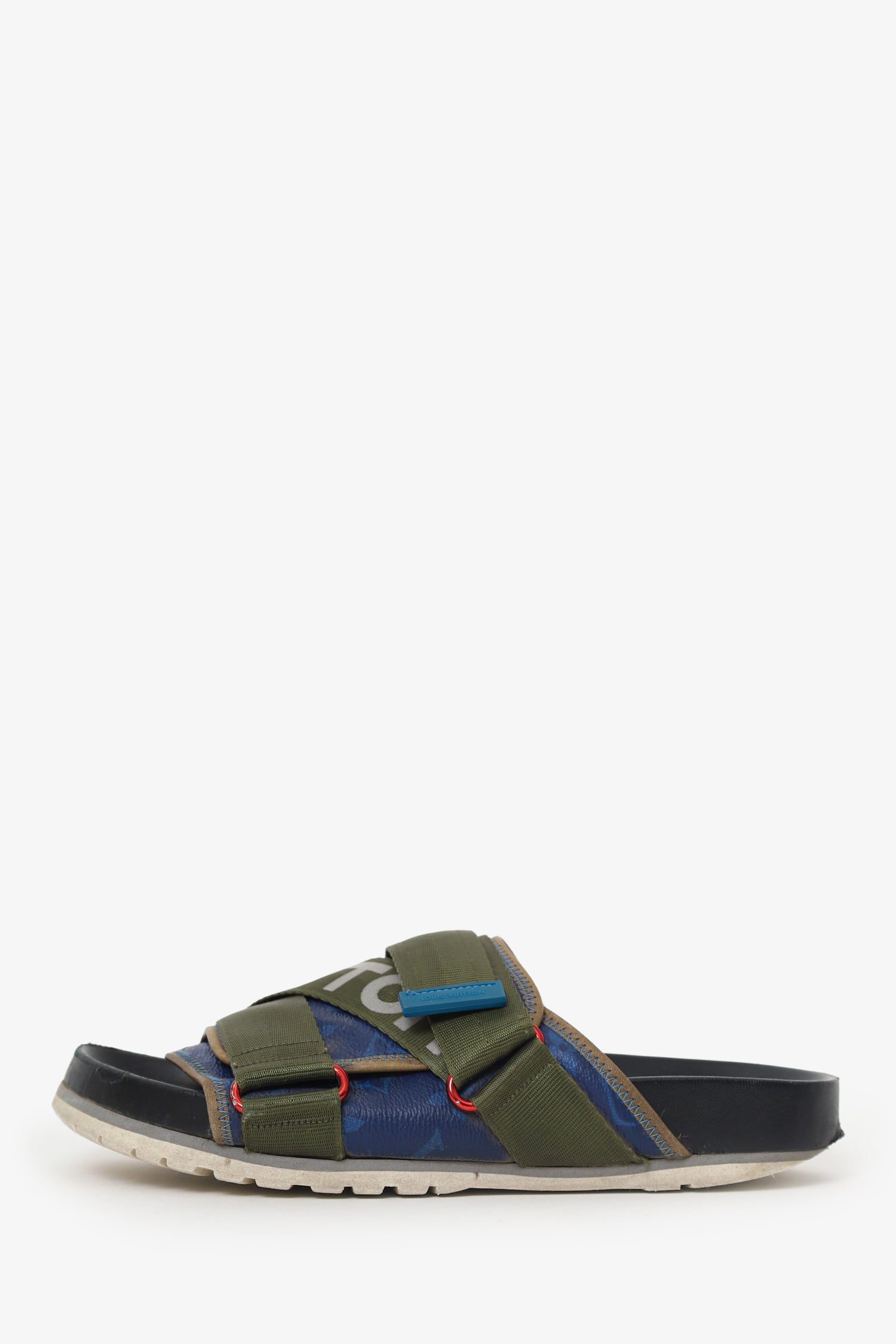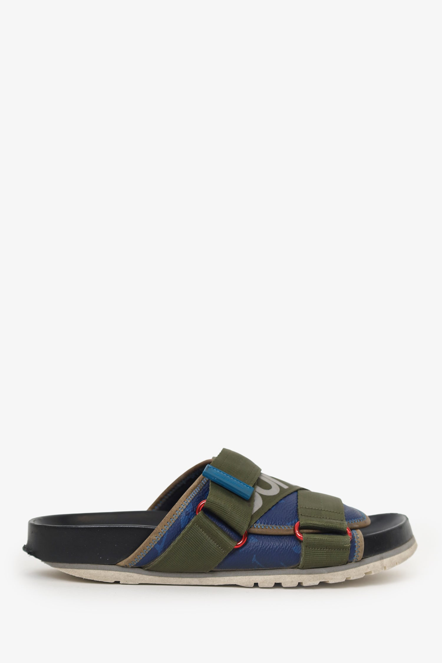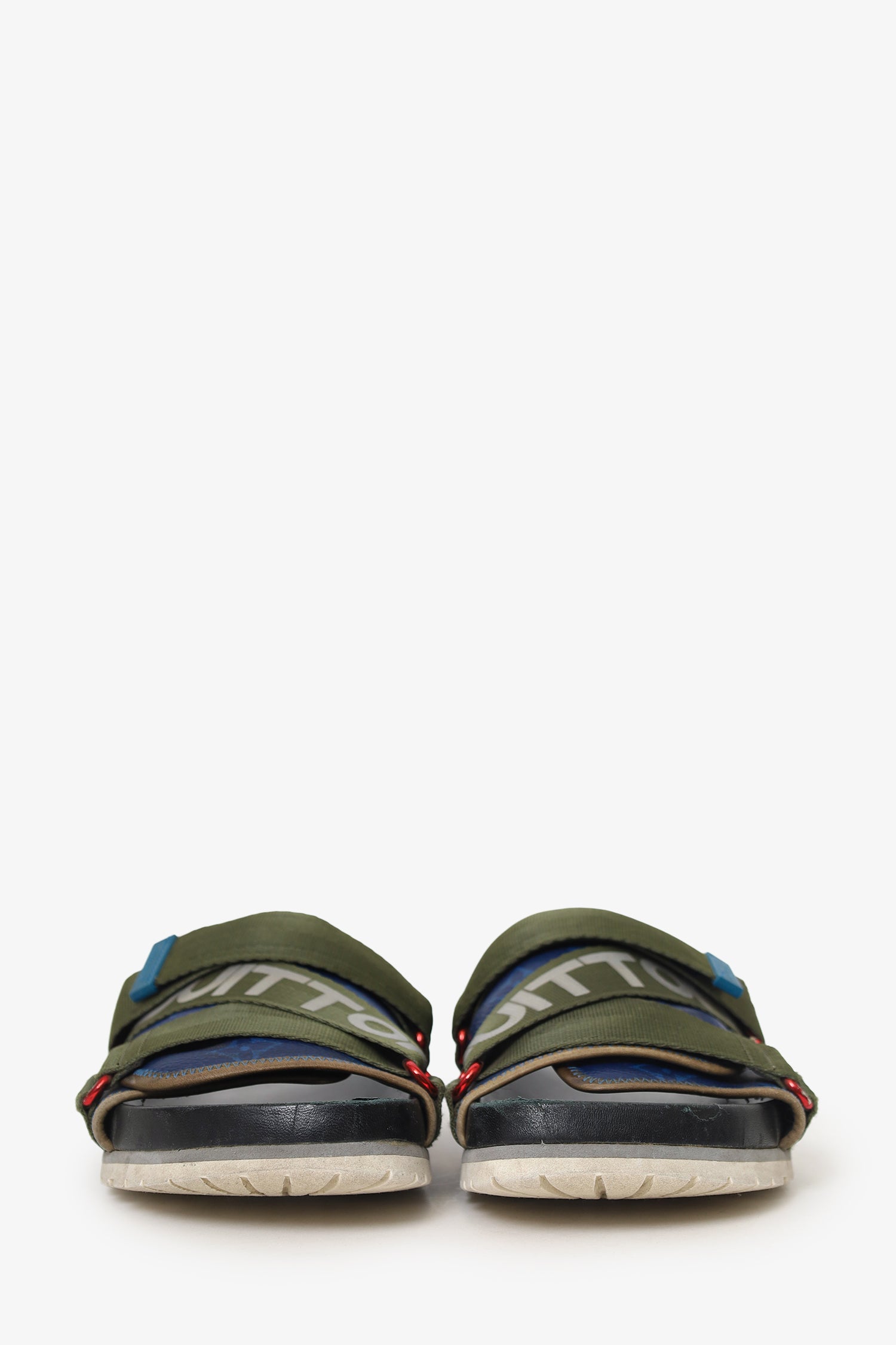 Refresh availabilityLouis Vuitton Green/Black Leather/Canvas Slides. Slip-on. Round toe. 2 exterior adjustable top velcro straps. Contrast and tonal stitching.