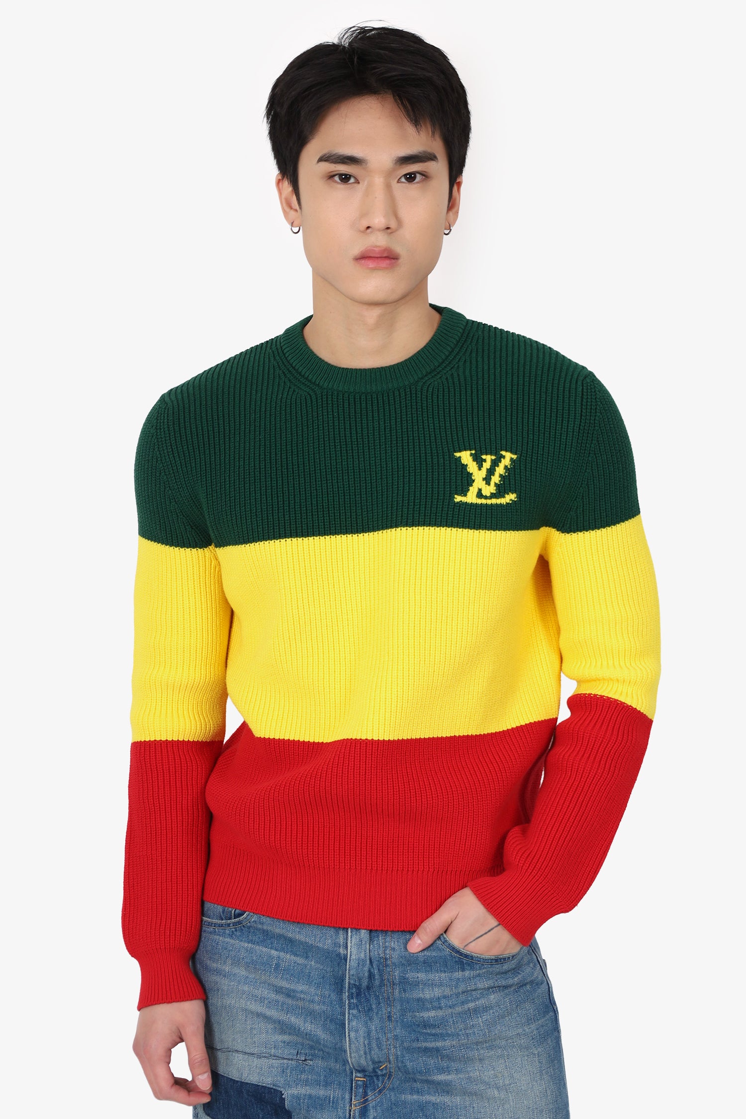 Refresh availabilityLouis Vuitton Green/Yellow/Red Knit Striped Long Sleeve 'LV' Sweater. Pull-on. Round neckline. Ribbed body. Tonal stitching.