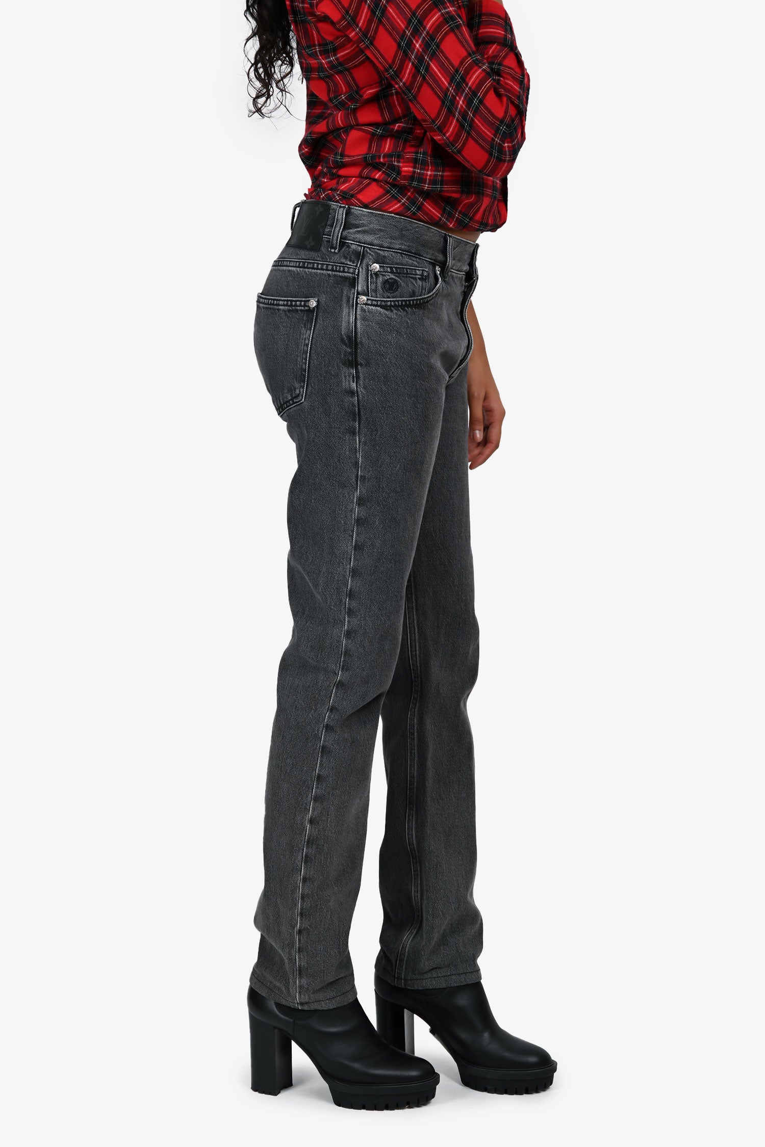 Refresh availabilityLouis Vuitton Grey Denim Straight Jeans. Pull-on. Front zipper fly with button closure. Waistband with belt loops. 3 front slip pockets. 2 rear slip pockets. Rear leather patch monogram detail on waistband. Silver-tone hardware. Tonal stitching.