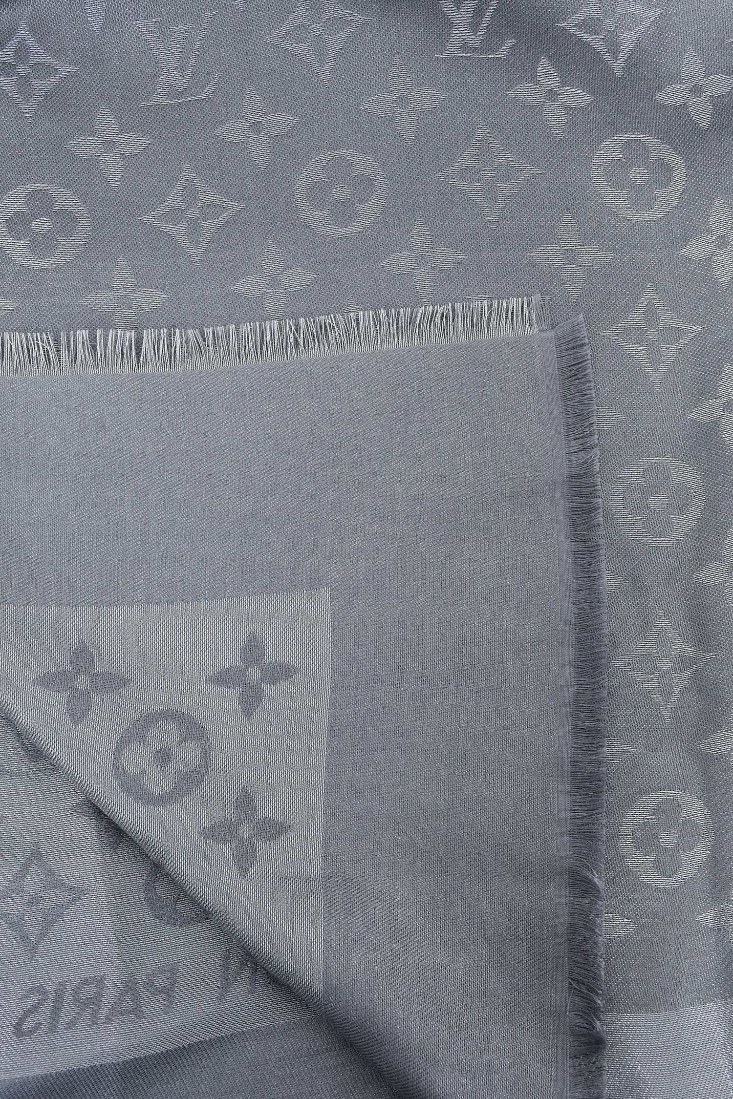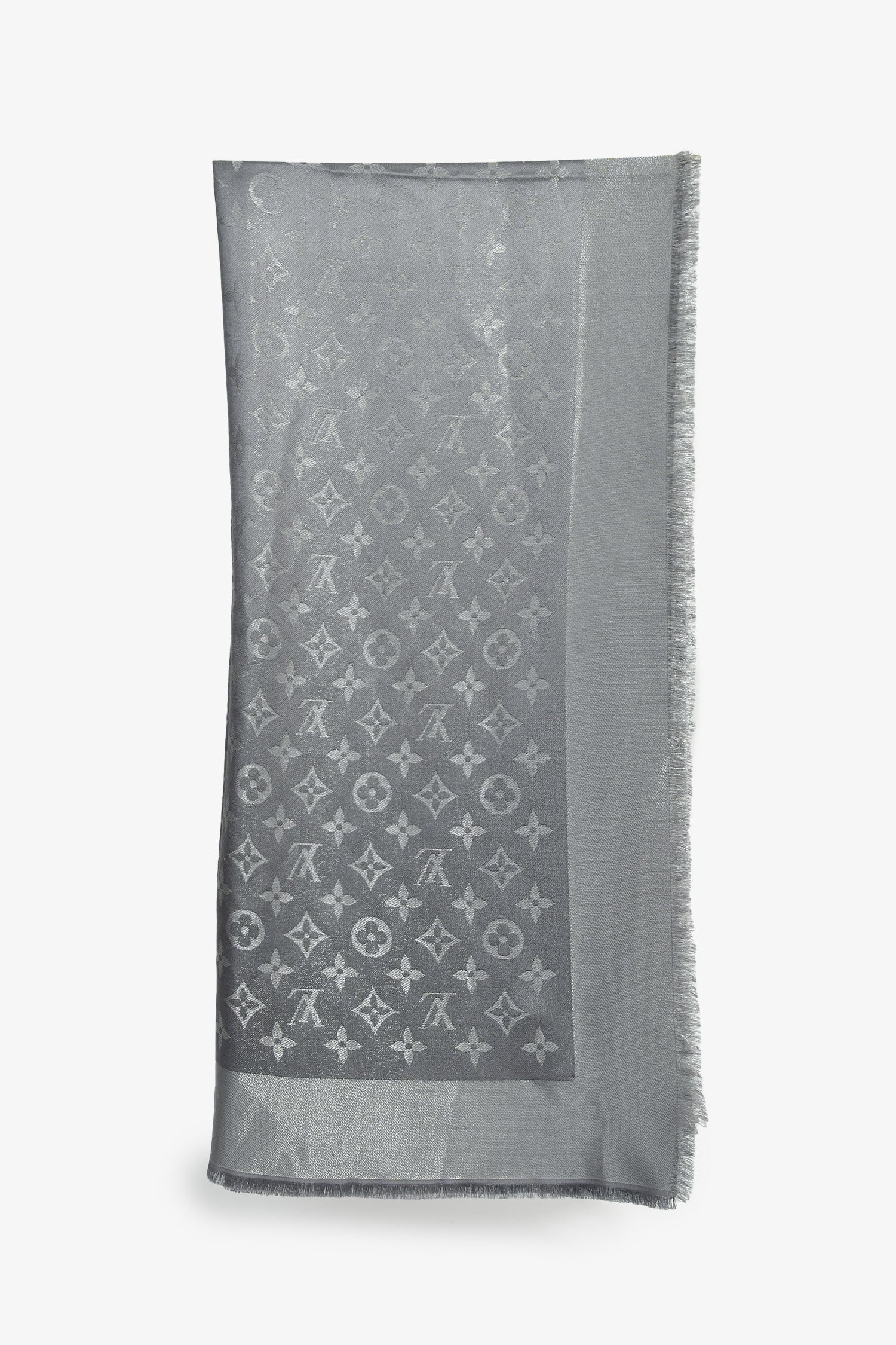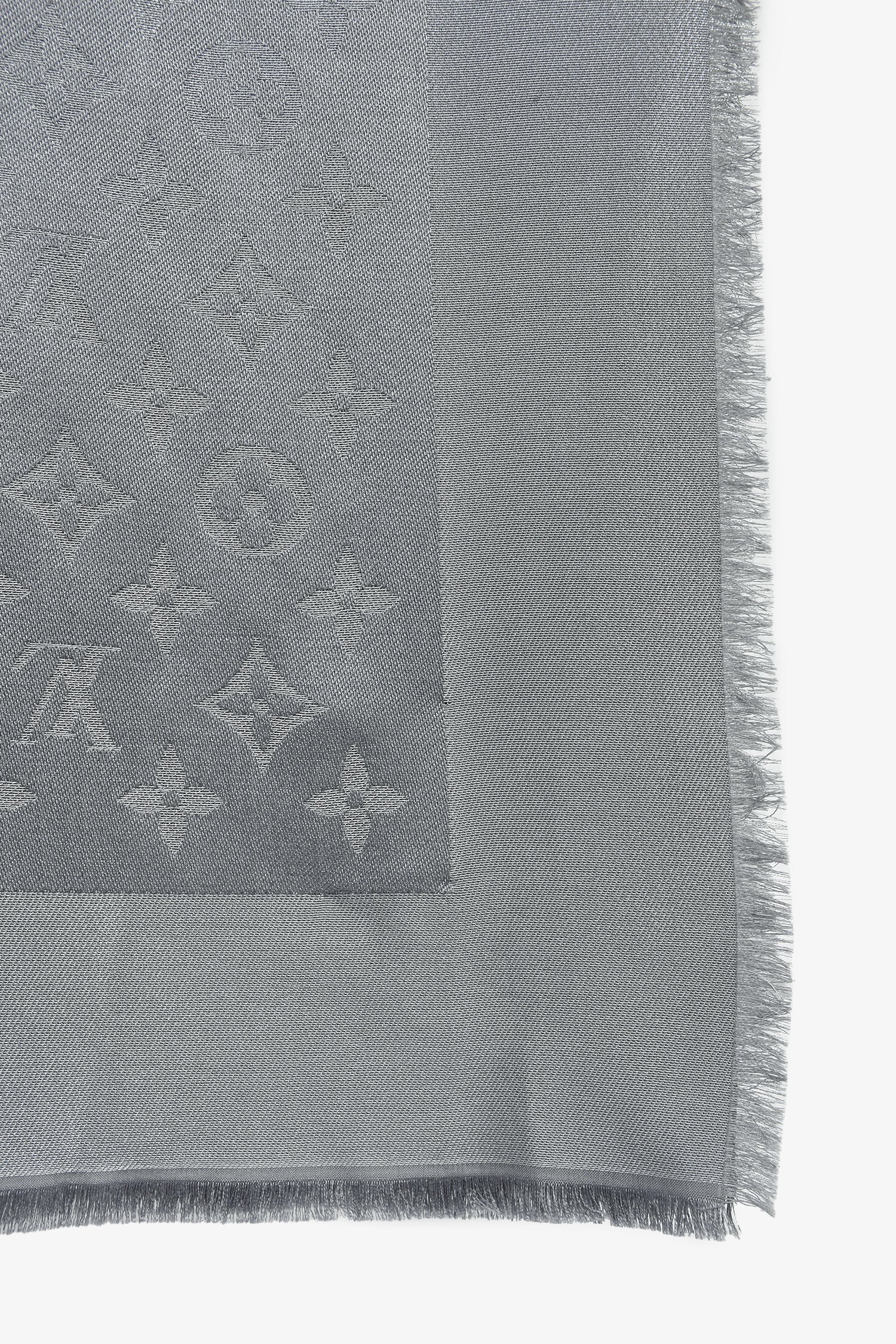 Refresh availabilityLouis Vuitton Grey Monogram Silk Scarf. Fringe ends. Tonal stitching.