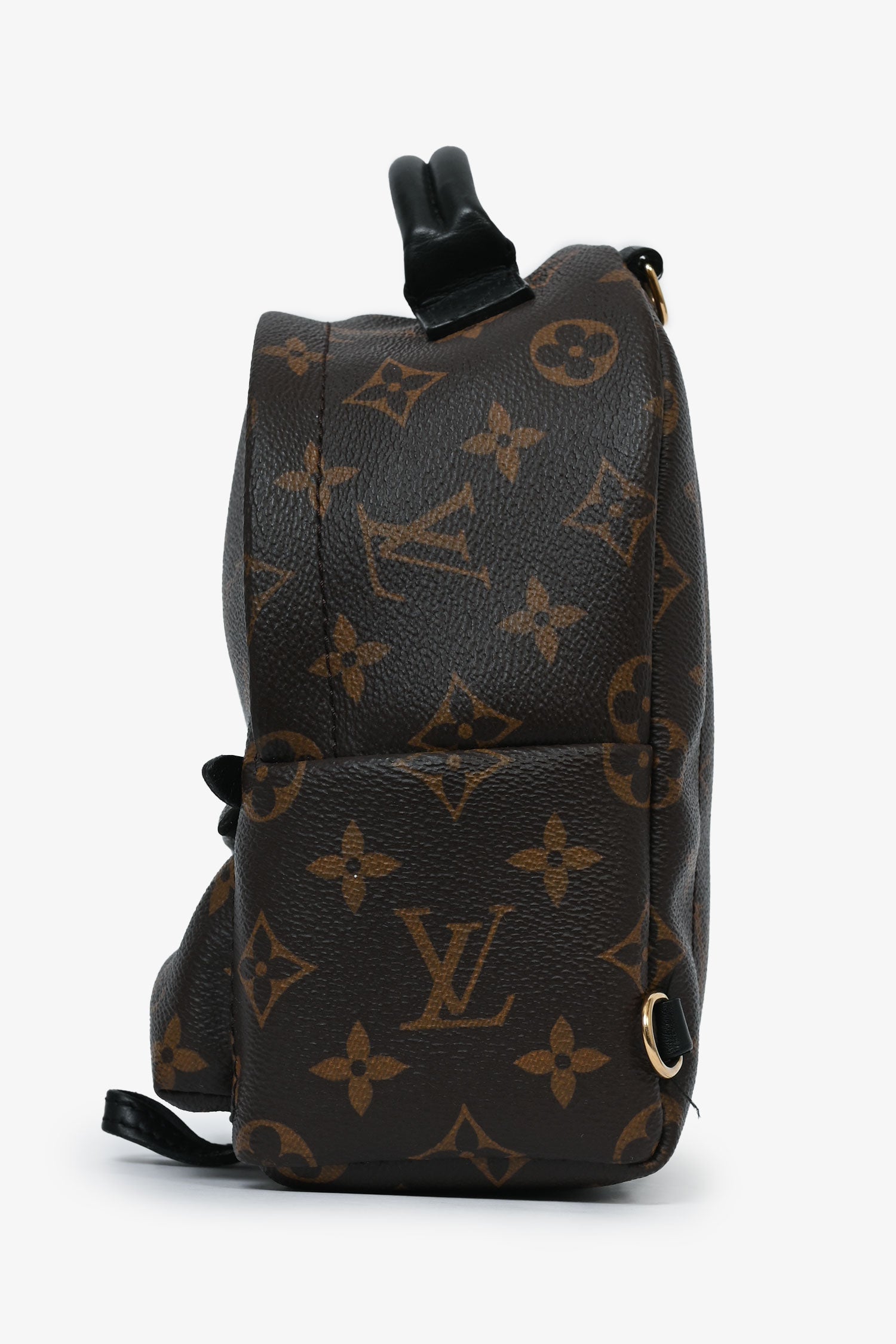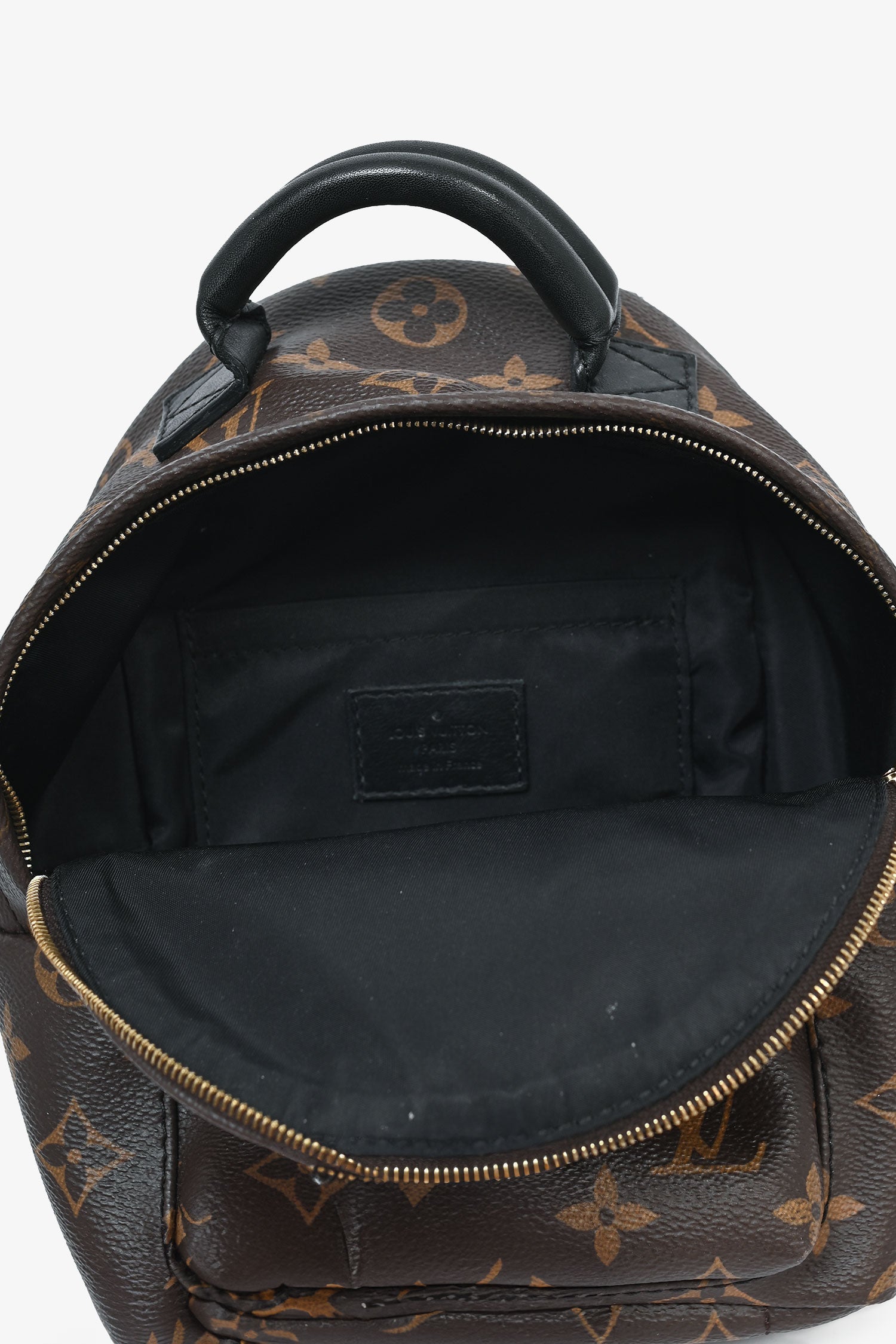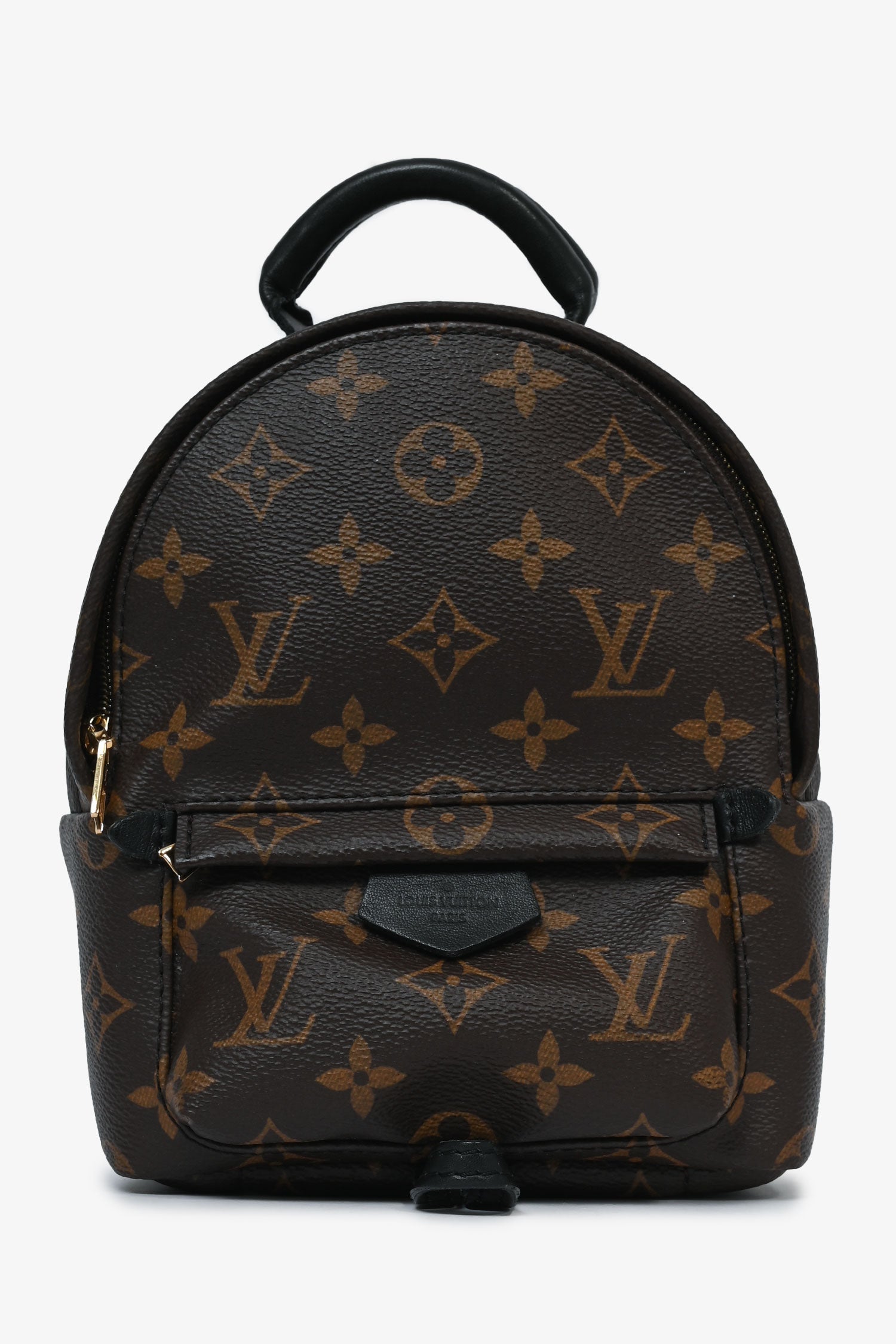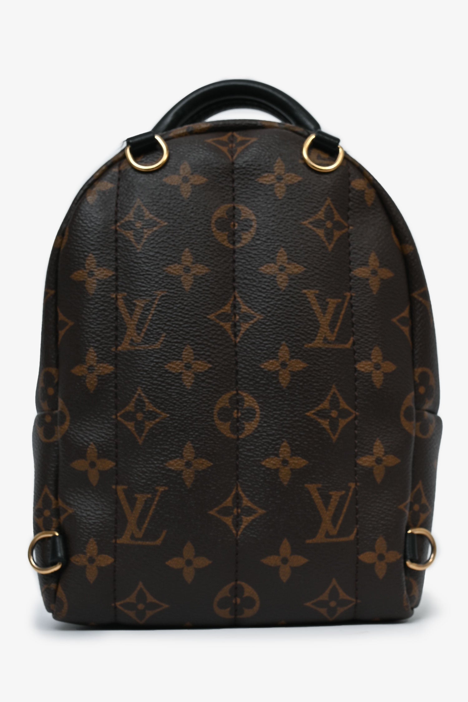 Louis Vuitton Monogram Mini Palm Springs Backpack. Monogram coated canvas. Gold-tone hardware. Front pocket with a zipper. Padded top handle. Lined interior with a slip compartment. 2 shoulder straps. Tonal stitching.