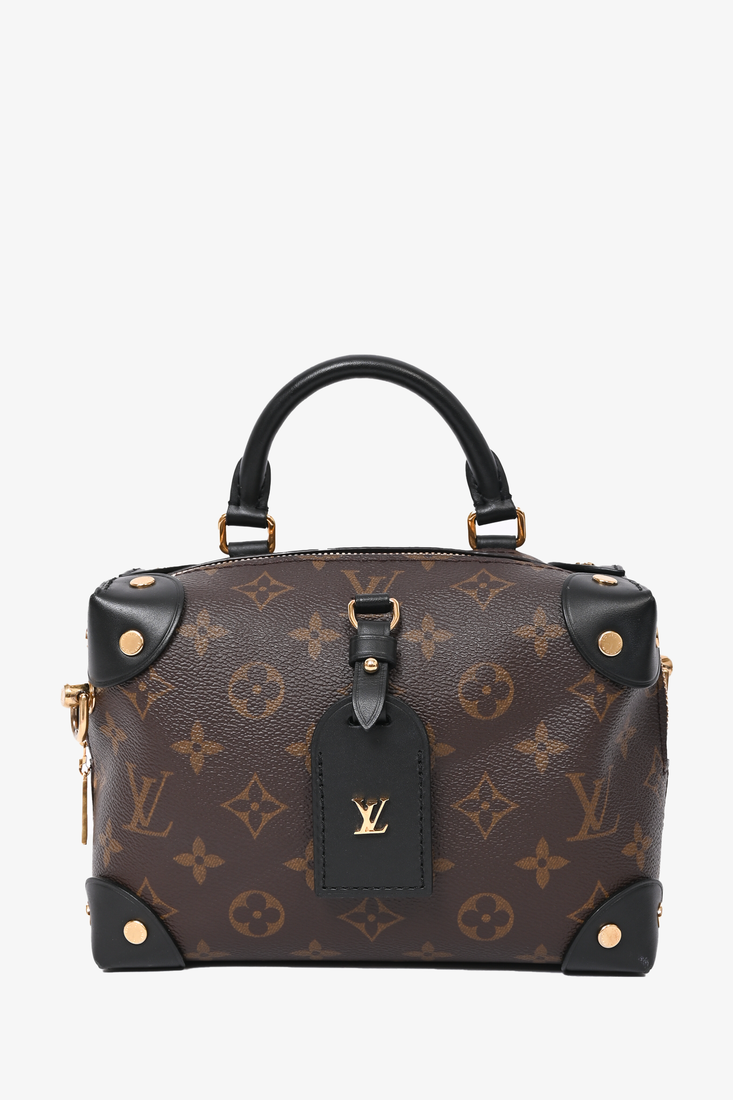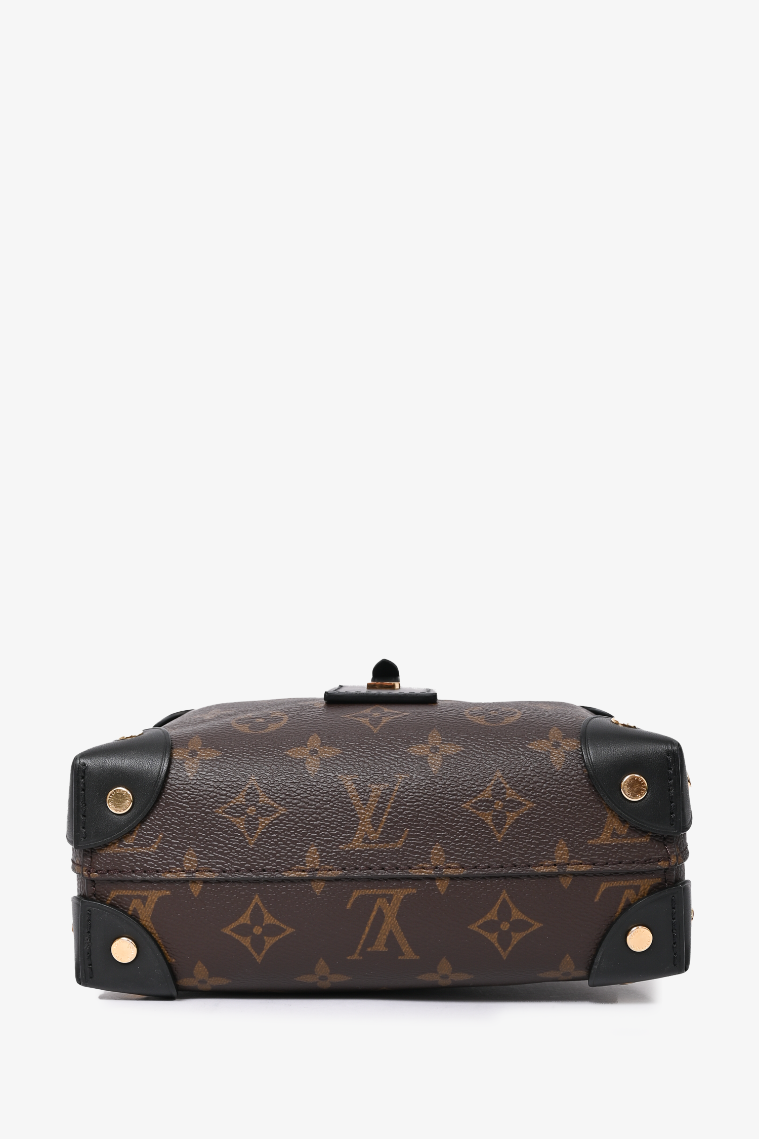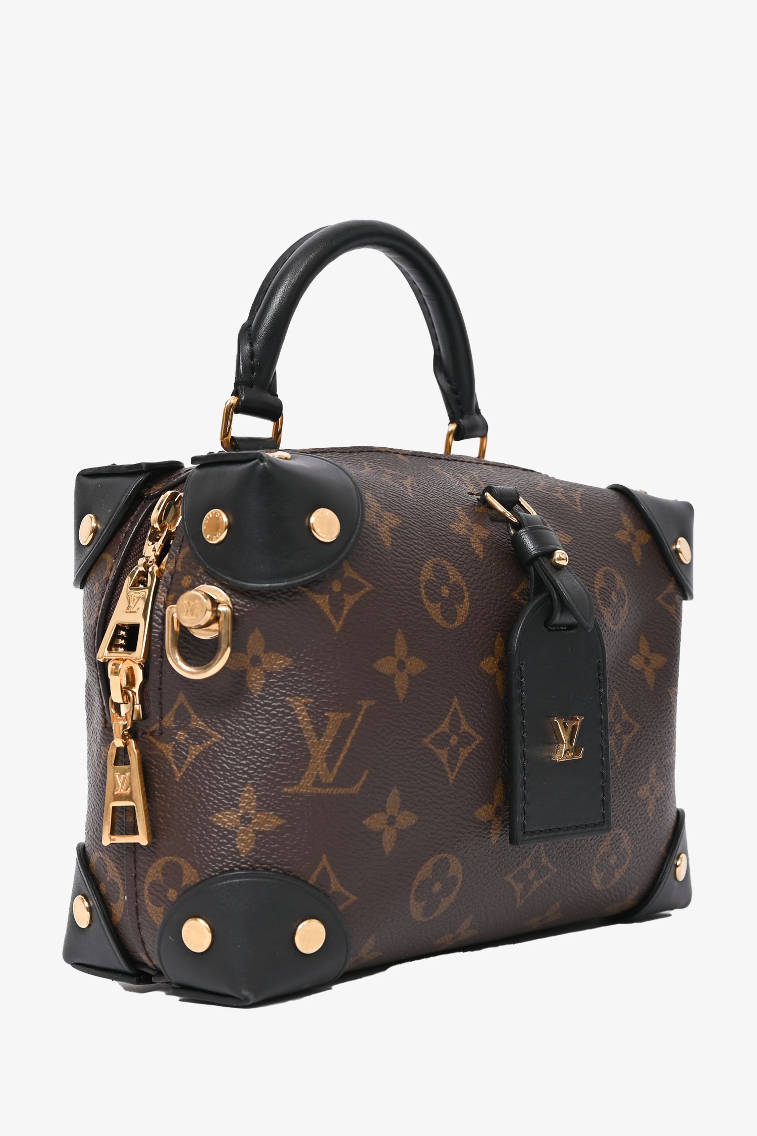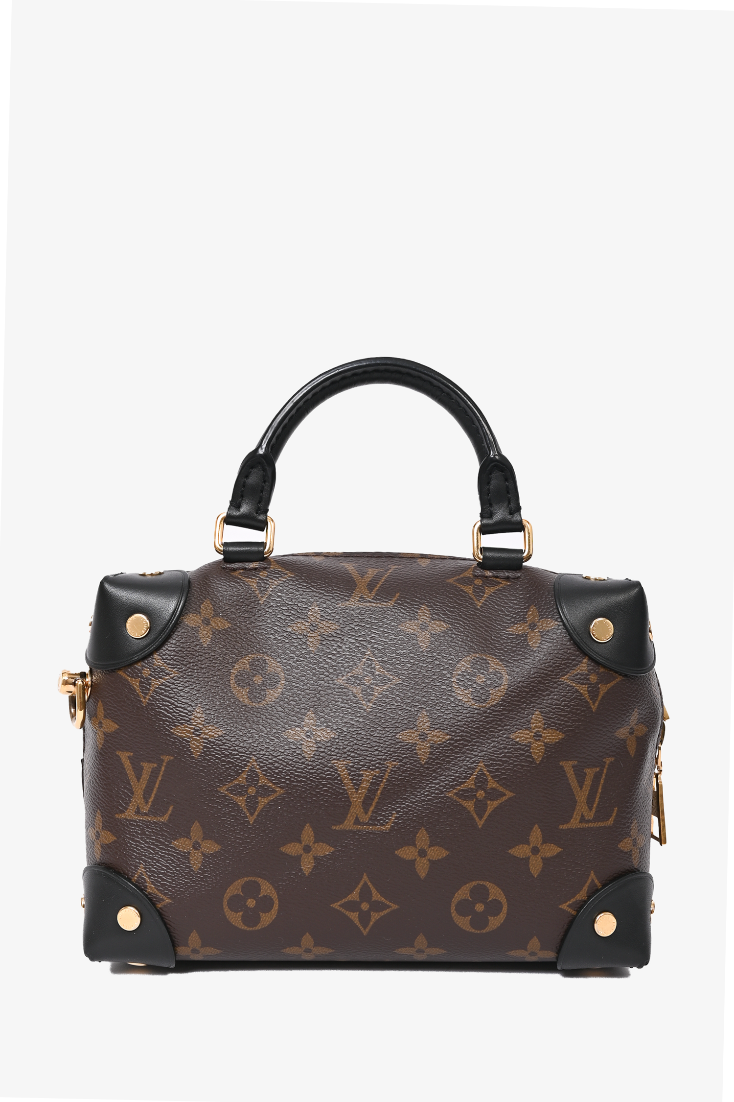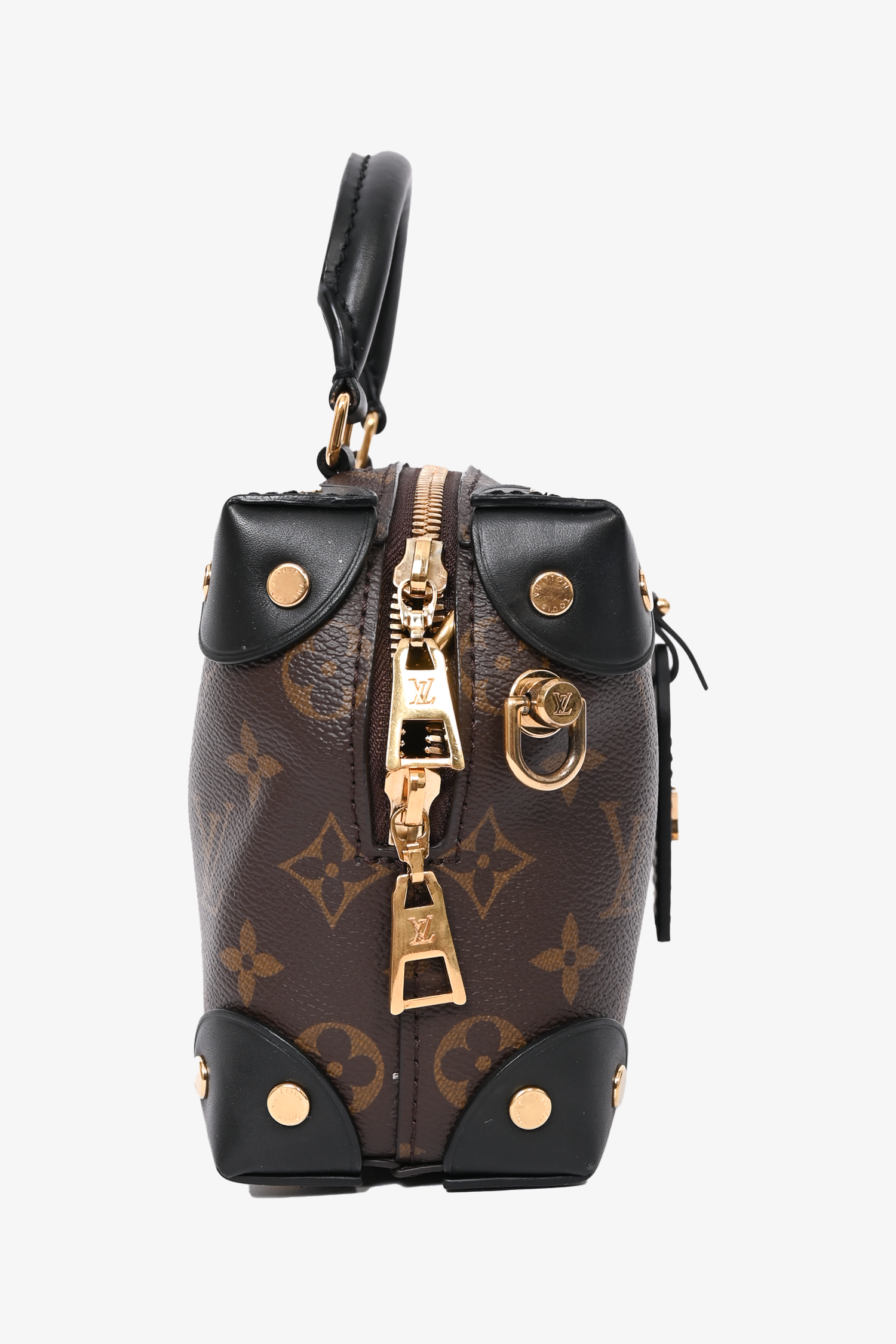 Louis Vuitton Monogram Petite Malle Souple Crossbody. Single top rolled handle. Top zip closure. Black textile interior lining. Single interior wall zip pocket. Removable and interchangeable straps. Gold-tone hardware. Tonal stitching. Detachable luggage tag.