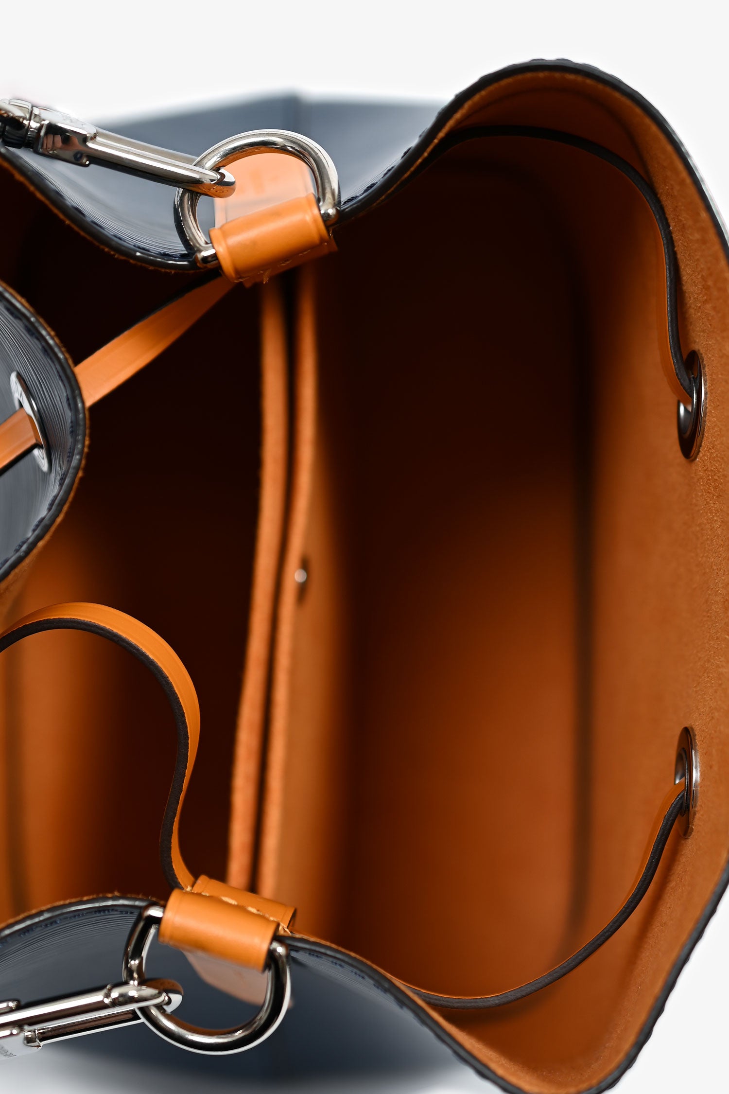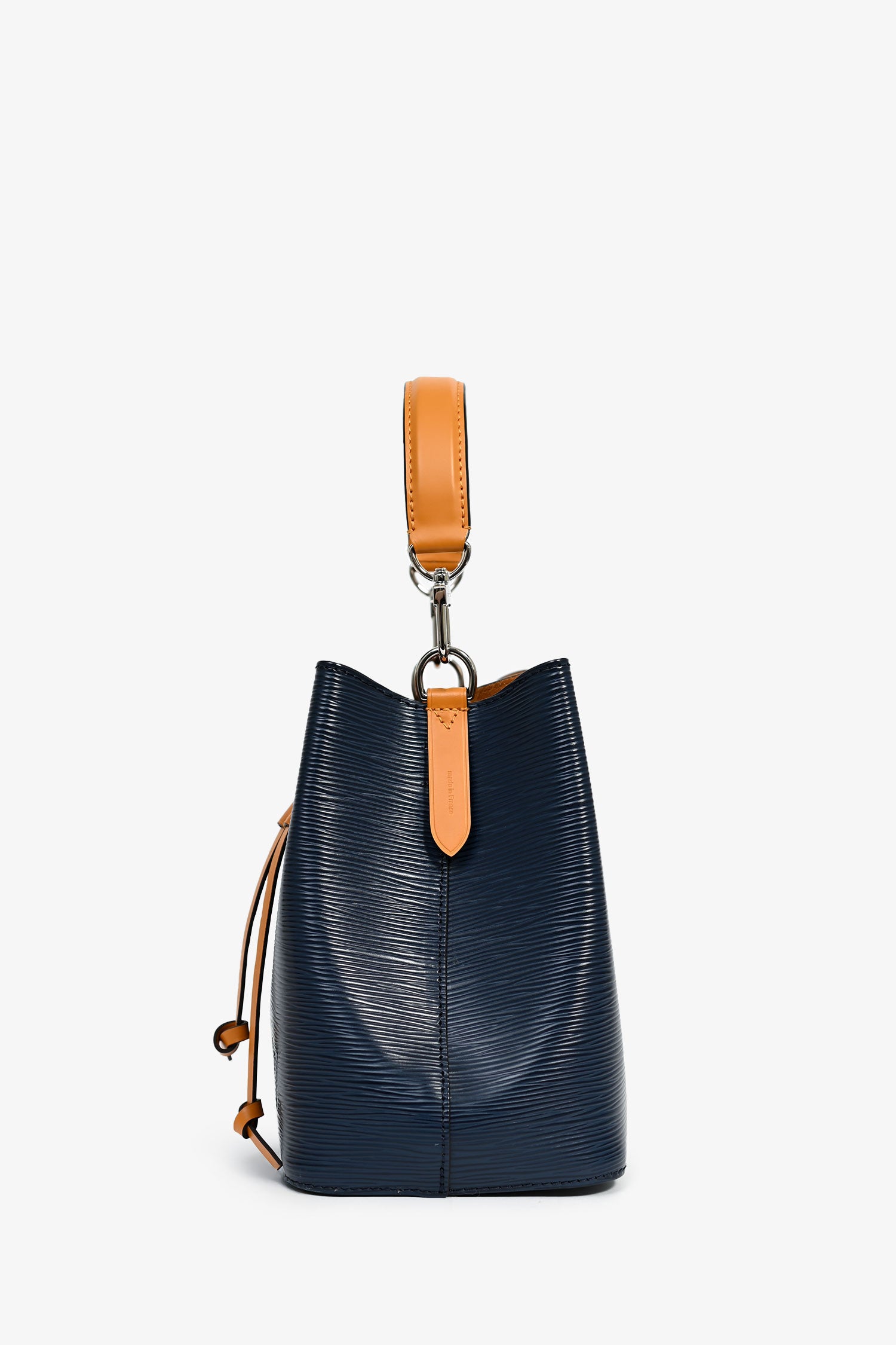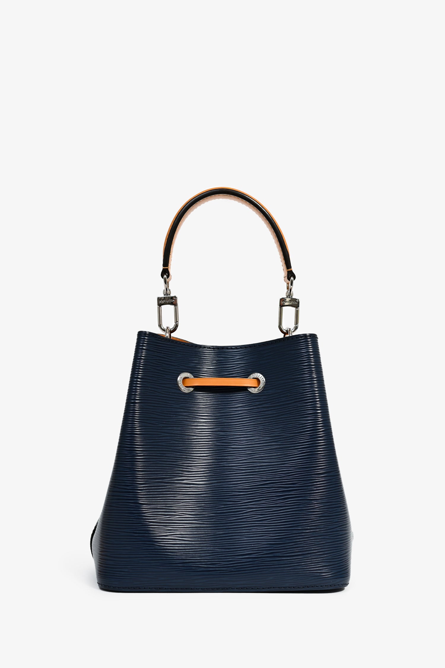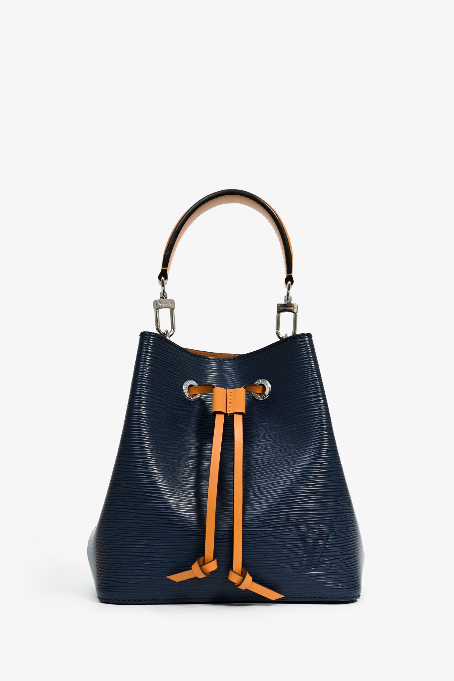 Refresh availabilityLouis Vuitton Navy Blue Epi Leather/Mustard Yellow NéoNoé BB Bucket Bag. Front drawstring closure. 2 open compartments and a pocket with snap button closure. Detachable straps and handle. Silver-tone hardware. Suede lining. Tonal stitching.