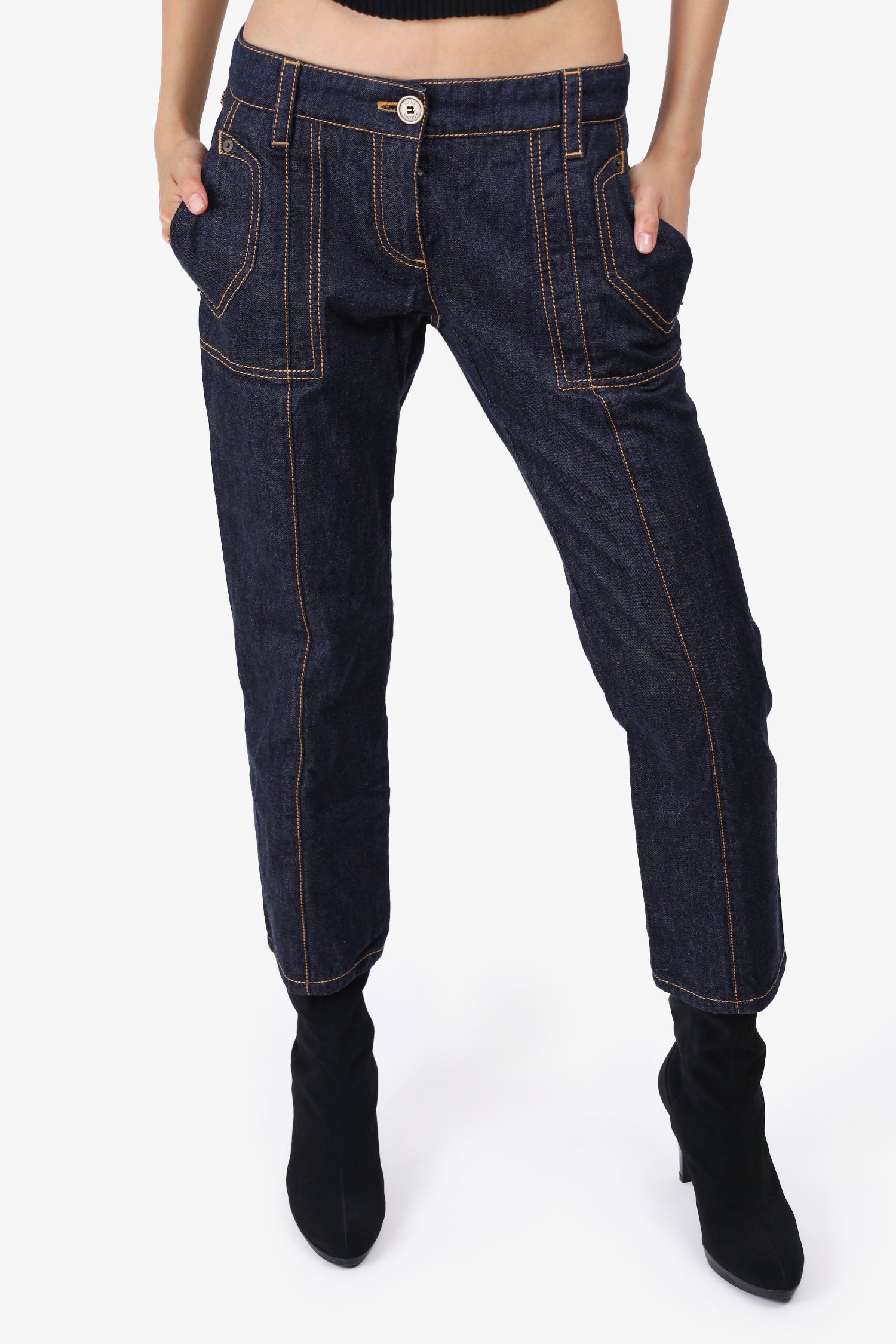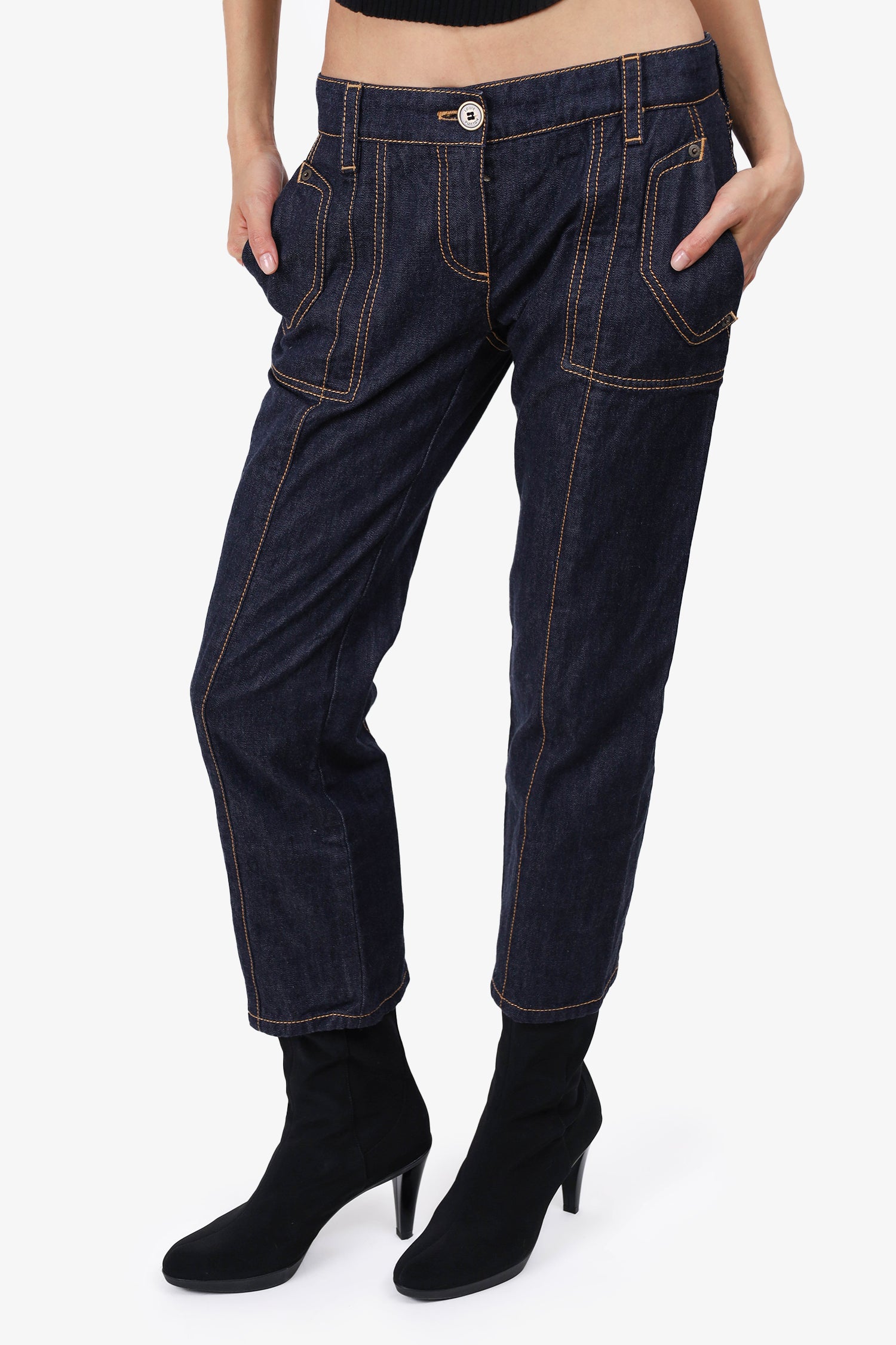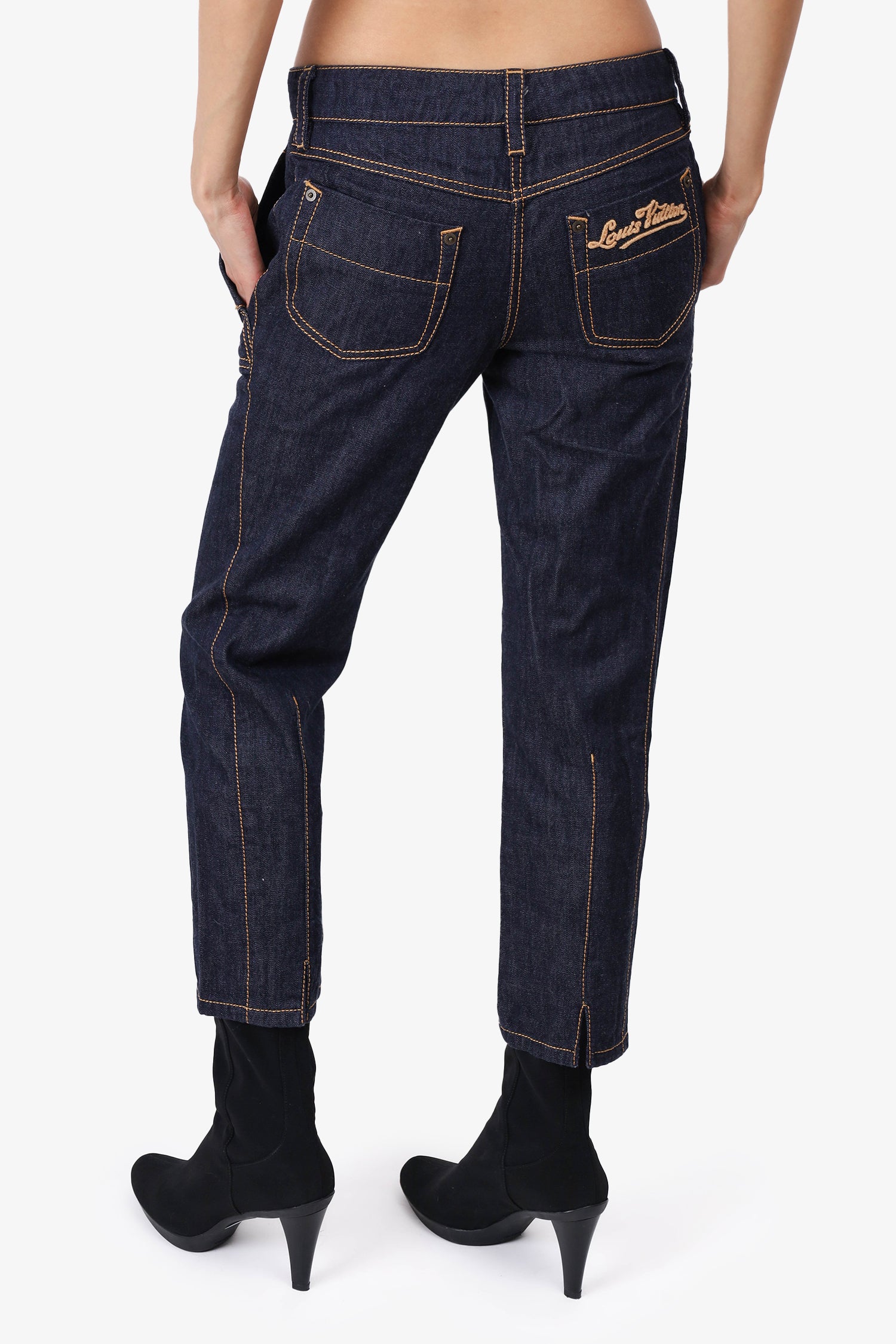 Refresh availabilityLouis Vuitton Navy Denim Contrast Stiching Capri Jeans. Front button and zip closure. Front and rear slip pocket. Waist belt loops. Contrast stitching.