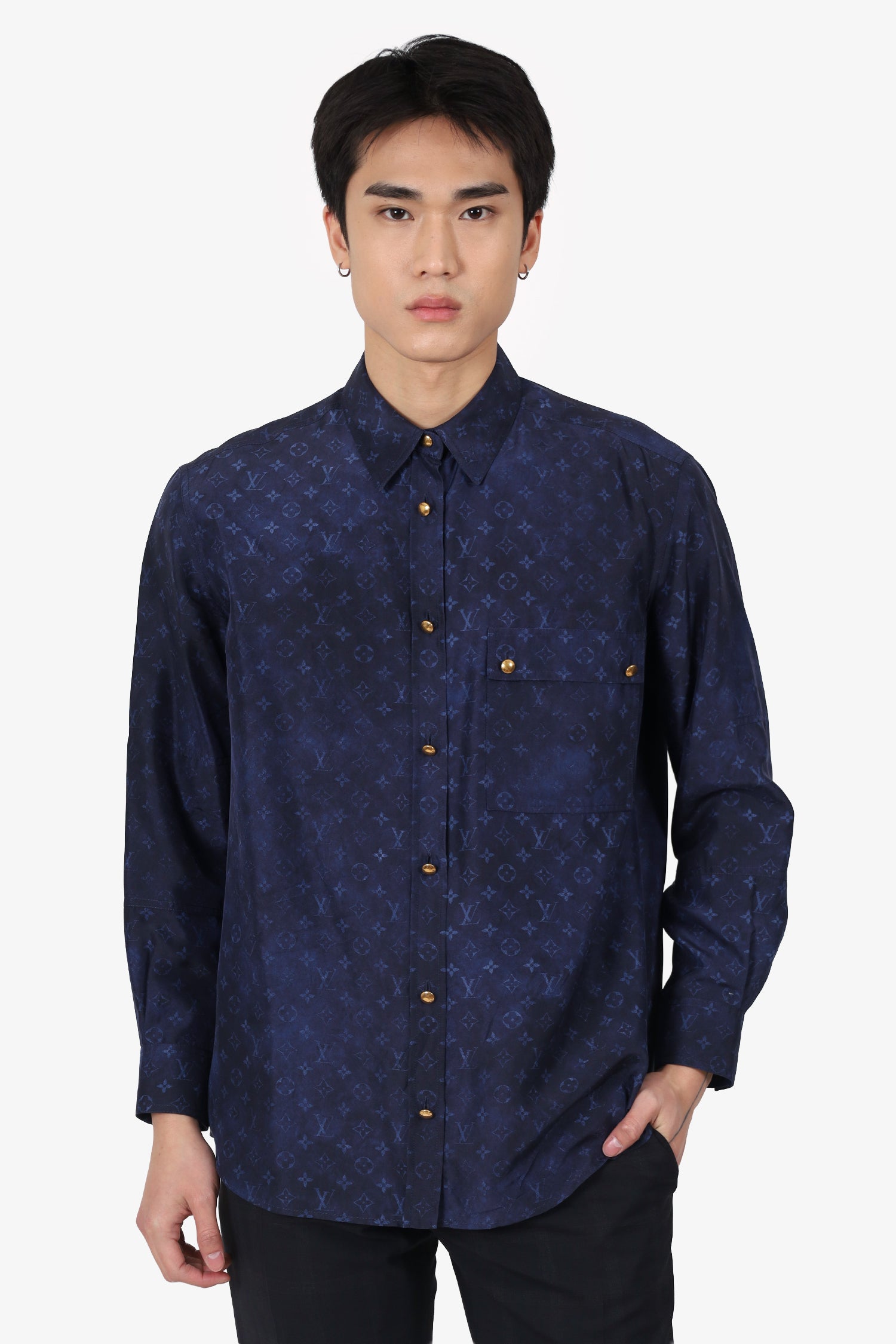 Refresh availabilityLouis Vuitton Navy/Blue Silk Monogram Shirt. Pull-on. Collared-neckline. Front button-up closure. Sleeve cuffs with button-up closure. Single exterior chest flap pocket with button-up closure. Gold-tone hardware. Tonal stitching.