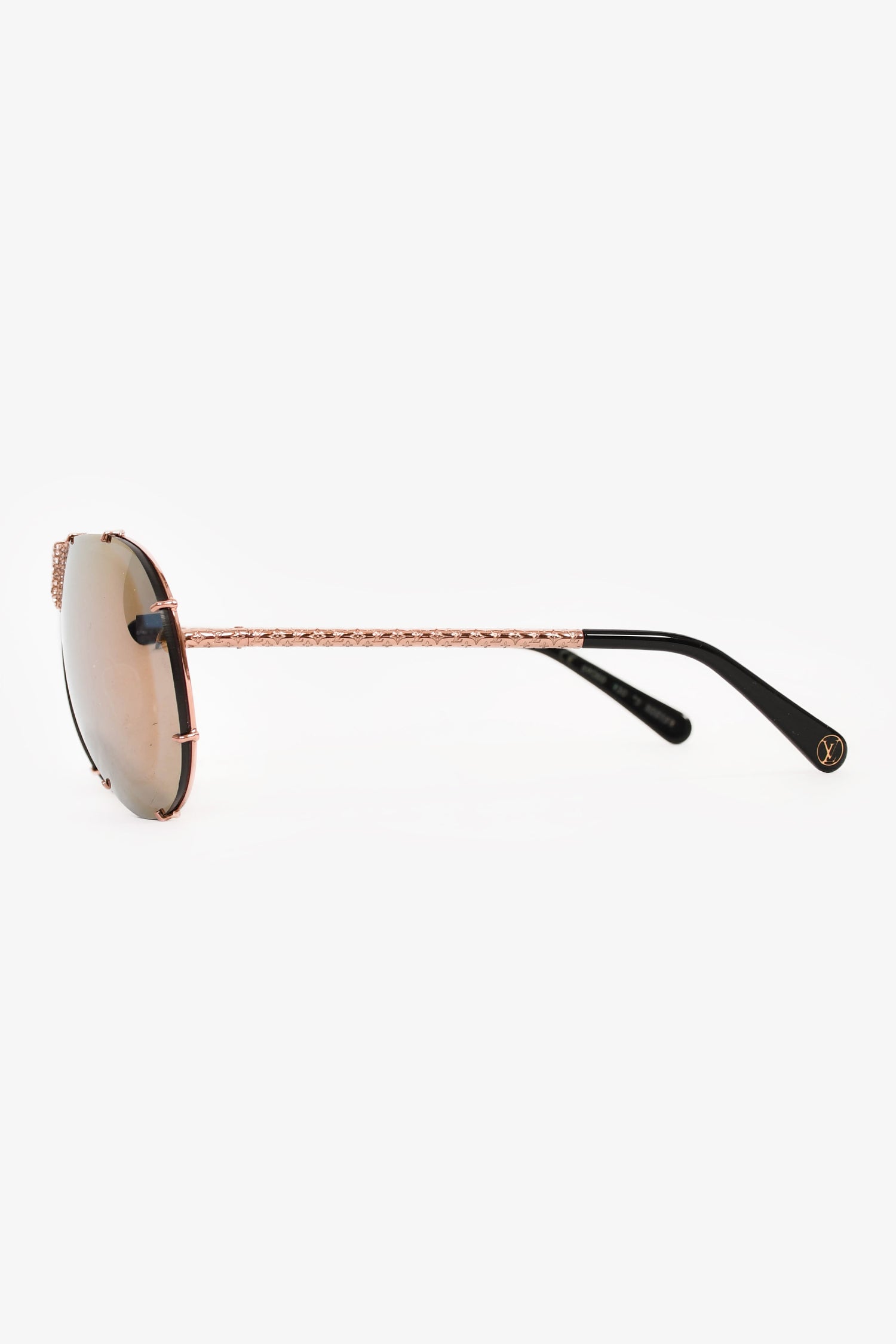 Refresh availabilityLouis Vuitton Pink Metal V Crystal 'Drive' Aviator Sunglasses. Mirrored lens. Adjustable nose pads. Rose gold-tone hardware.