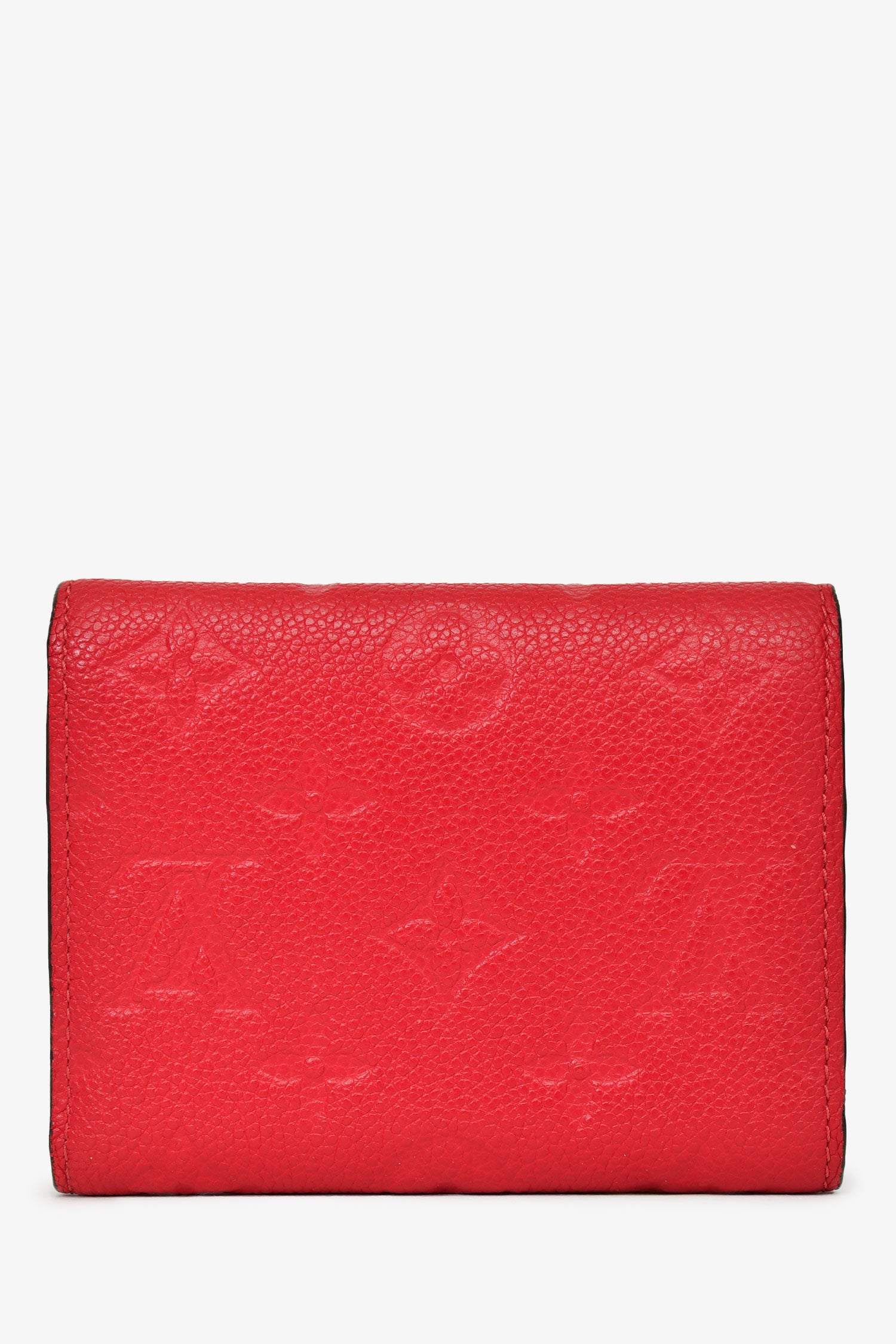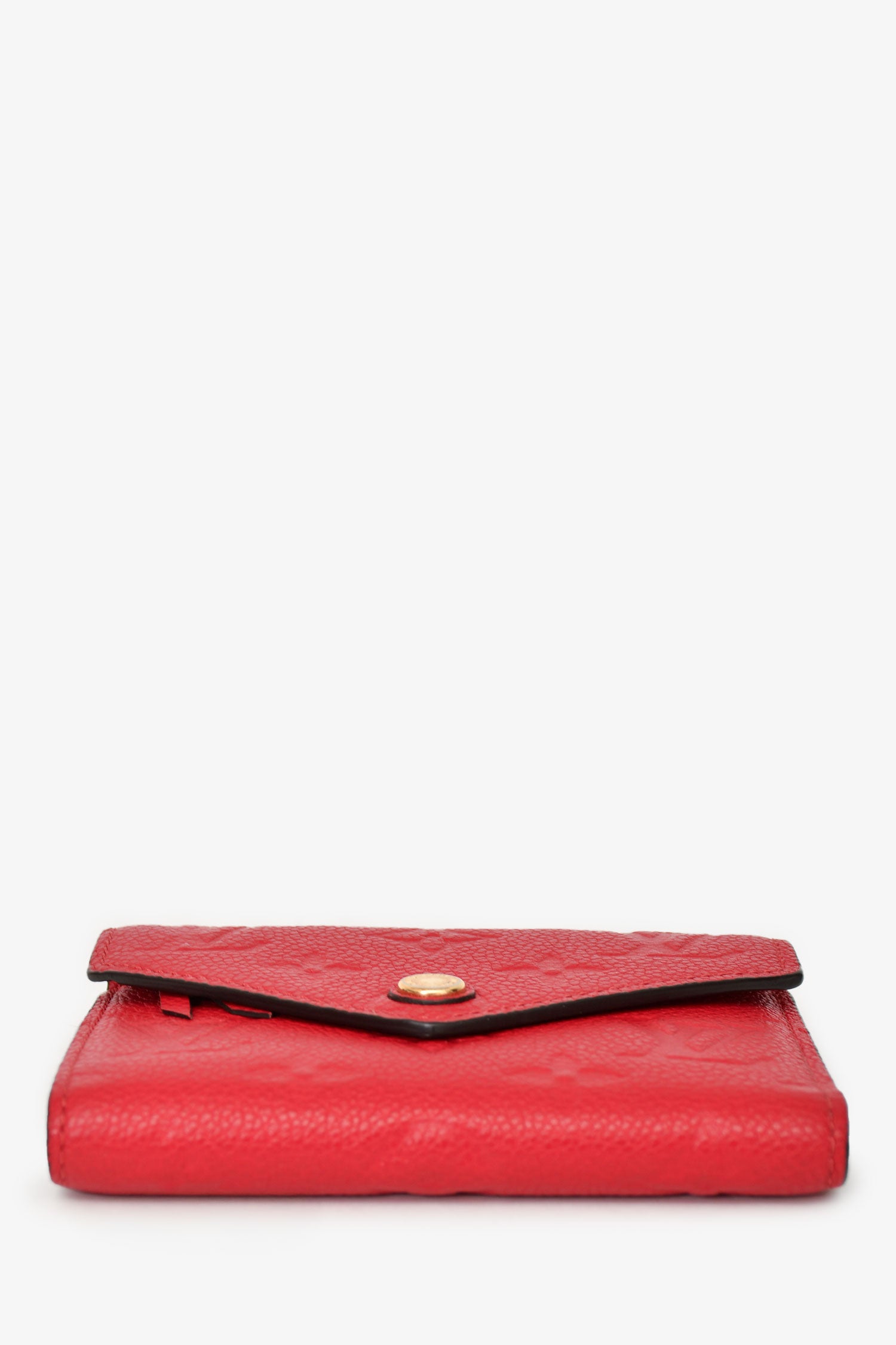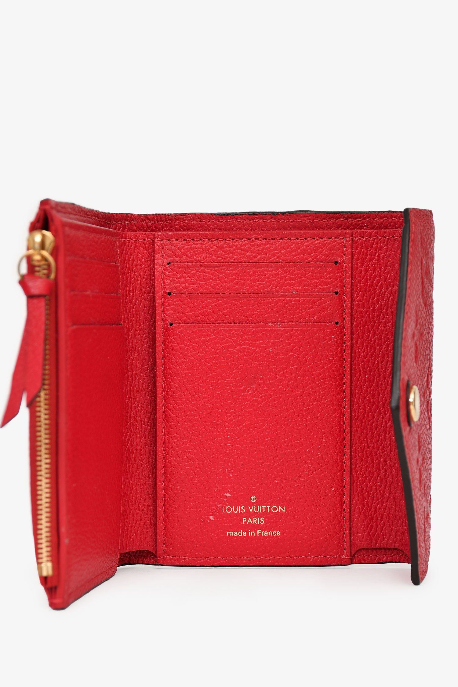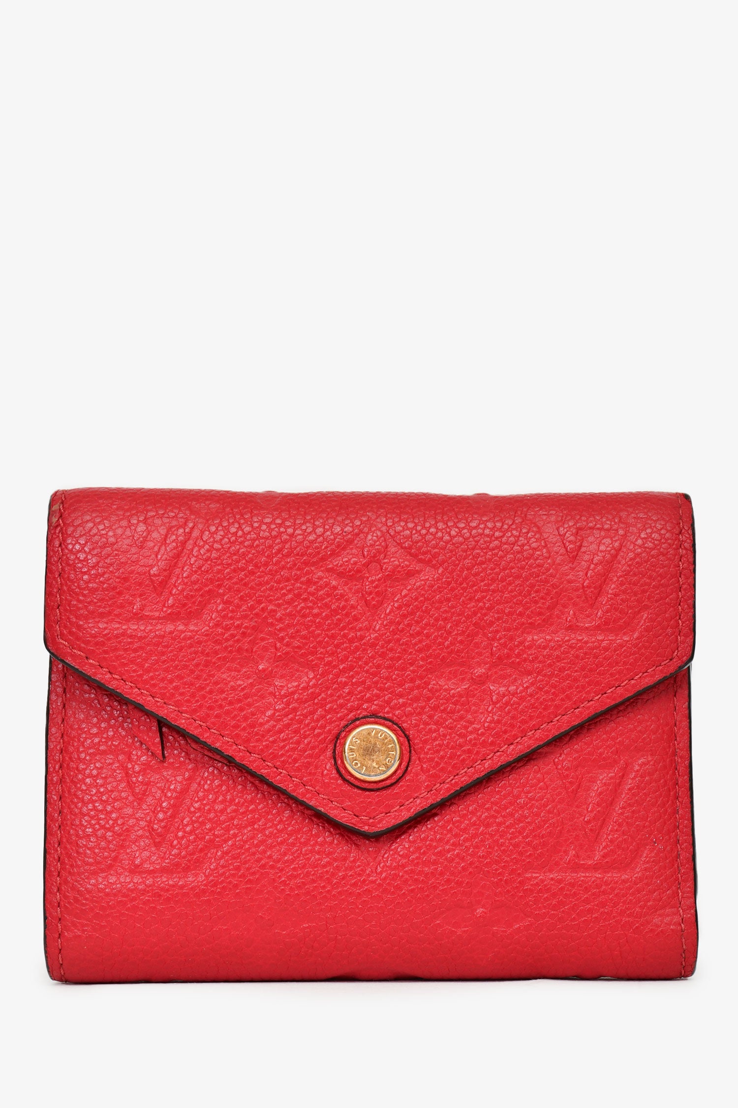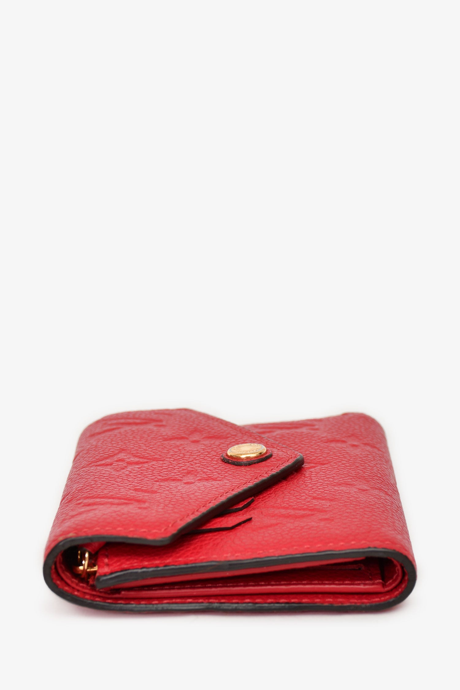 Refresh availabilityLouis Vuitton Red Monogram Empreinte 'Victorine' Wallet. Fold-over flap with snap button closure. Interior bill compartment. Zip coin pocket. Eight card slots. Gold-tone hardware. Tonal stitching.