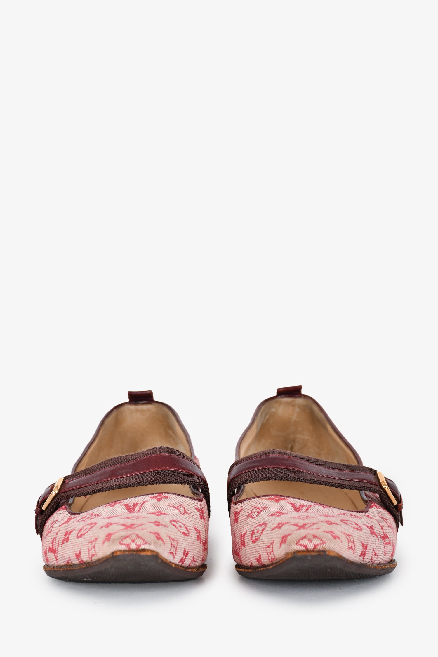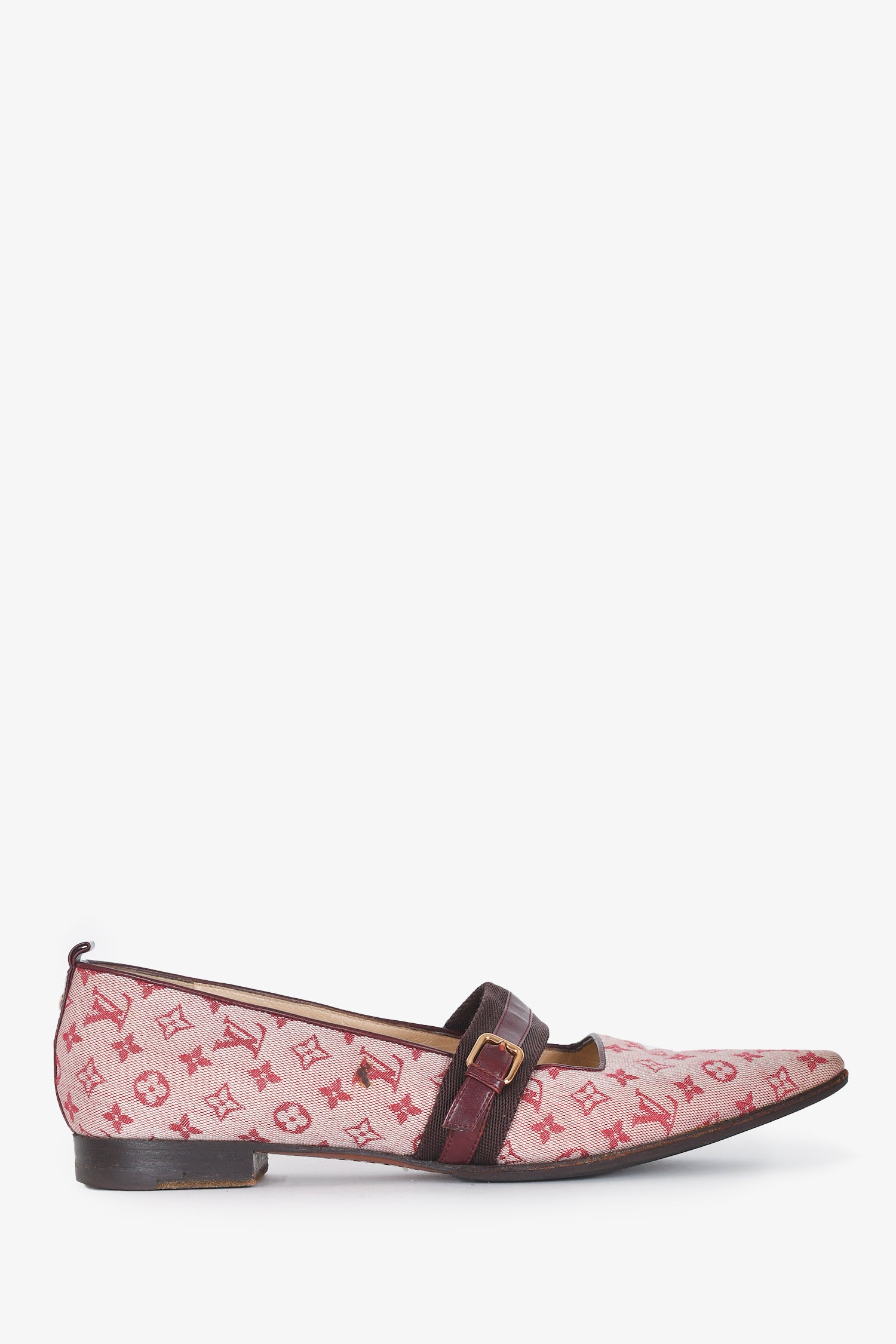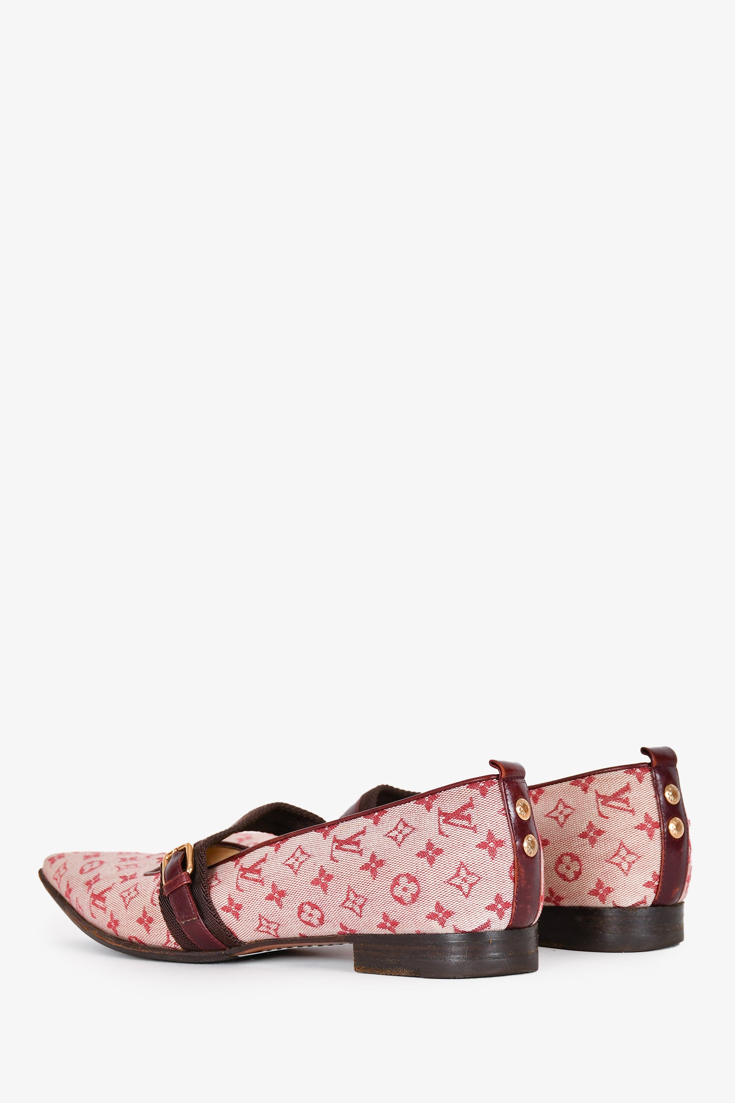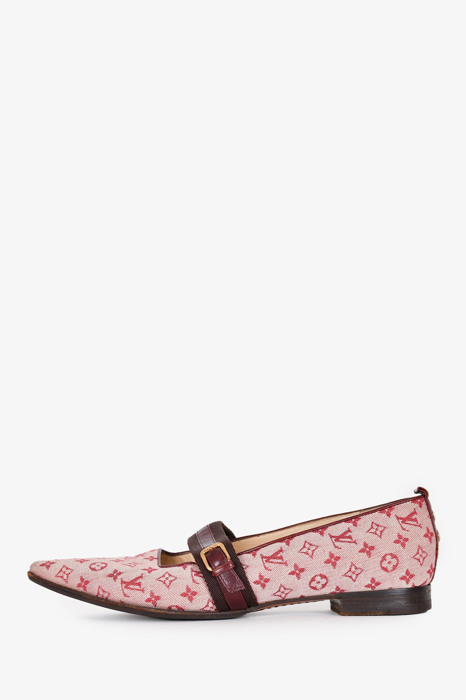 Refresh availabilityLouis Vuitton Red Monogram Mary Jane Flats. Tapered square toe. Slip-on. Topy soles. Tonal stitching.