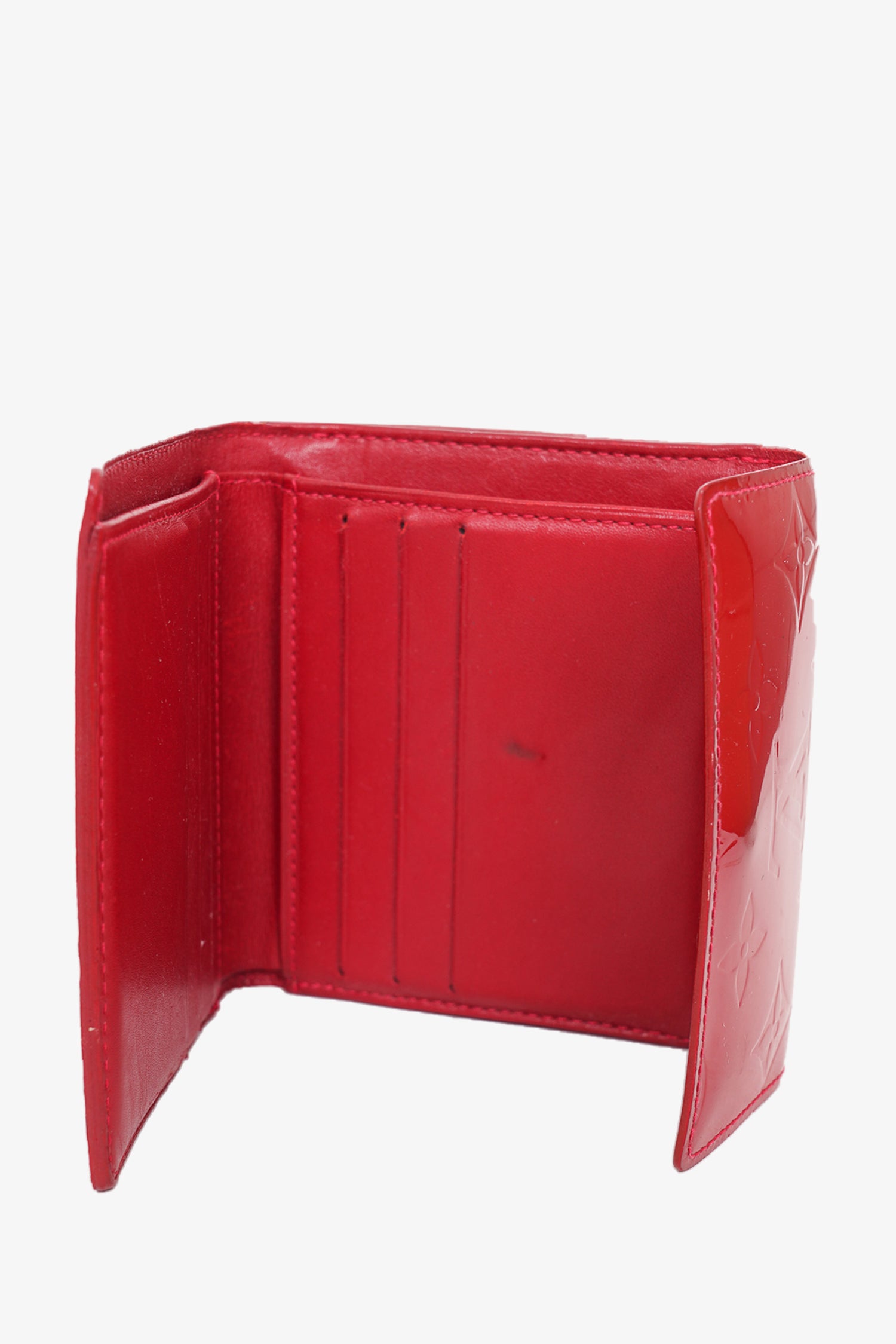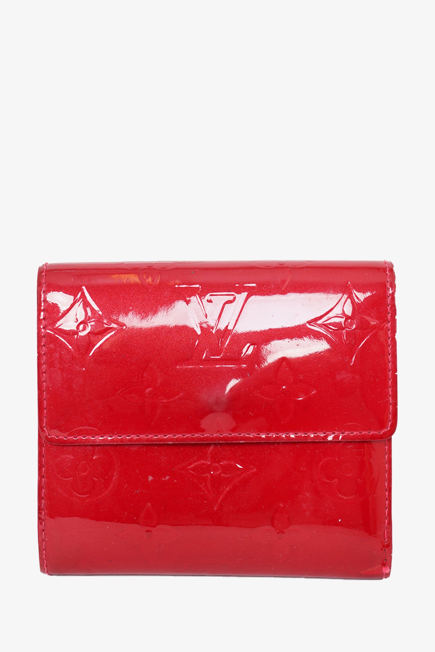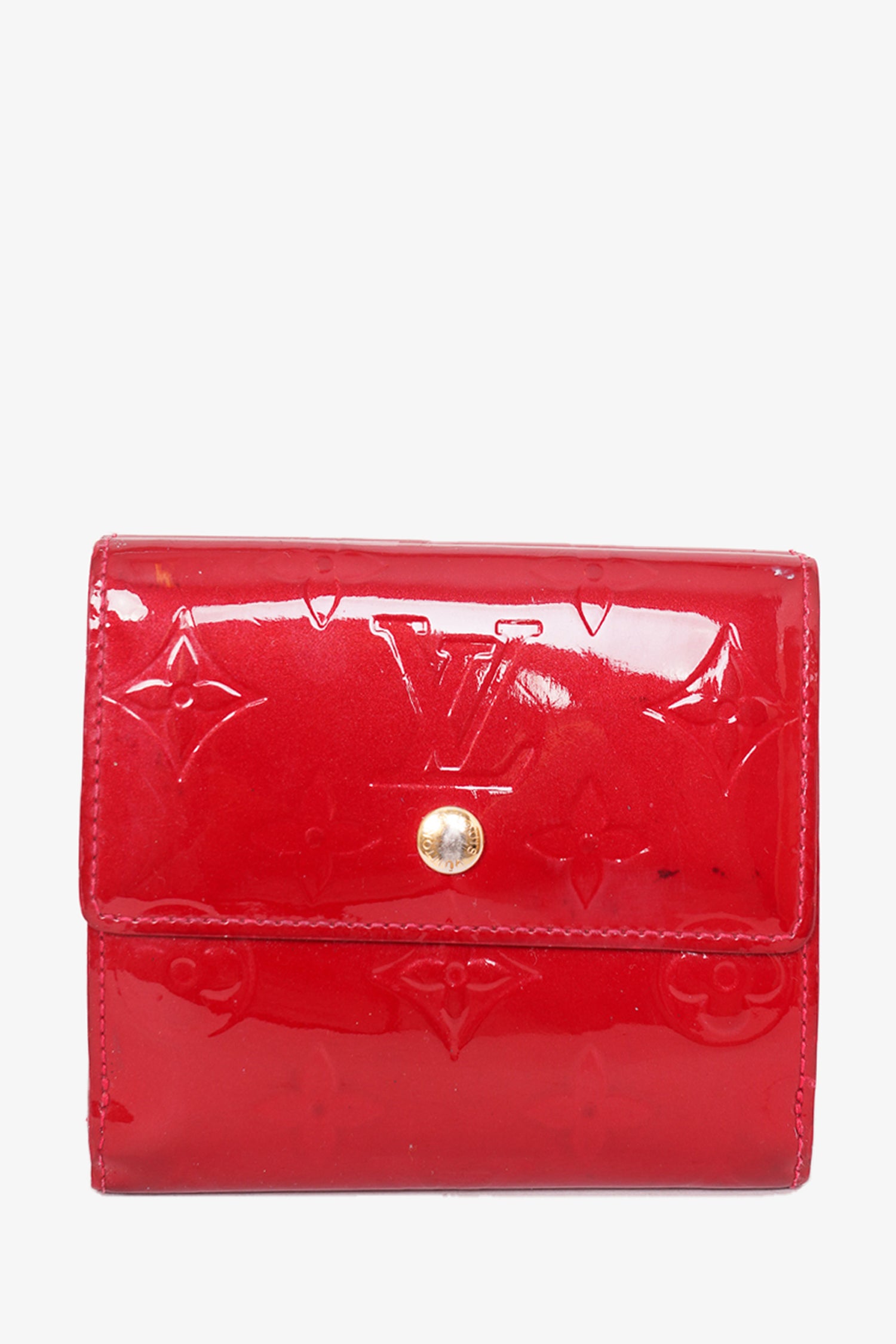 Refresh availabilityLouis Vuitton Red Patent Monogram Vernis 'Elise' Wallet. fold-over flap with snap closures. 8 card slots. 1 bill compartment. 1 coin compartment with snap closure. Gold-toned hardware. Tonal stitching.