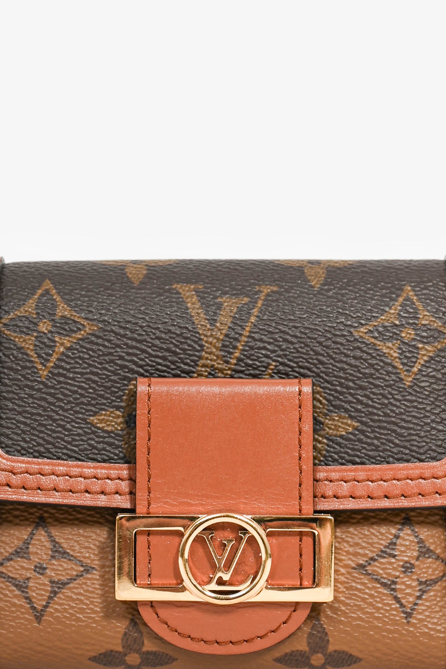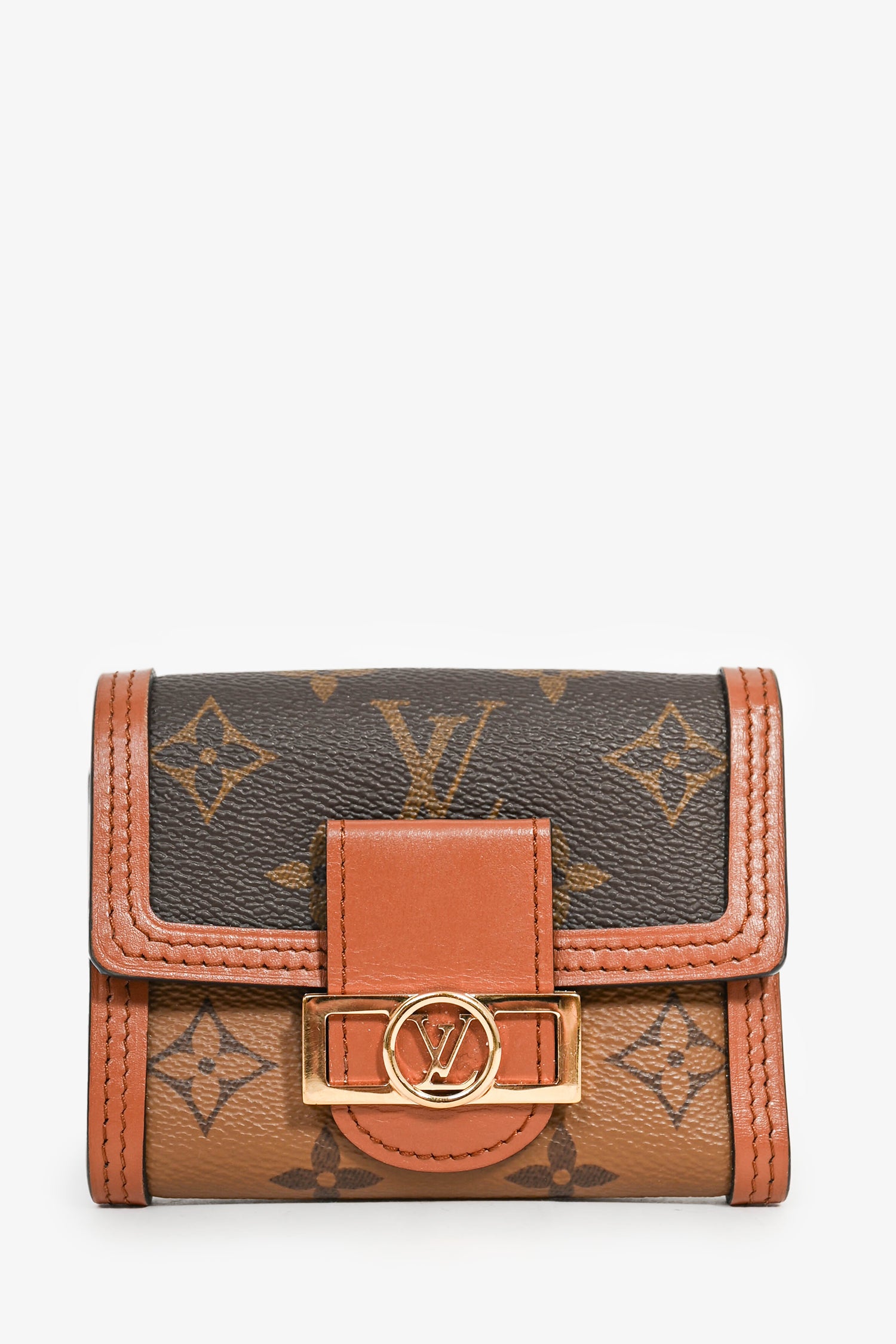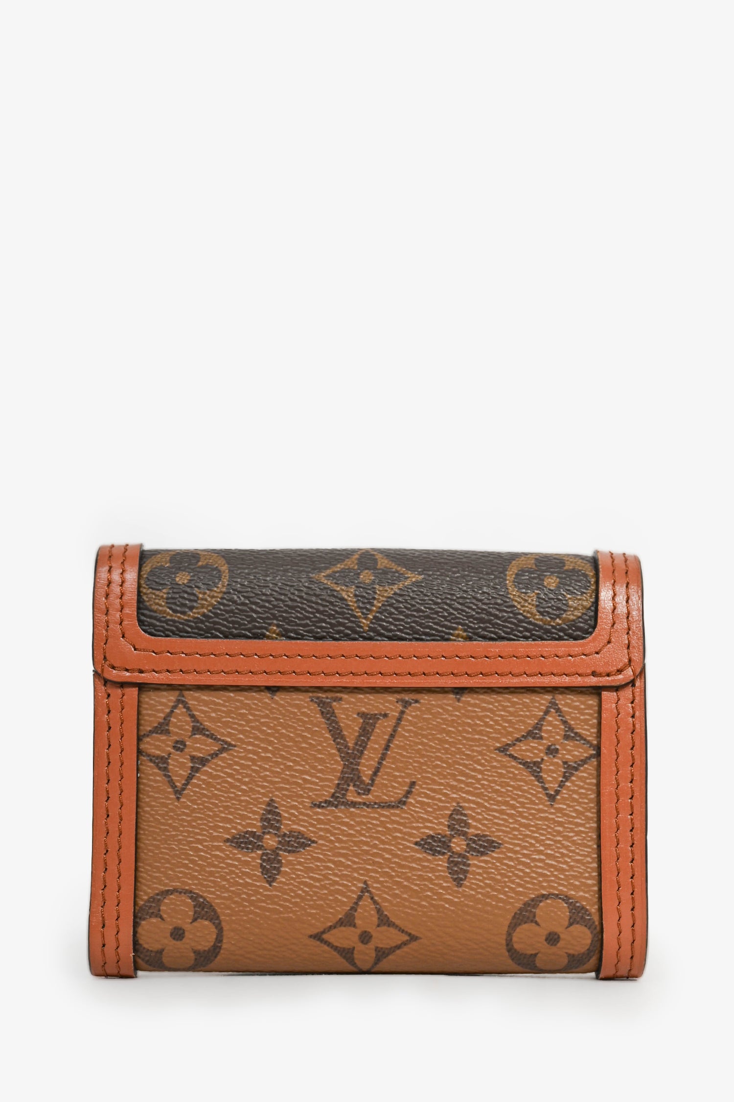 Refresh availabilityLouis Vuitton Reverse Monogram Dauphine Compact Wallet. Gold-tone hardware. Leather trimming. Coated canvas. Tri-fold. 8 card slots. 1 bill compartment. Tonal stitching.
