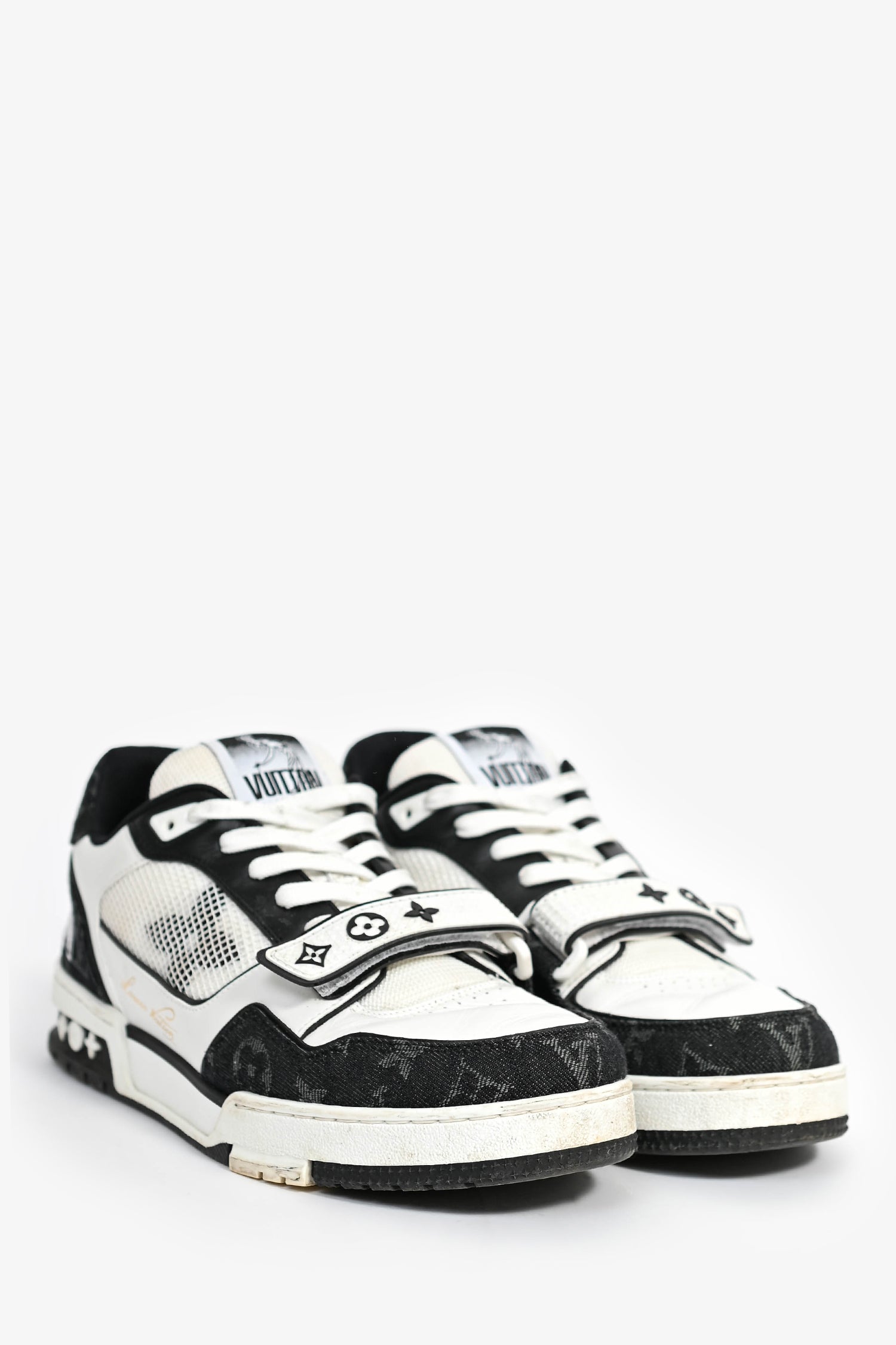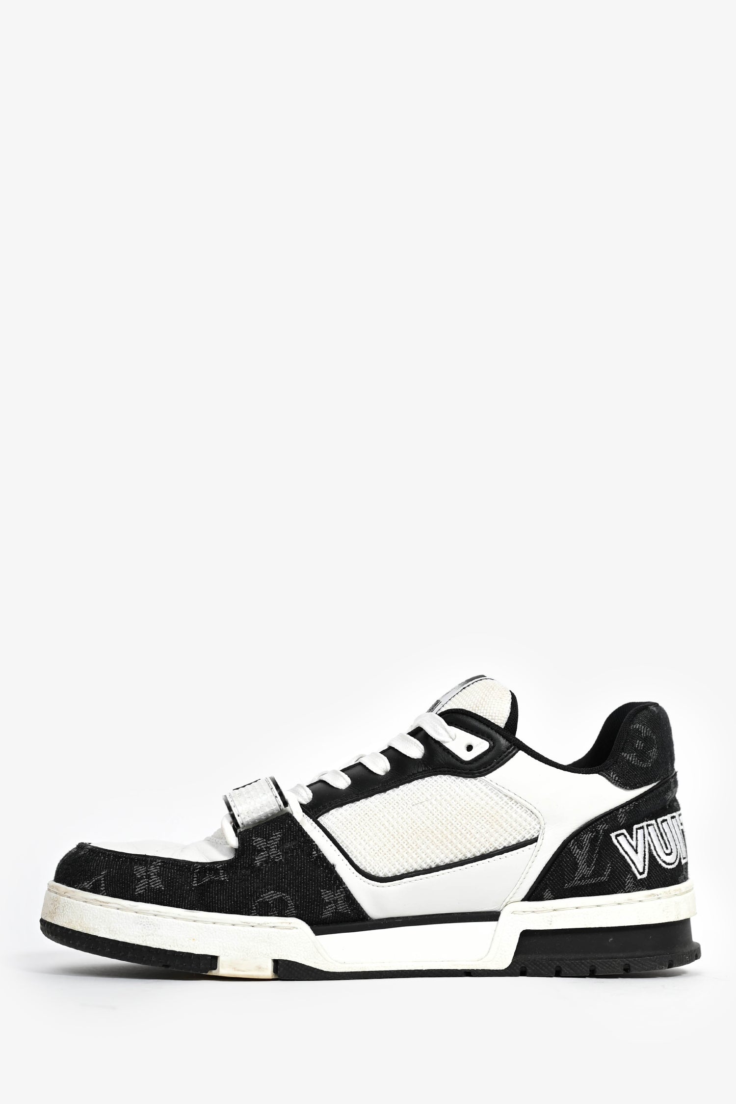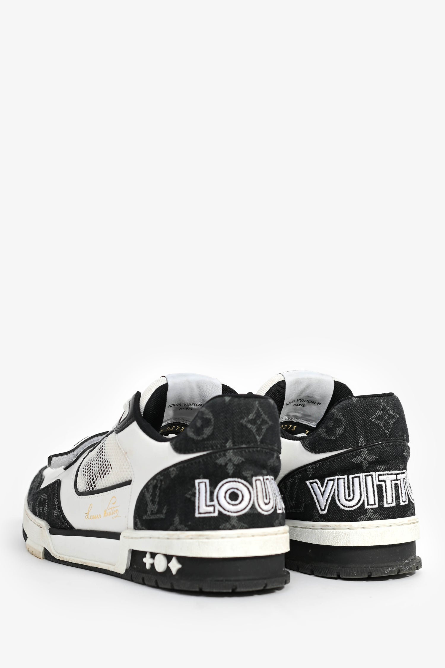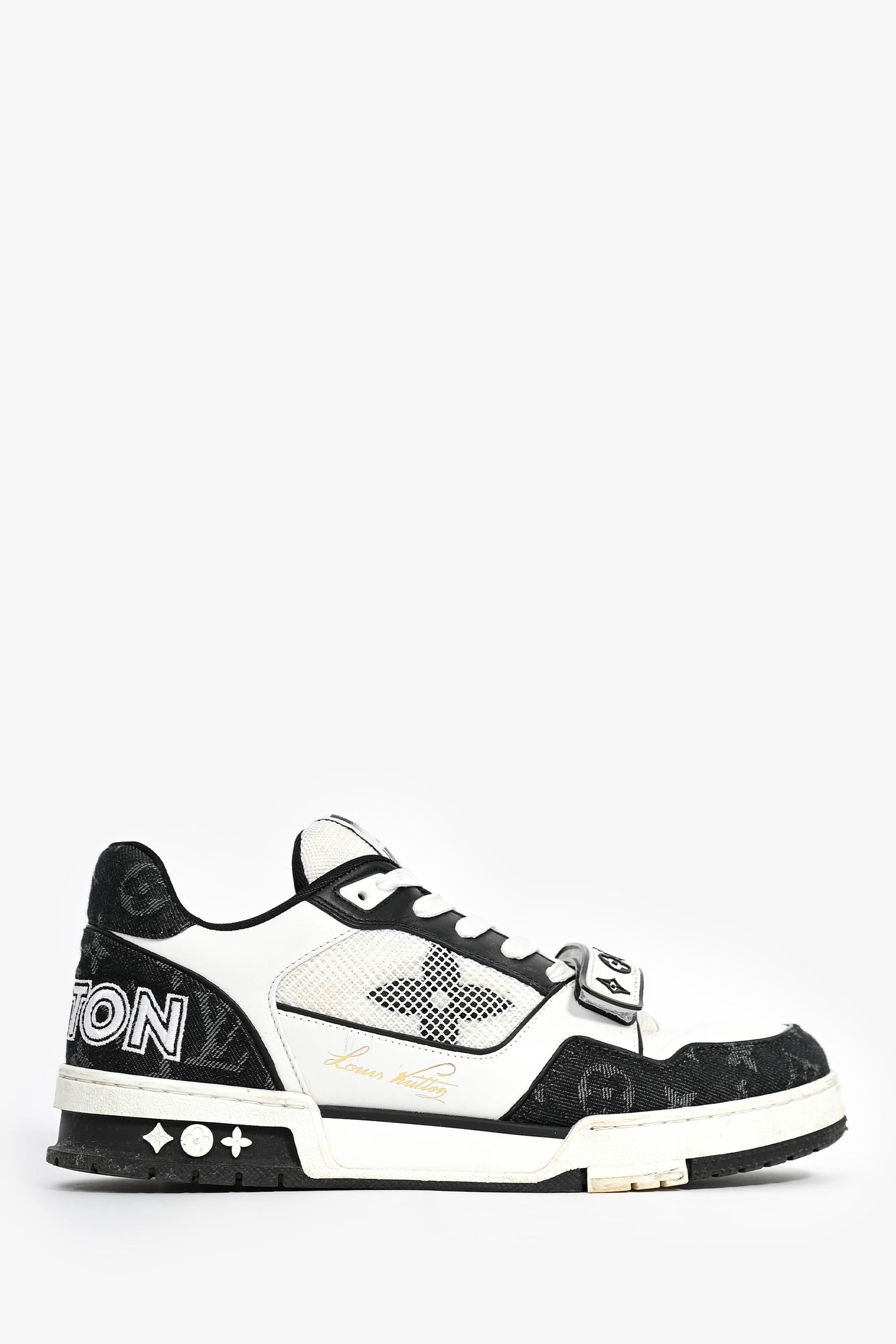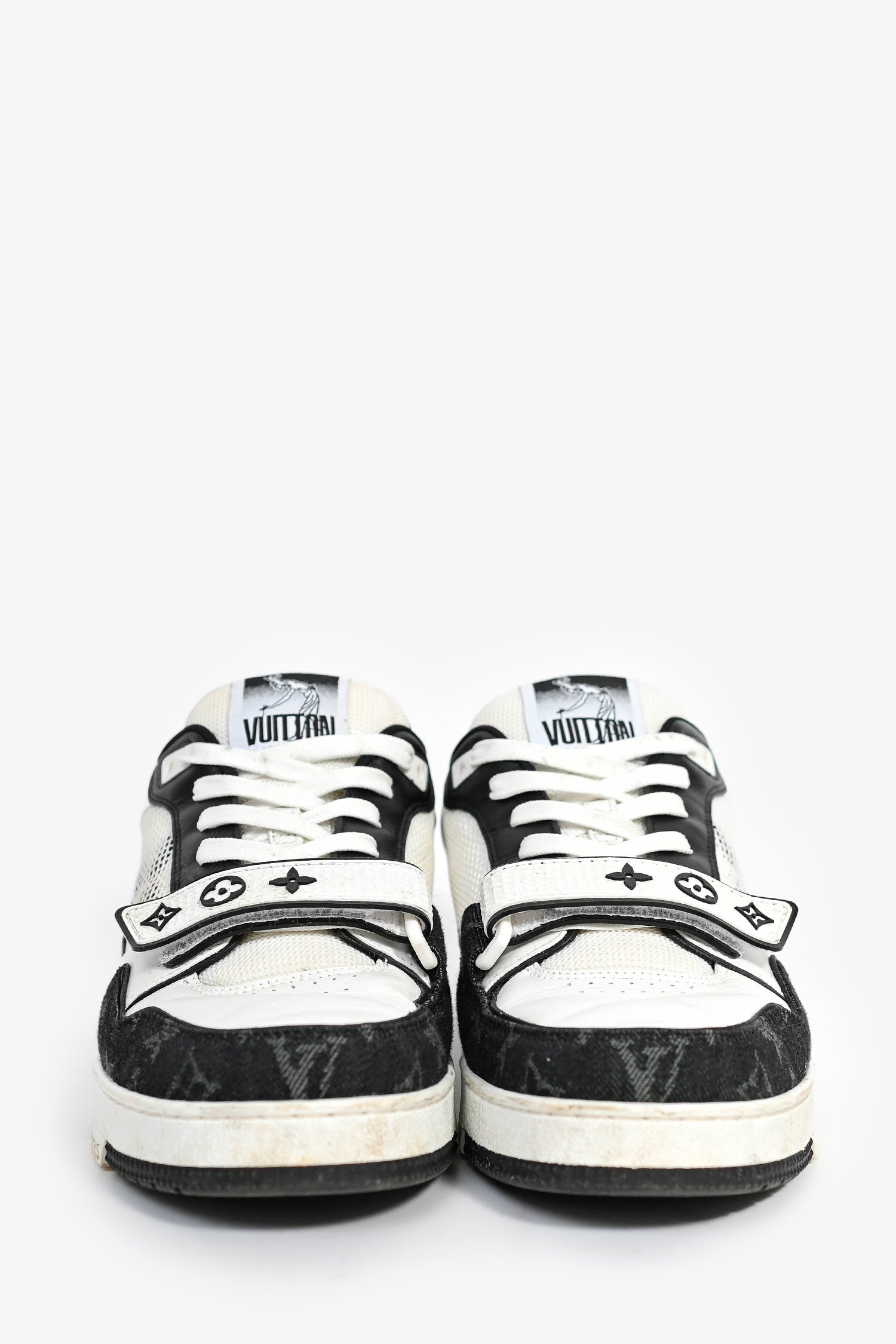 Refresh availabilityLouis Vuitton White/Black Leather Monogram Sneakers. Front laced closure. Denim monogrammed trim. White leather trimming. Rounded toe. Rubber soles. Textile interior. Tonal stitching.