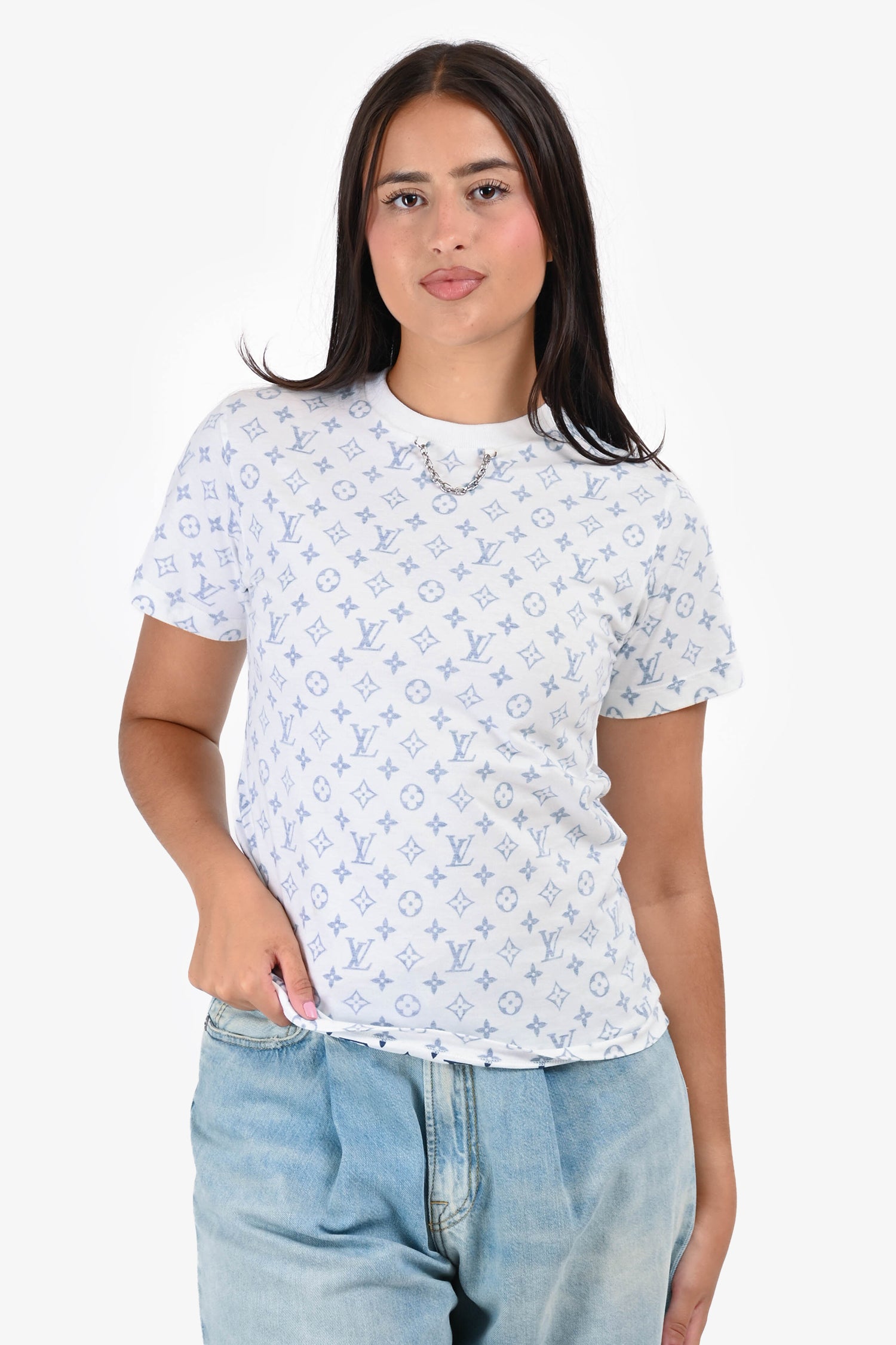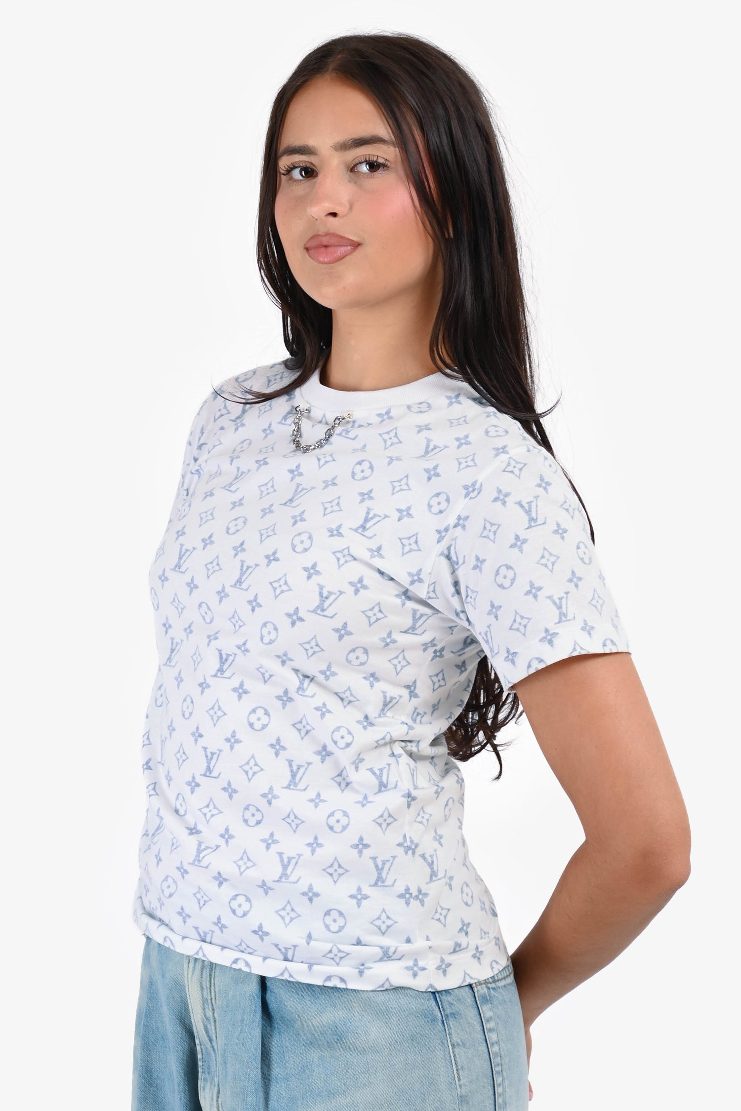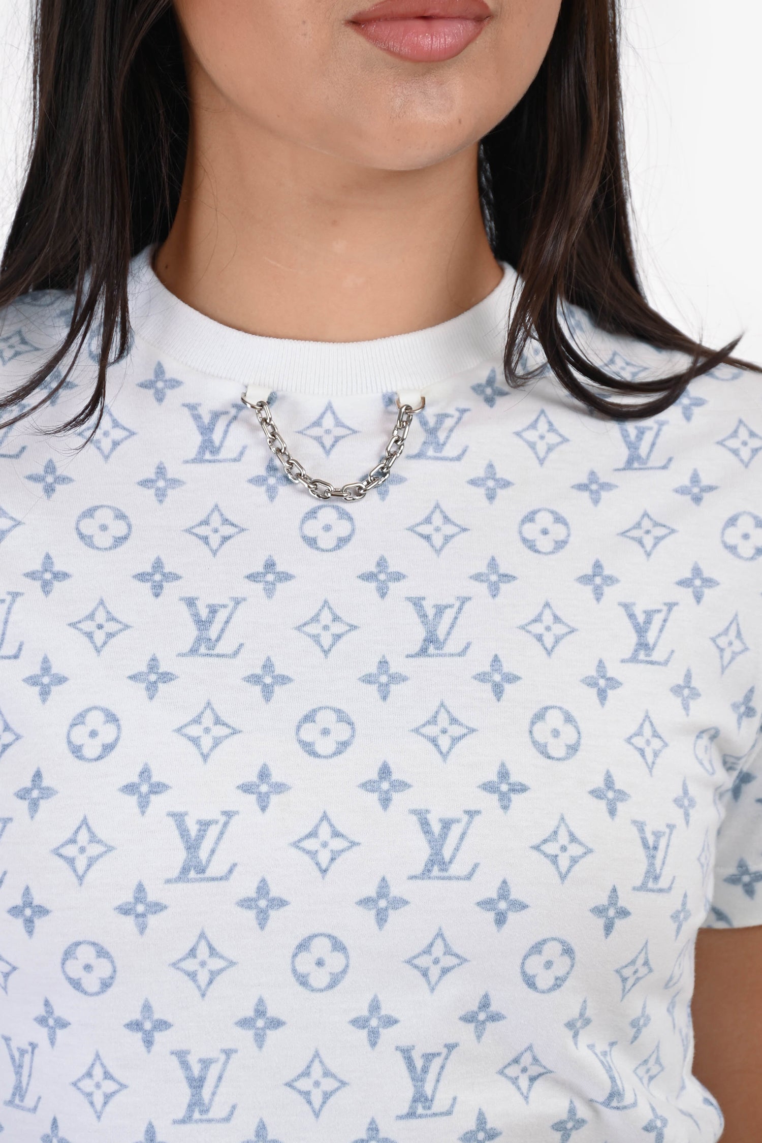Refresh availabilityLouis Vuitton White/Blue Cotton Monogram Chain Link Shirt. Ribbed collar. Chain-link collar detail. Short sleeves. Tonal stitching.