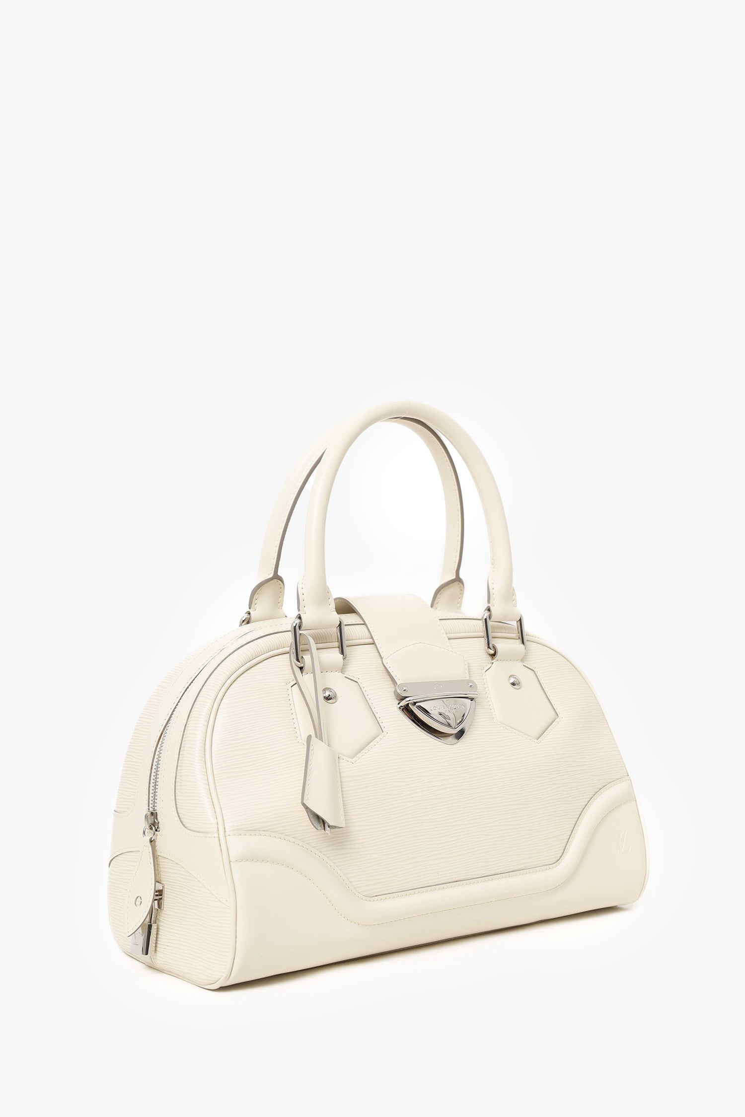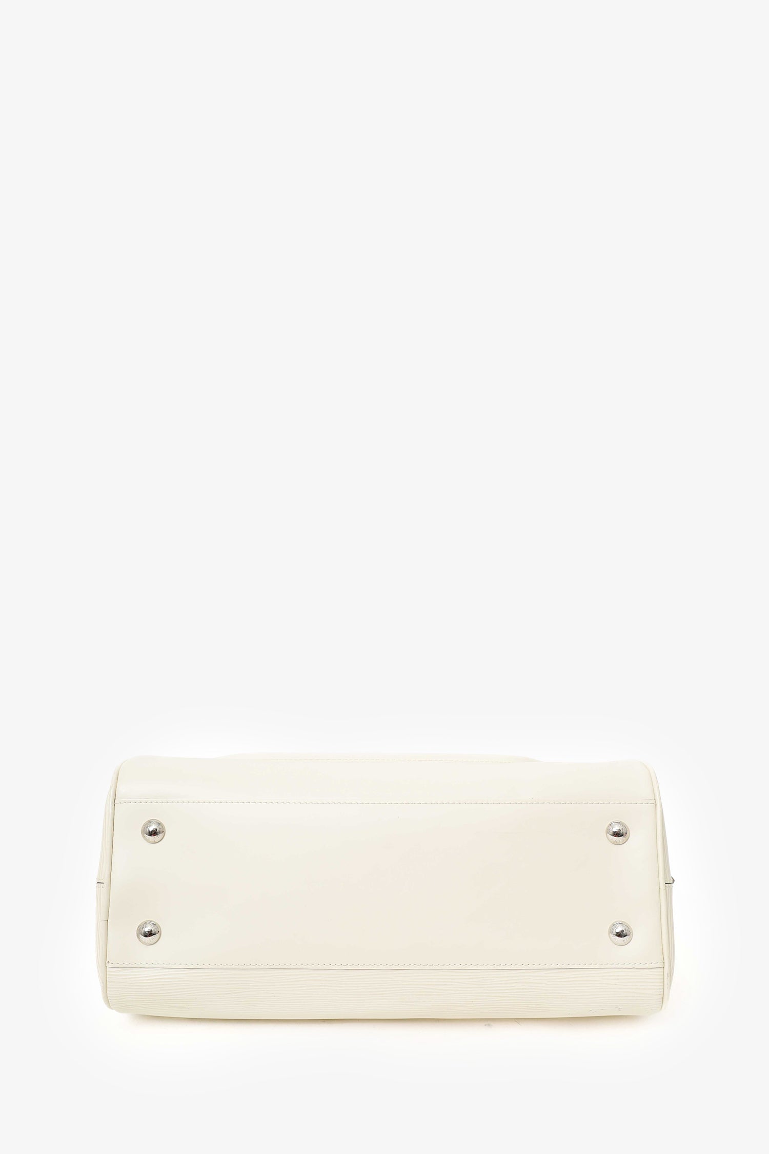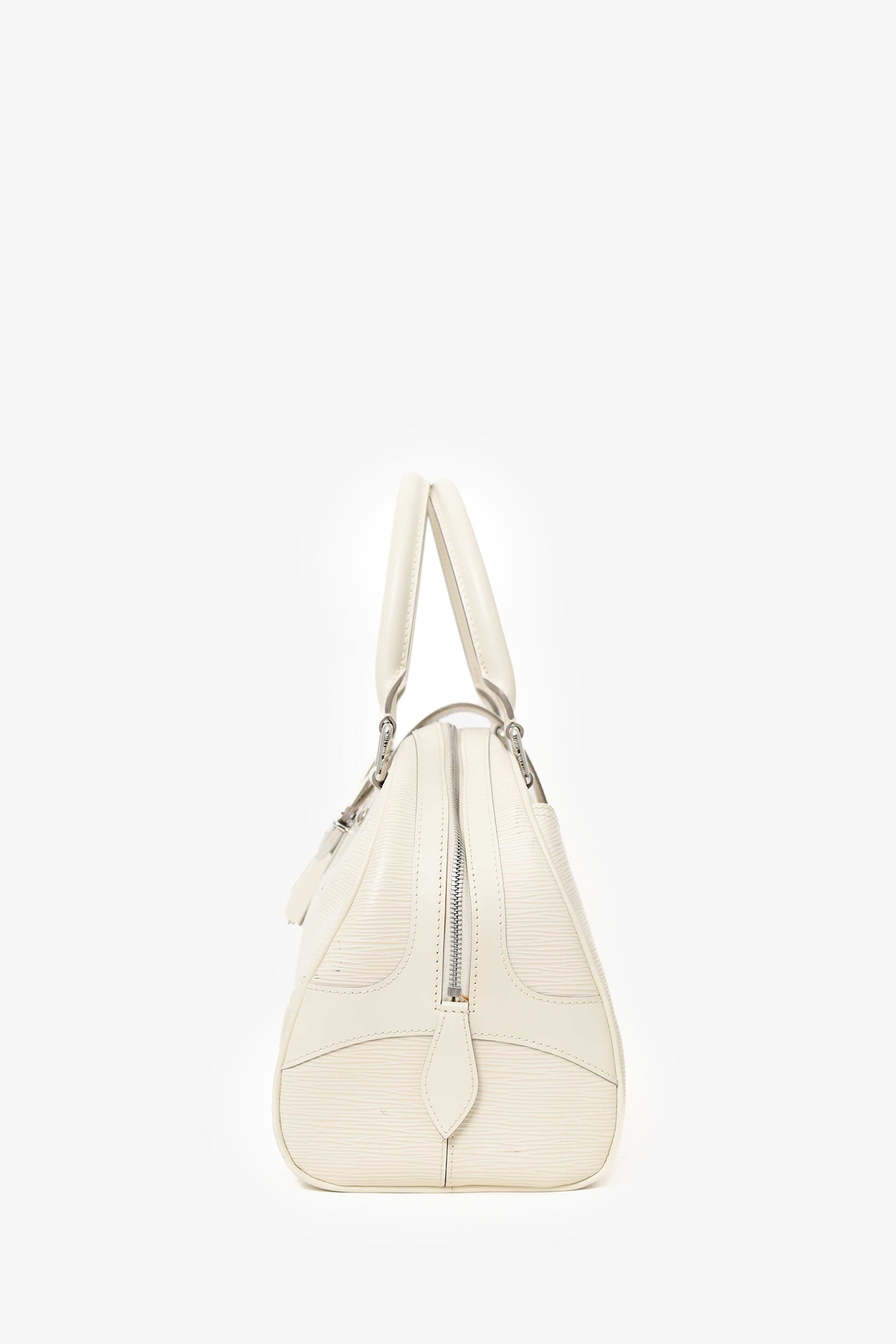 Refresh availabilityLouis Vuitton White Epi Montaigne GM Bowling Bag. Top zip closure with lock. Top fold-over piece. Twin handles. Single rear exterior slip pocket. Protective base studs. Lined interior. 2 interior slip pockets. Silver-tone hardware. Tonal stitching.