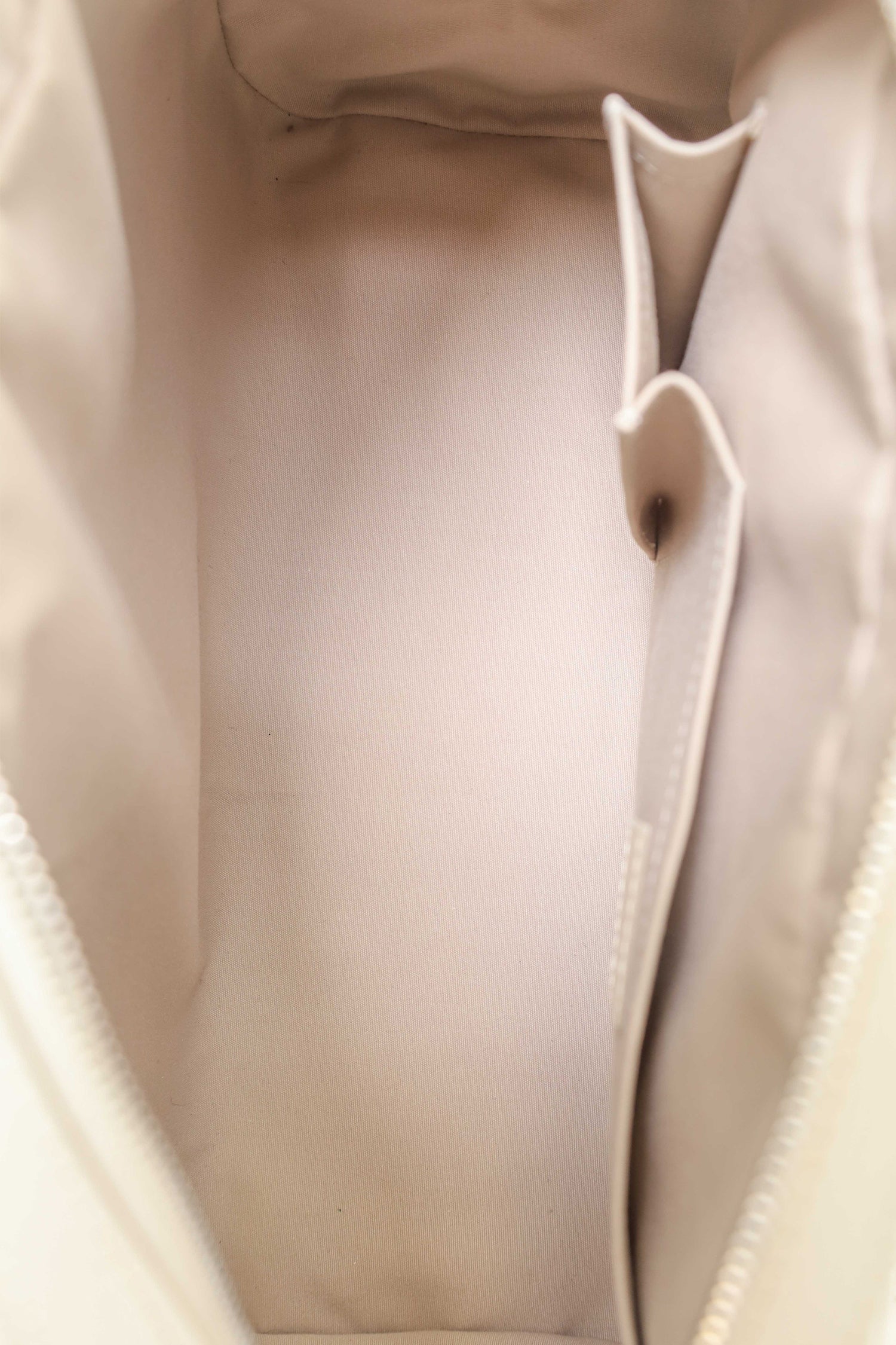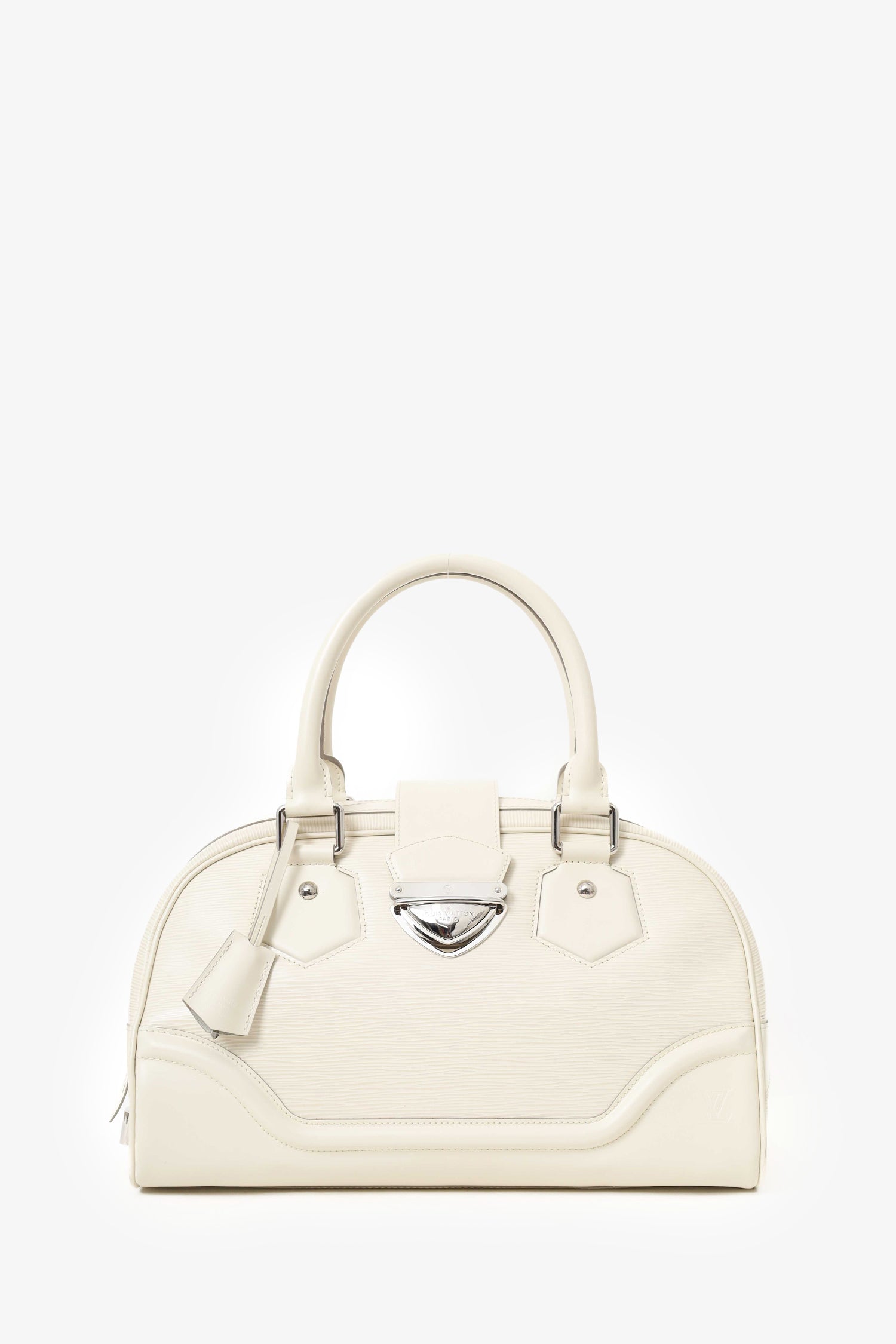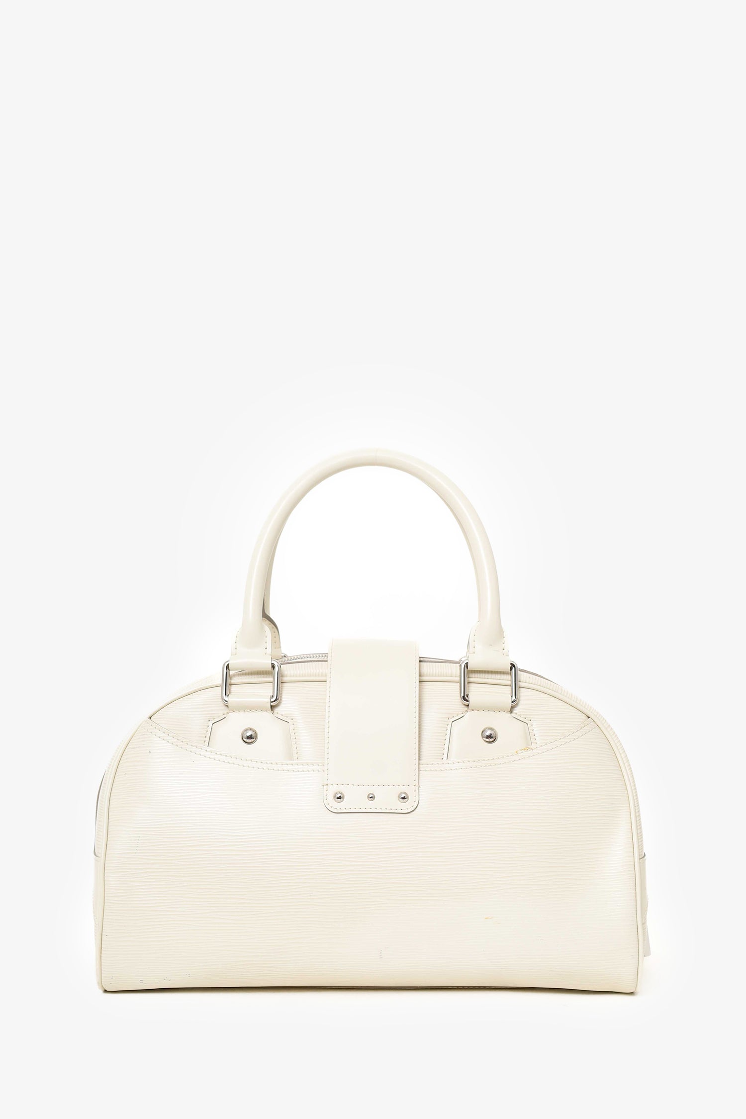 Refresh availabilityLouis Vuitton White Epi Montaigne GM Bowling Bag. Top zip closure with lock. Top fold-over piece. Twin handles. Single rear exterior slip pocket. Protective base studs. Lined interior. 2 interior slip pockets. Silver-tone hardware. Tonal stitching.