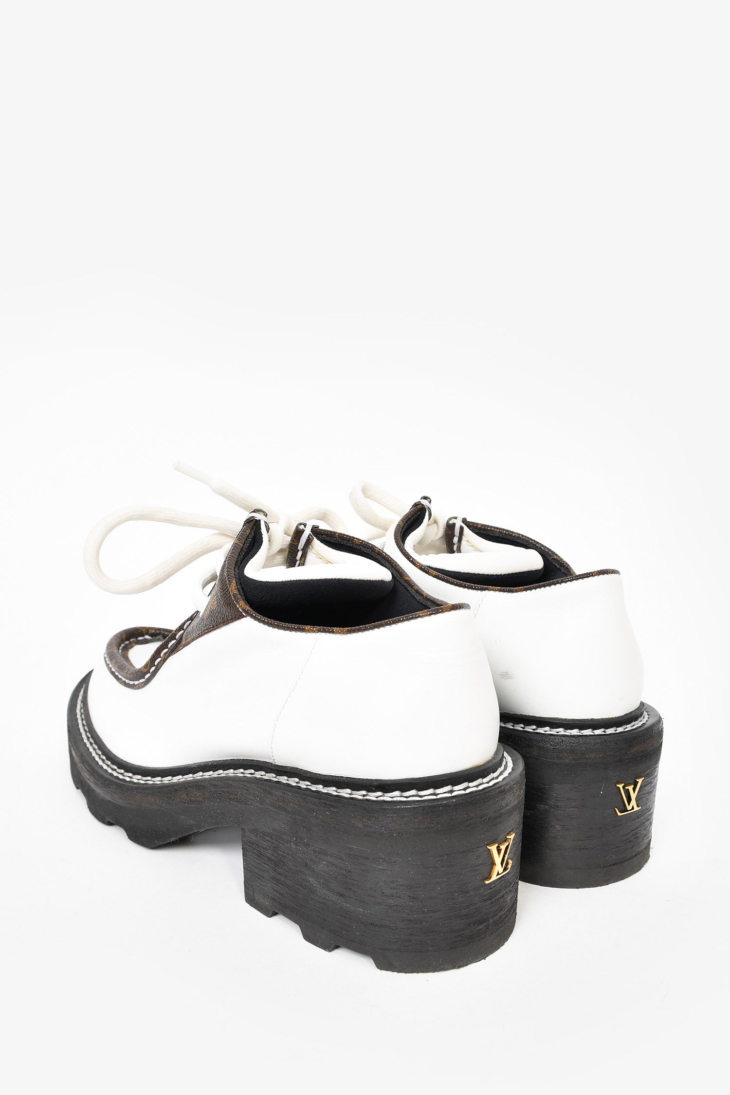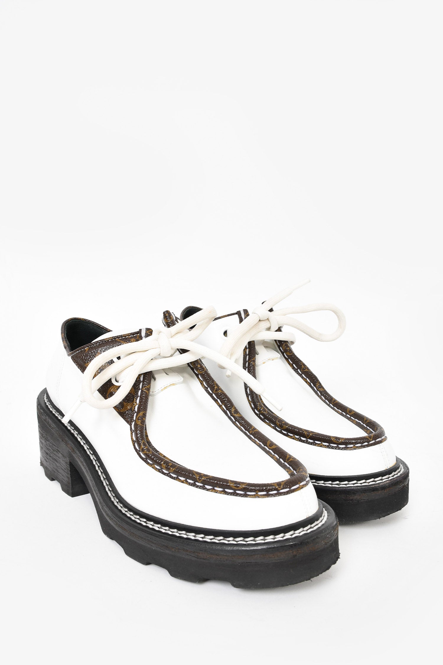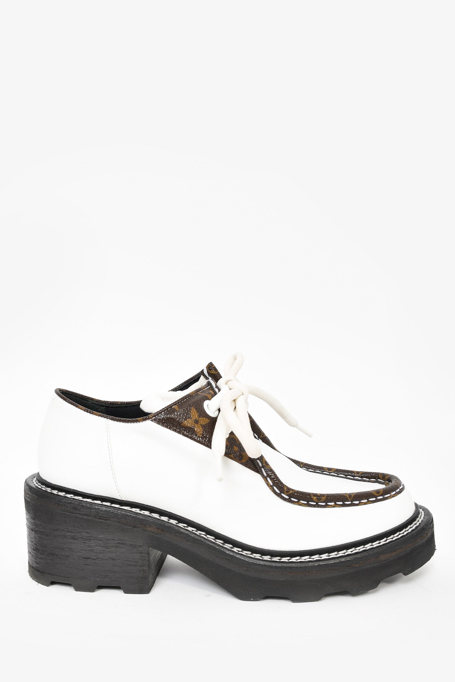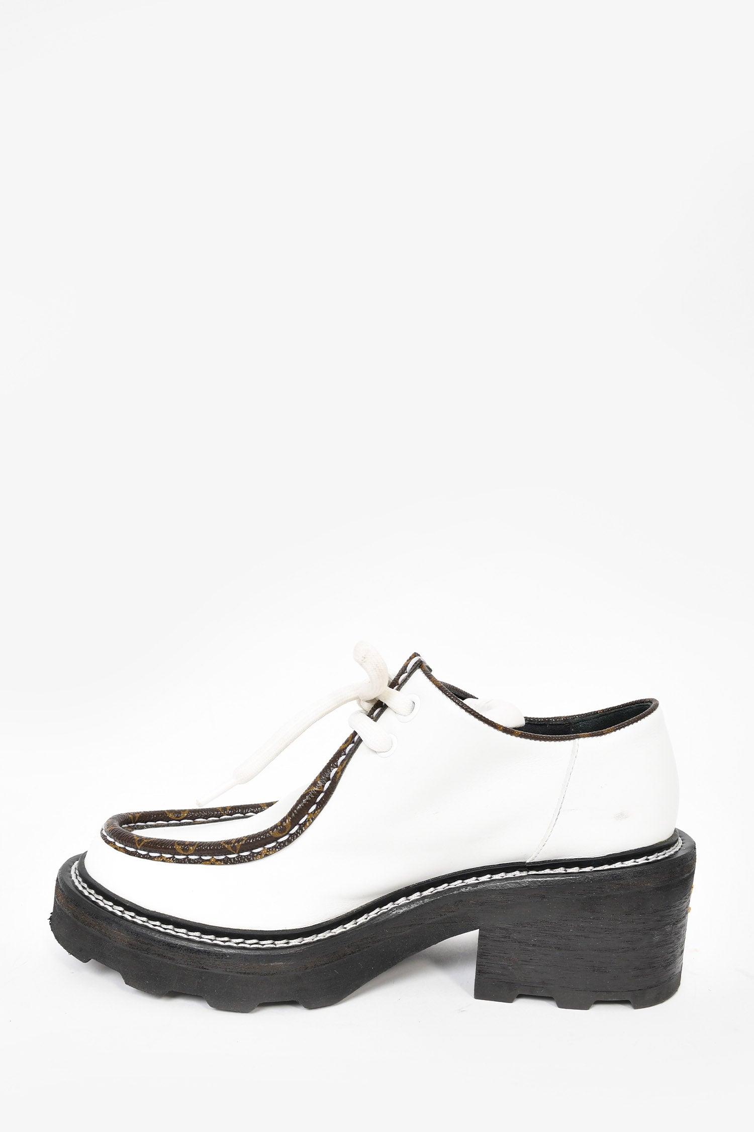 Refresh availabilityLouis Vuitton White Leather Monogram Trimmed "Derby" Platform Oxfords. Round toe. Lace-up closure. "LV" emblem at the rear. Tonal stitching.