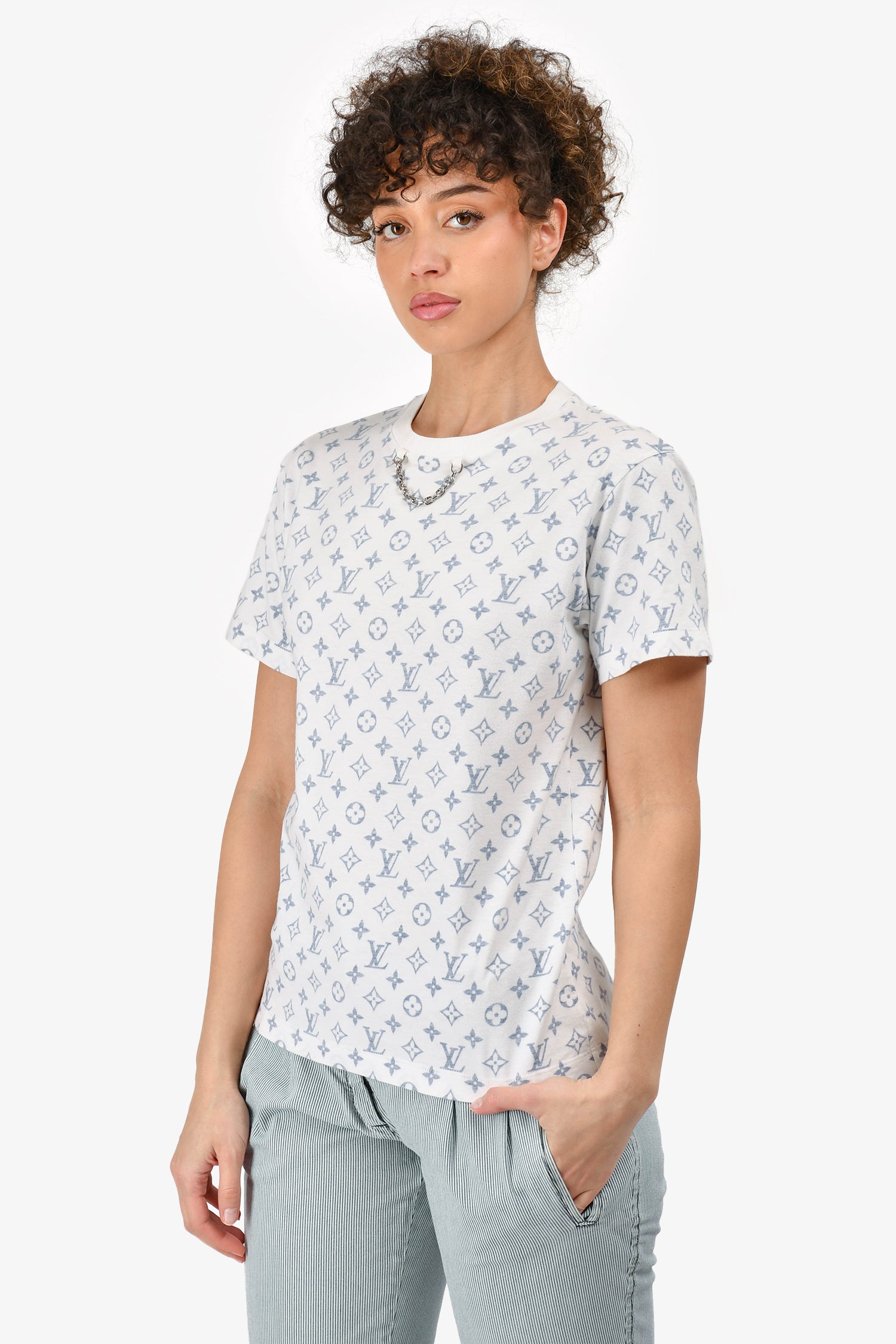 Refresh availabilityLouis Vuitton White/Monogram Cotton Short Sleeve T-Shirt with Chain Detail. Round neck. Ribbed neckline with chain detail. Tonal stitching.