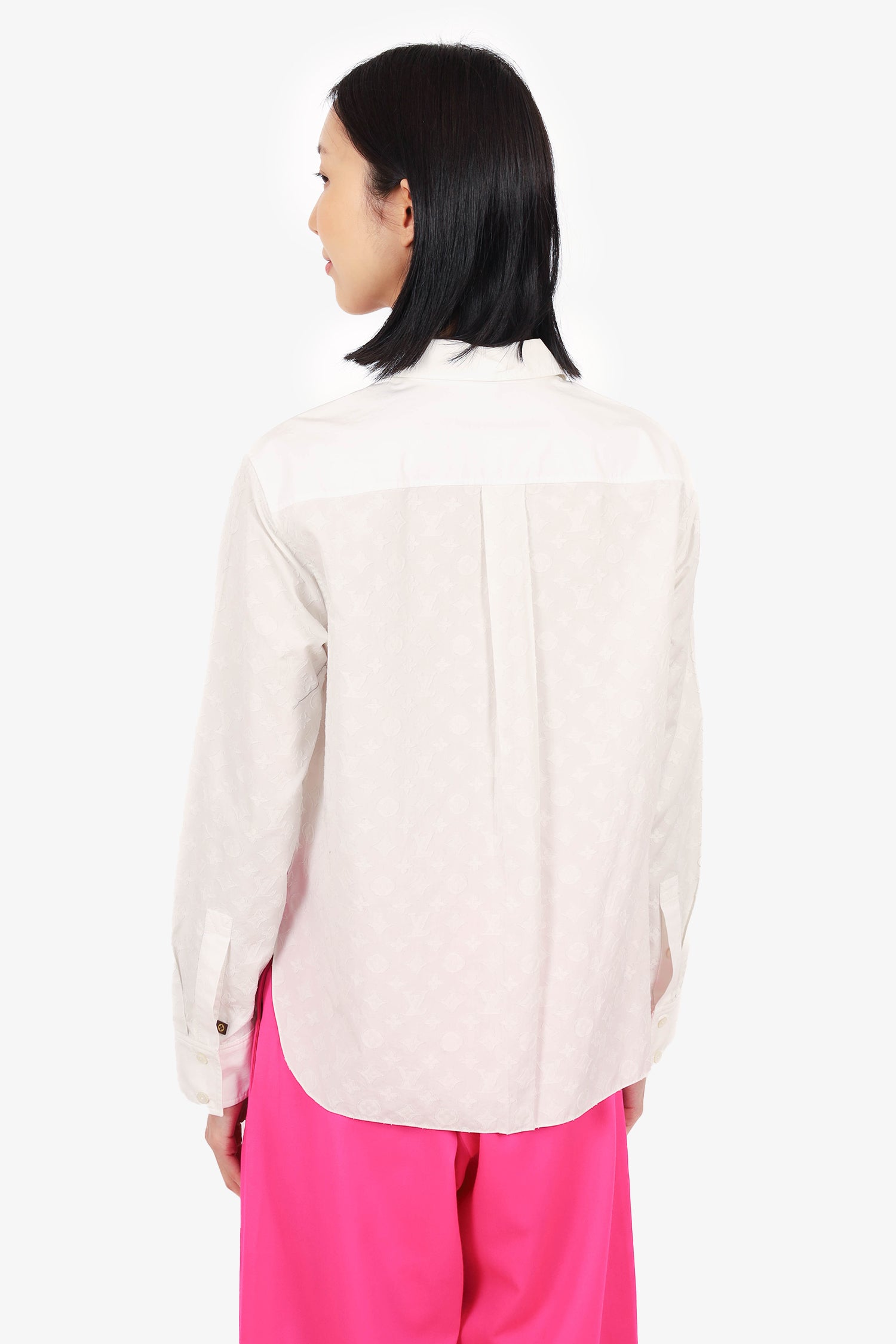 Refresh availabilityLouis Vuitton White Monogram Long-Sleeve Shirt. Collared neckline. Front button-up closure. Button-up sleeve cuff closure. Lace detail on rear and sleeves. Unlined. Tonal stitching.