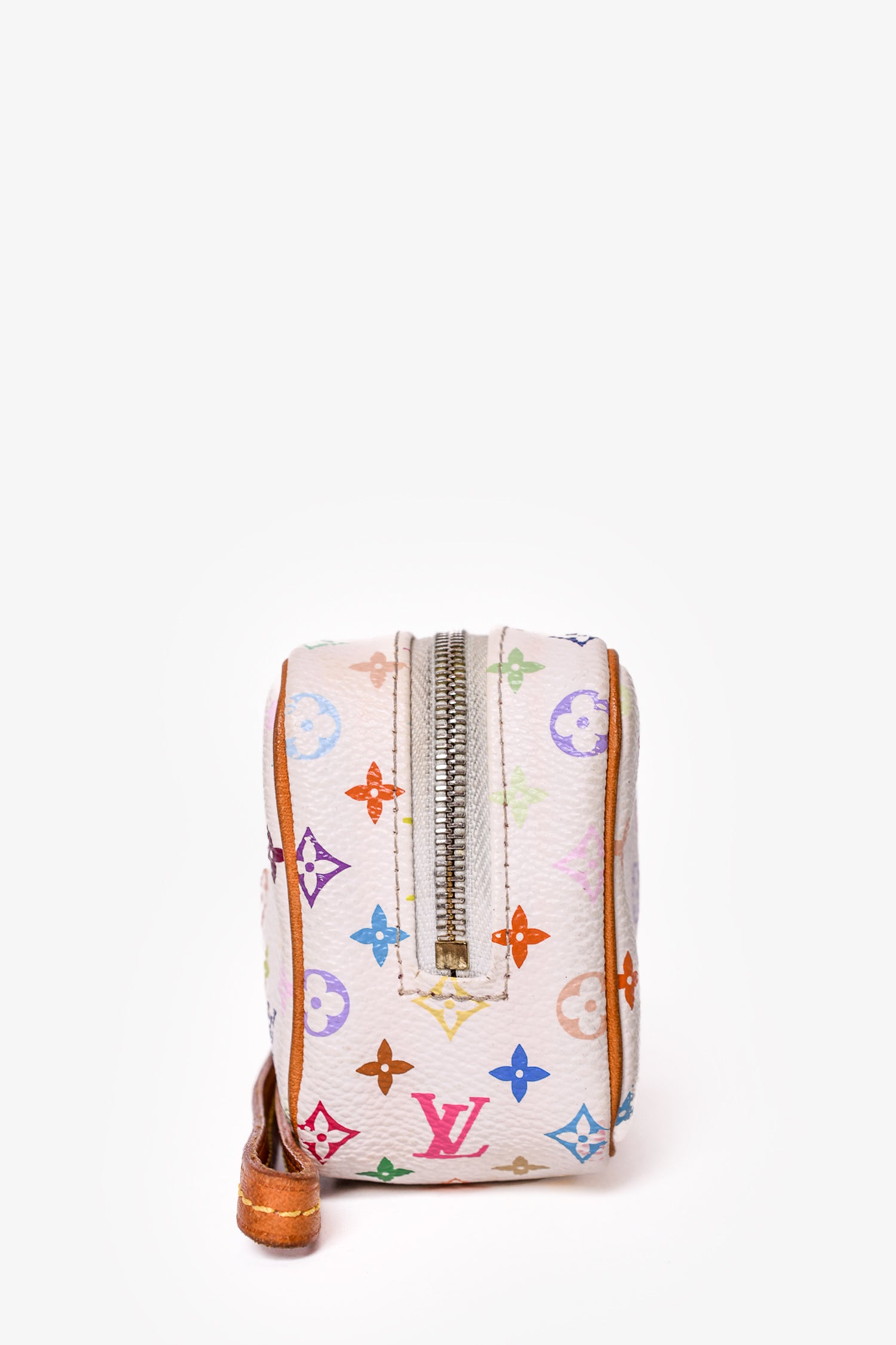 Louis Vuitton White Multicoloured Monogram Trousse Wapity Pouch with Wrist Strap. Top zipper closure. Single interior slip pocket. Re suede interior lining. Gold-toned hardware. Tonal stitching.