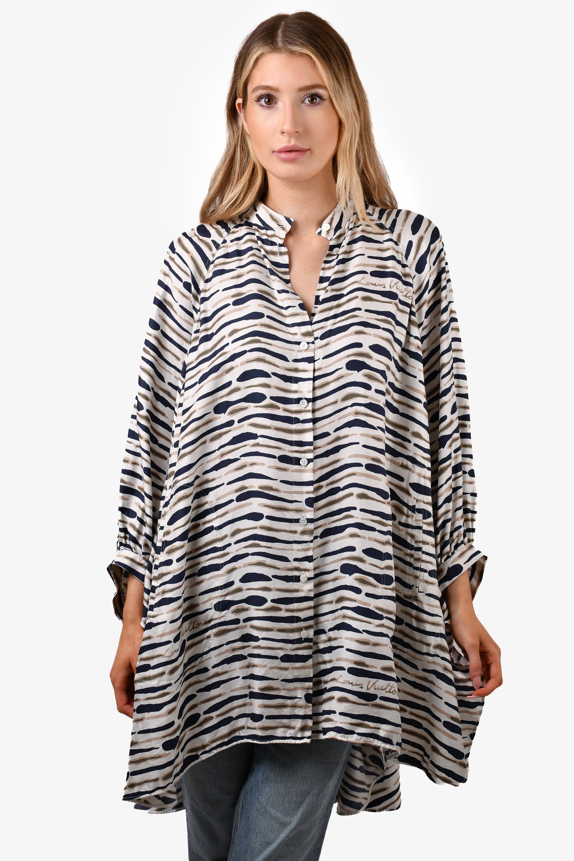Refresh availabilityLouis Vuitton White/Navy Zebra Printed Silk Tunic Top. Front button-up closure. Button closures on the cuffs. Tonal stitching.